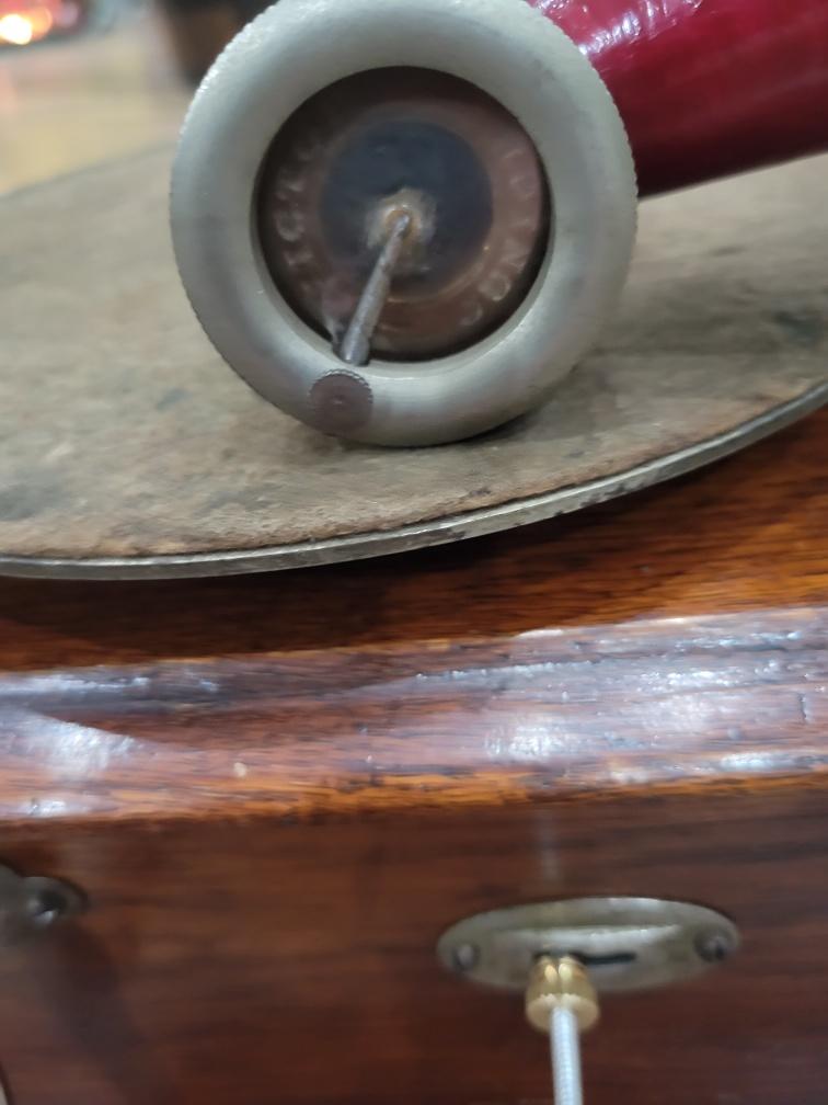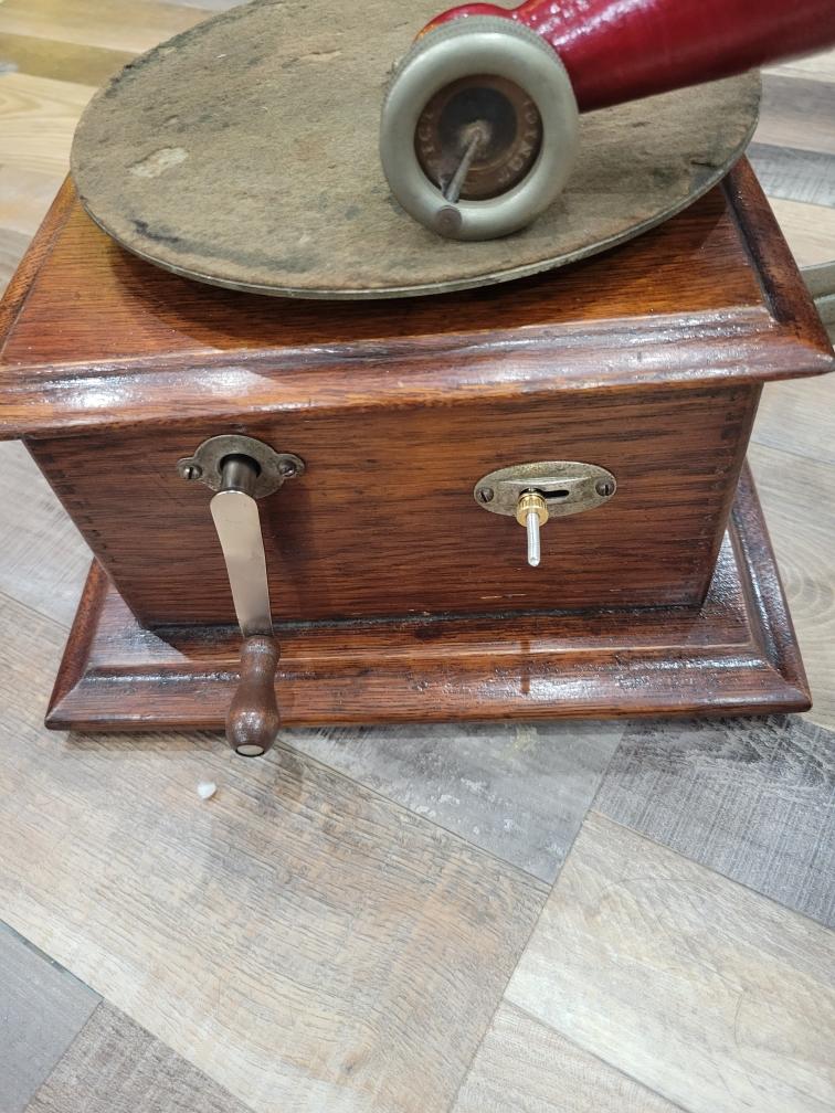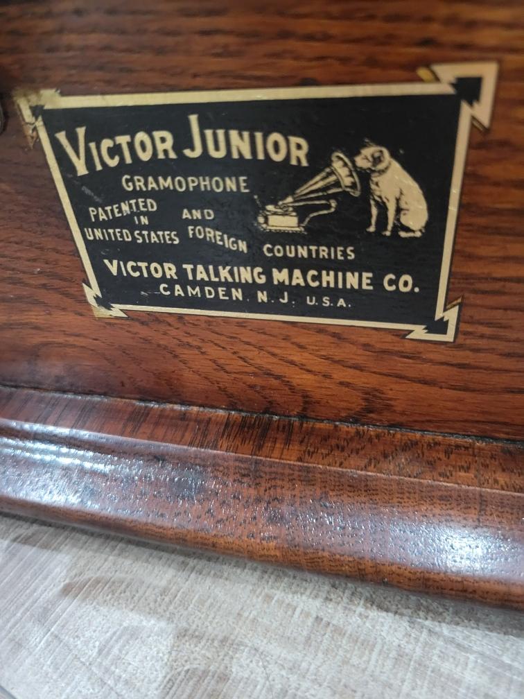 I am selling this hard to find Victor JR with an original Victor JR reproducer and original red petal horn. The paint was off of the elbow, and I did repainted it. Original finish. The crank and decal are quality reproductions. The speed control was missing when I received this machine. I did make a new threaded speed control rod and found a knurled nut that works. I have a more exact nut ordered from Great Britian which I will include when it arrives. 1295.00+ 50 shipping.