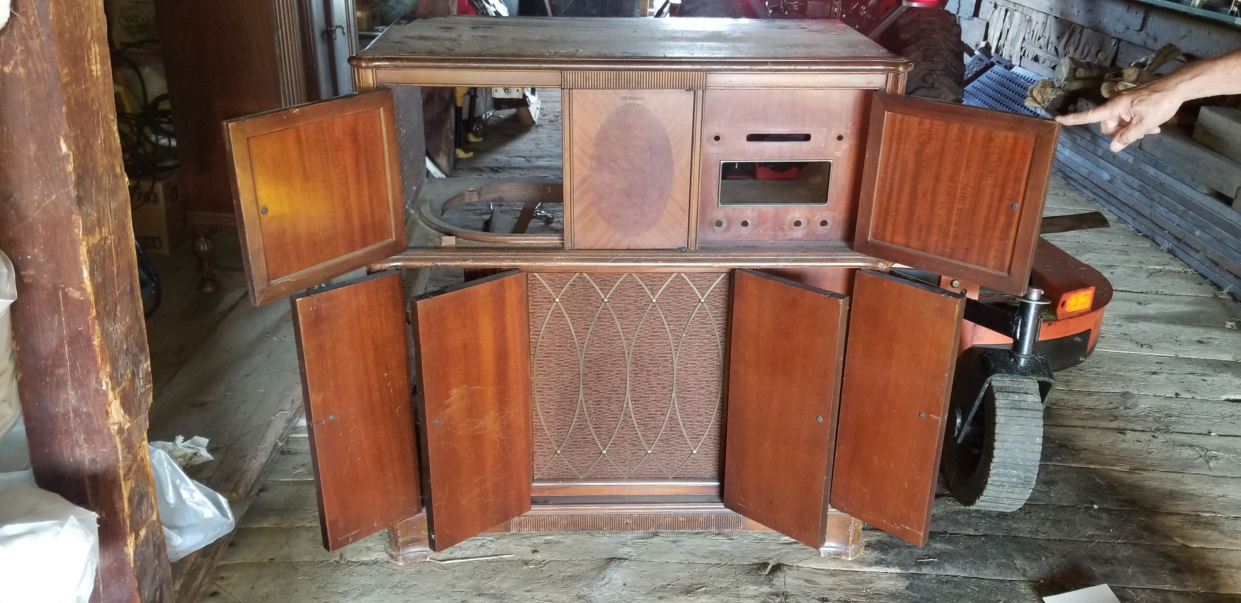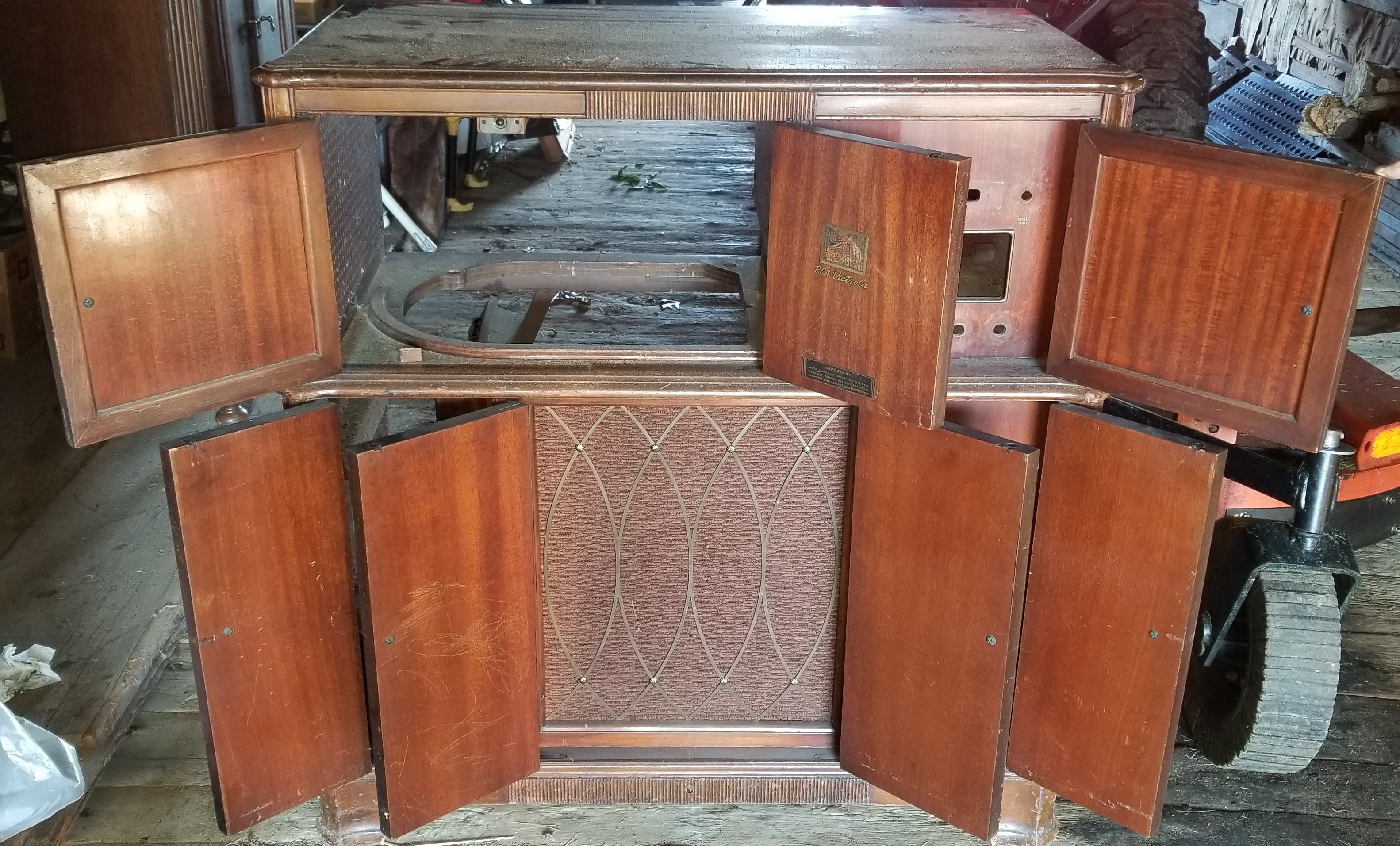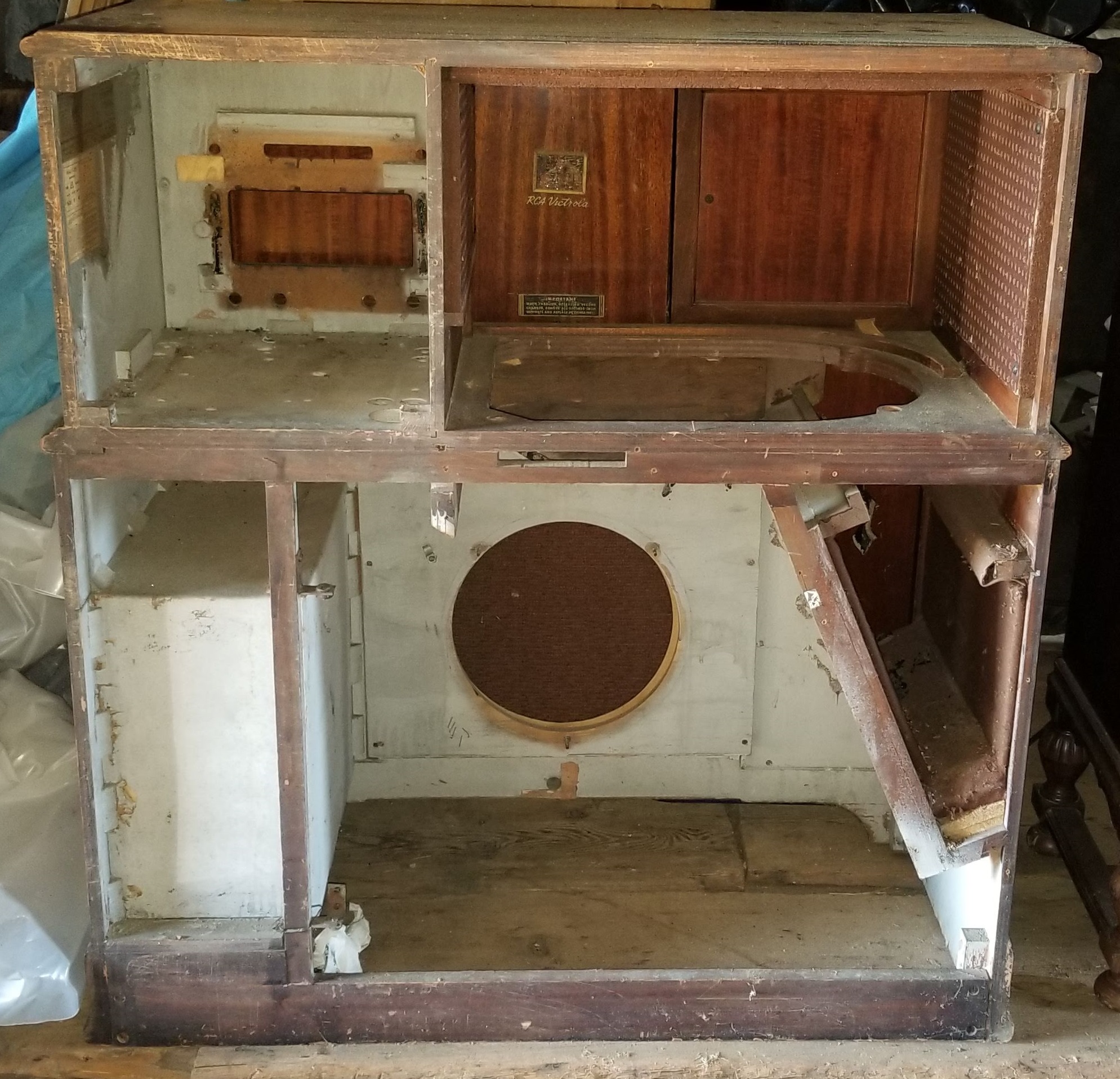 I have an empty cabinet for a 1941 RCA Model V-225 radio/phonograph, the one with the legendary changer that played both sides of a record without turning it over. It's complete (including all the door pulls) and in nice, all-original condition. (See pictures.) If you have one that you're hoping to restore but its cabinet is rough (or beyond salvation), this could be a good opportunity for you; I've never seen another in any condition one for sale anywhere, at any price.