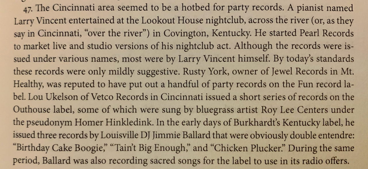 "The auction stash also included party records distributed by Pearl Records, and recorded by the Pearl Trio and songwriter Larry Vincent, one of the company’s owners. Vincent had recorded for several labels and performed at clubs before settling in for five years at the Lookout House in Kentucky in 1942. His company, which he co-founded in 1946, produced both party and non-party records.
