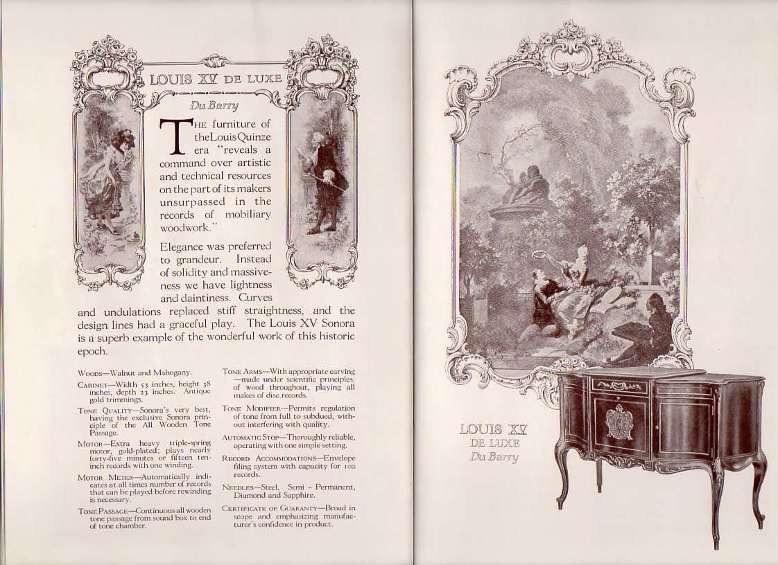 Starting in the mid-teens, there was a general fad (among Americans at least) for "period furniture," and the phonograph companies were quick to offer cabinets that emulated the designs of certain famous cabinet makers (such as Chippendale or Sheraton) and historical periods (such as Louis XV). Sonora referred to its high-end historical cabinet models as "Periods." I have attached scans from Sonora's 1922 "Periods" catalog which shows your model.