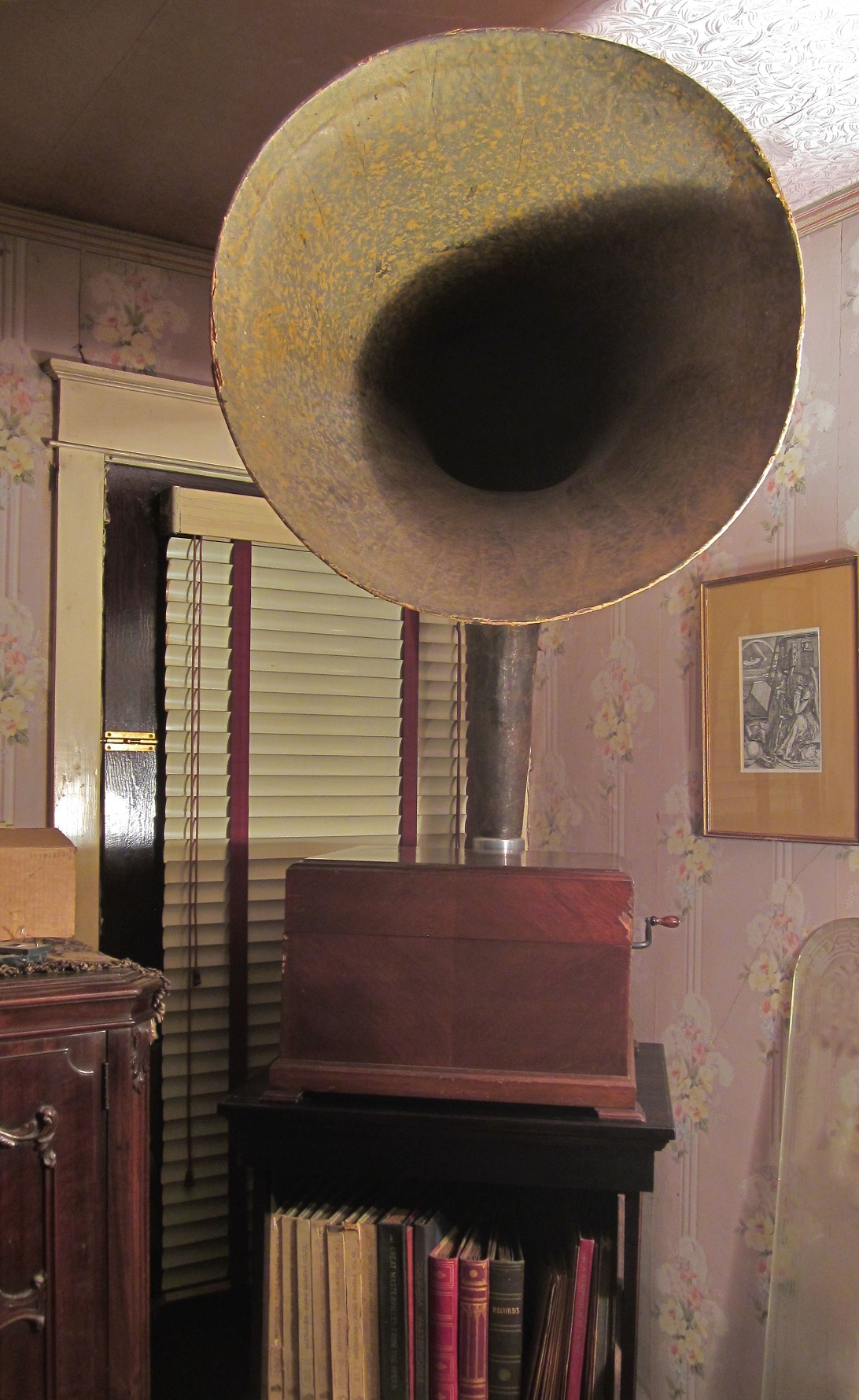 Both the speaker and the Expert Senior gramophone turned up together at a rural outdoor flea market in (I think) 1989. It occurs to me now what a bizarre photo op the sight of two Expert horns towering over everything else in such an unlikely setting was, but I must have been so intent on getting money out of my pocket that the photograph was never taken.