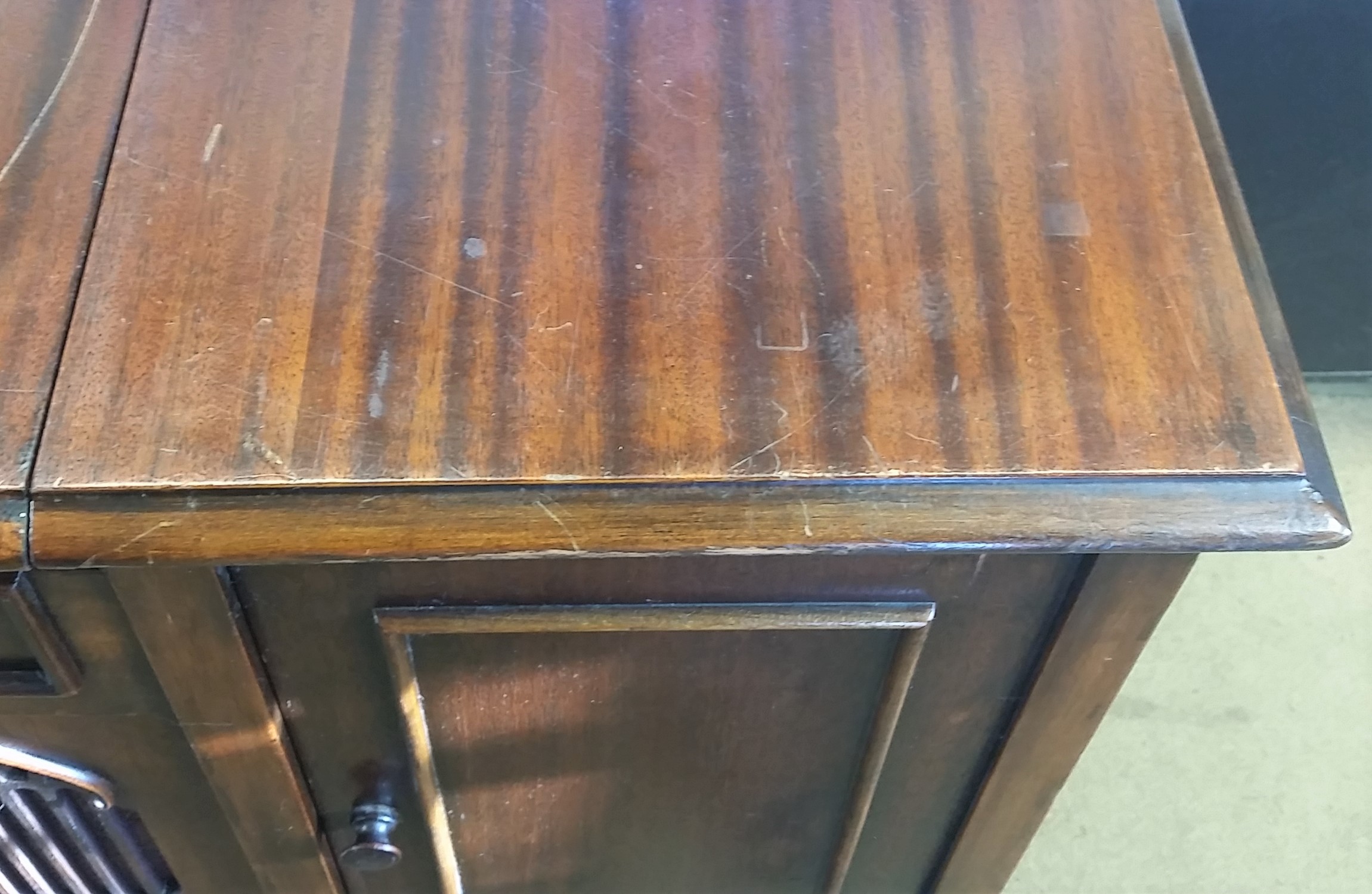 There were many dents, dinks and scratches all over the place but the veneer was all there and tight. I can see that the best course of action was to break the cabinet down and work on it a piece at a time. It took about a month to strip each piece and sand them down to be ready for stain.