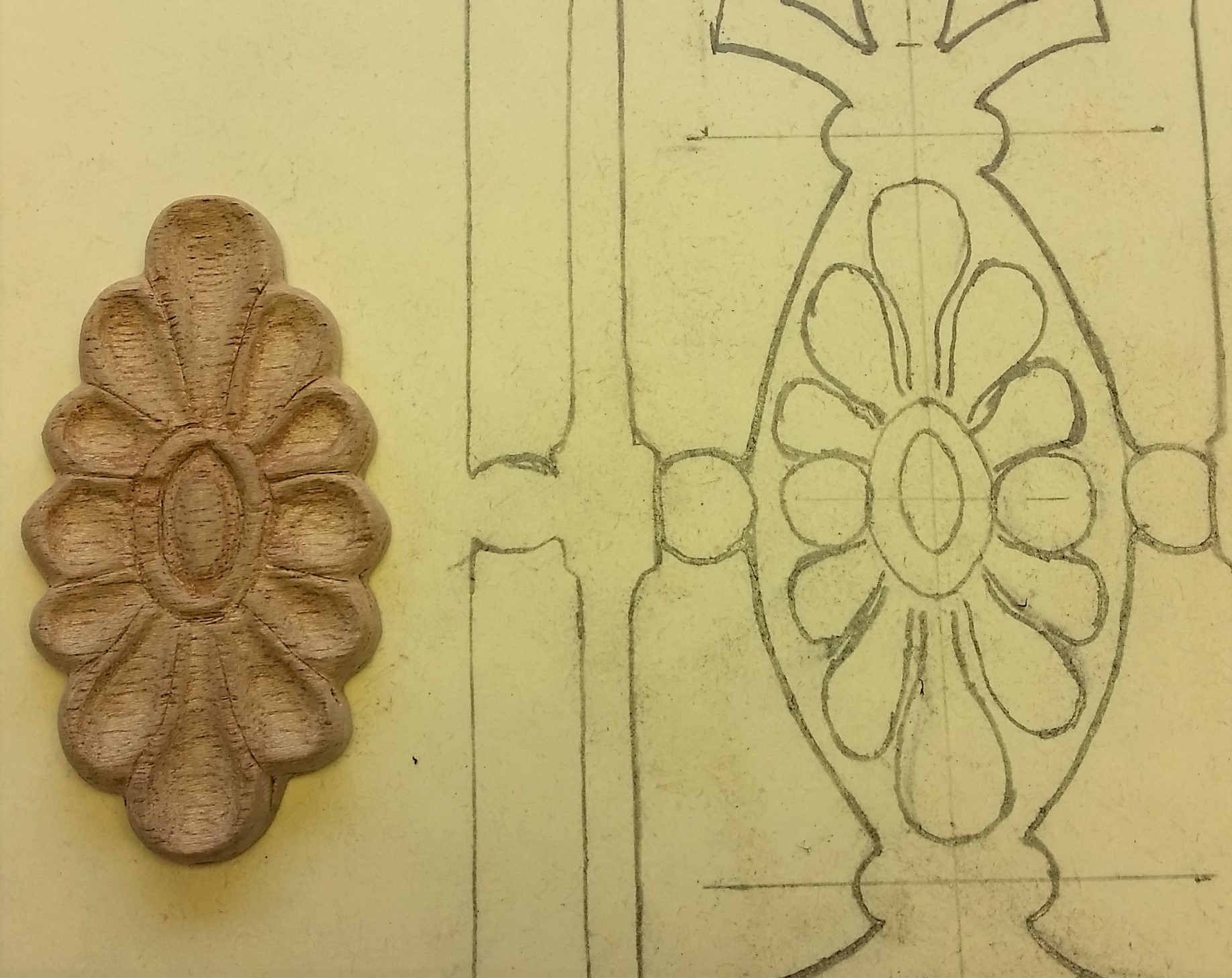 Next the rosette, I got it shaped out using carving chisels and it is ready to sand down.