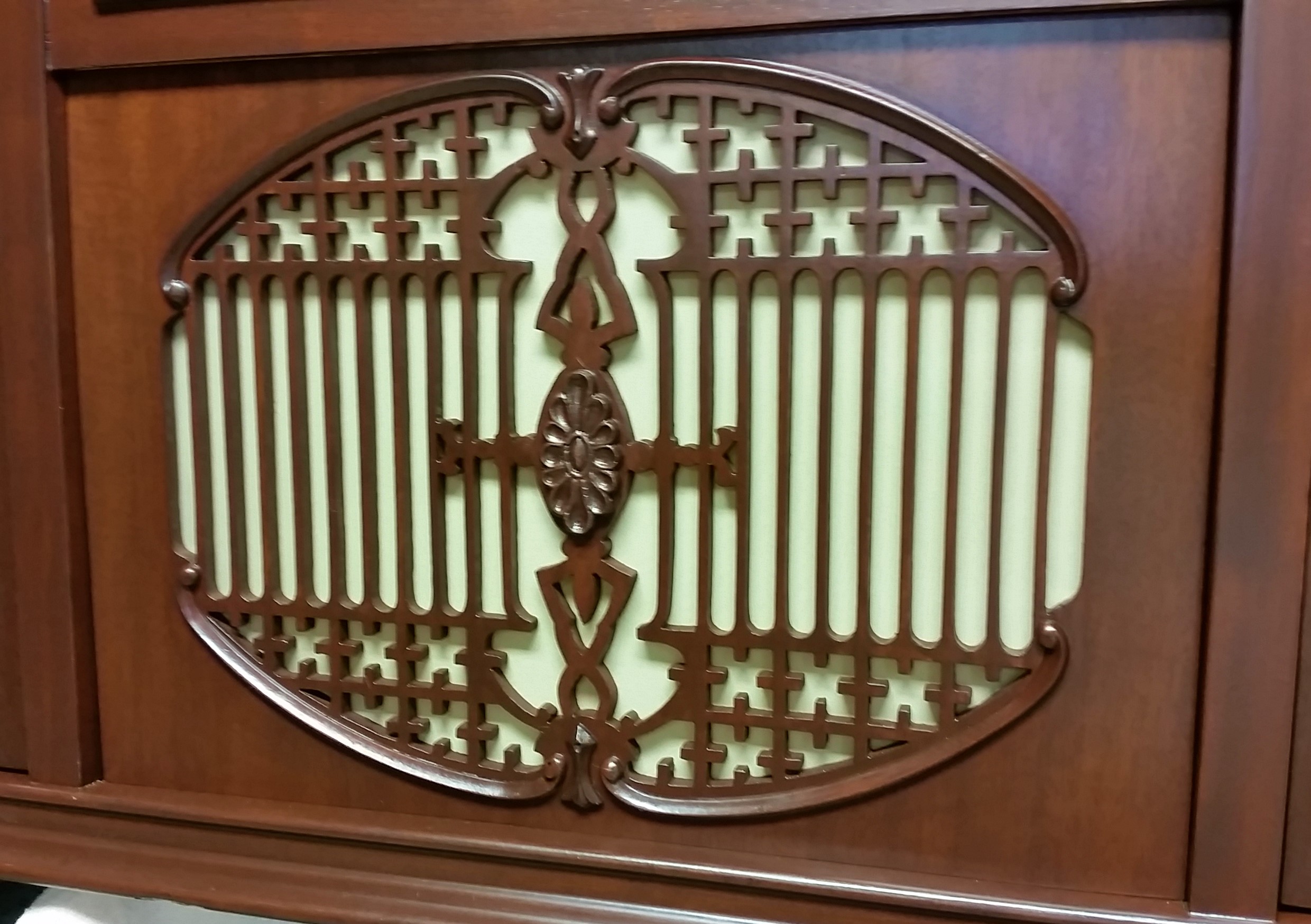 Well I have been working on my Stratford for 2 ½ months. The majority of that time on the console cabinet. The machine was complete except for the center of the horn grill and the disc folders were missing. Someone had attempted to refinish the outside of the console but probably got in over their head sometime in the past, only working on the front, sides and top. It had striper runs down the back and a couple runs down the inside of the play area.