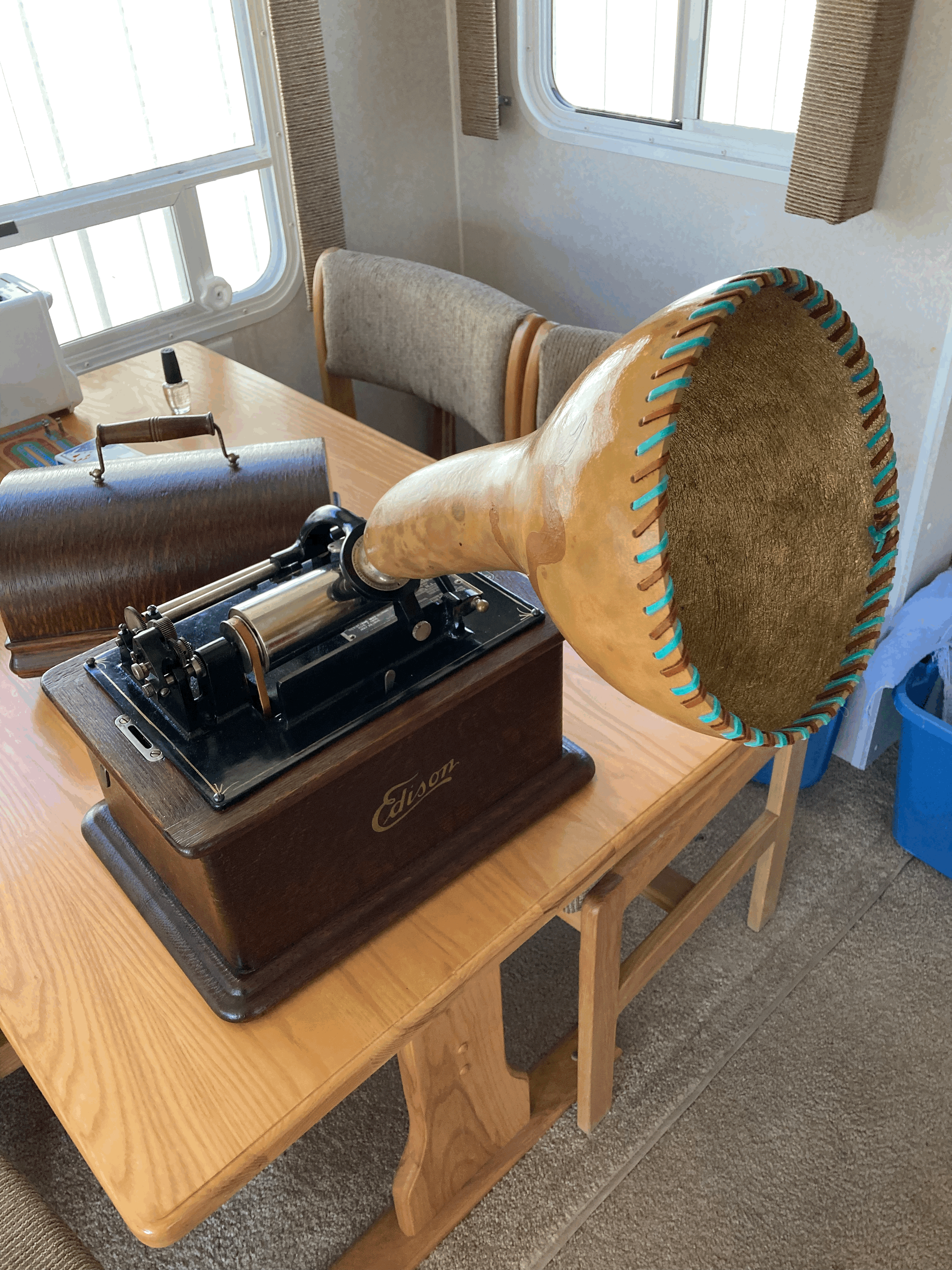 Feast your eyes on Gourd-O-Horn's newest creation. Our extensive staff of craftsmen and artists have combined talents to create the ultimate horn. It starts with a selection of one of nature's perfect gourds. The exterior is highly figured like an exotic hardwood and is finished in a clear lacquer to accentuate the natural beauty. Talented local artists were employed giving this horn an authentic Southwest flavor. The combination of nature's perfection and the best human efforts have resulted in the ultimate phonograph horn. :D ;) :shock: :? 8-) :lol: :roll: