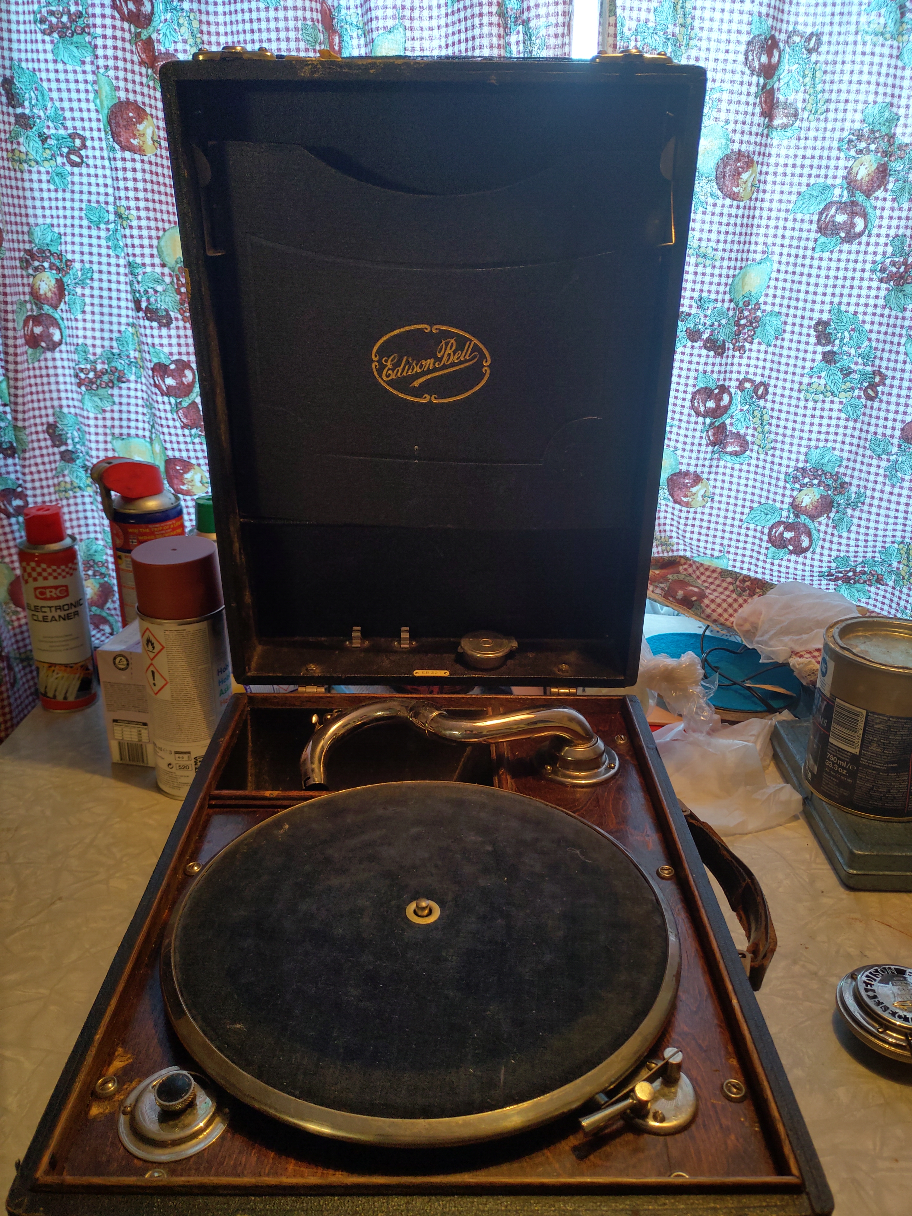 I picked it up for € 10 last evening in Oslo. I was visiting Oslo to see a gramophone friend, and saving this machine was an easy decision, even if my house and rented storage lockers..are full already. It is the first Edison Bell portable I have seen here, and the soundbox alone was worth the buy for me, really.