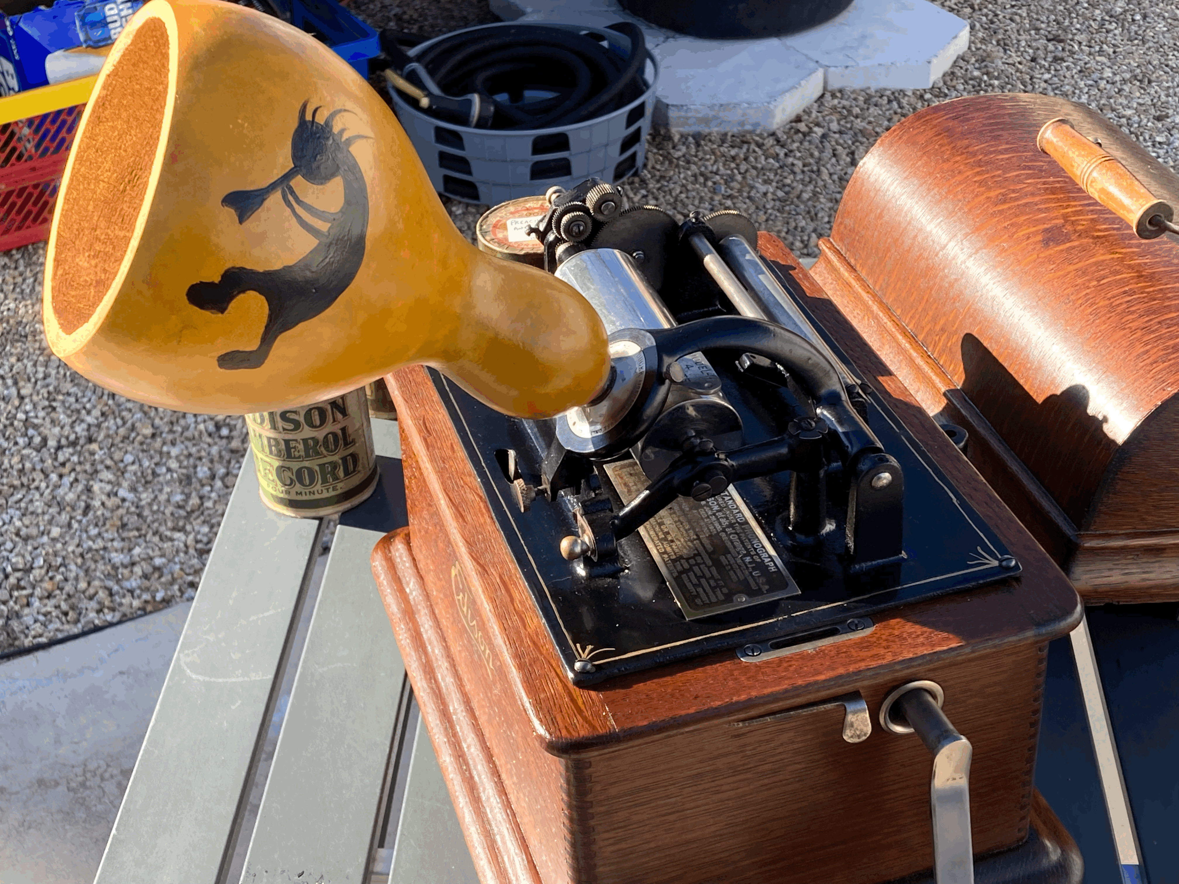 Feast your eyes on Gourd-O-Horn's newest creation. Our extensive staff of craftsmen and artists have combined talents to create the ultimate horn. It starts with a selection of one of nature's perfect gourds. The exterior is highly figured like an exotic hardwood and is finished in a clear lacquer to accentuate the natural beauty. Talented local artists were employed giving this horn an authentic Southwest flavor. The combination of nature's perfection and the best human efforts have resulted in the ultimate phonograph horn.