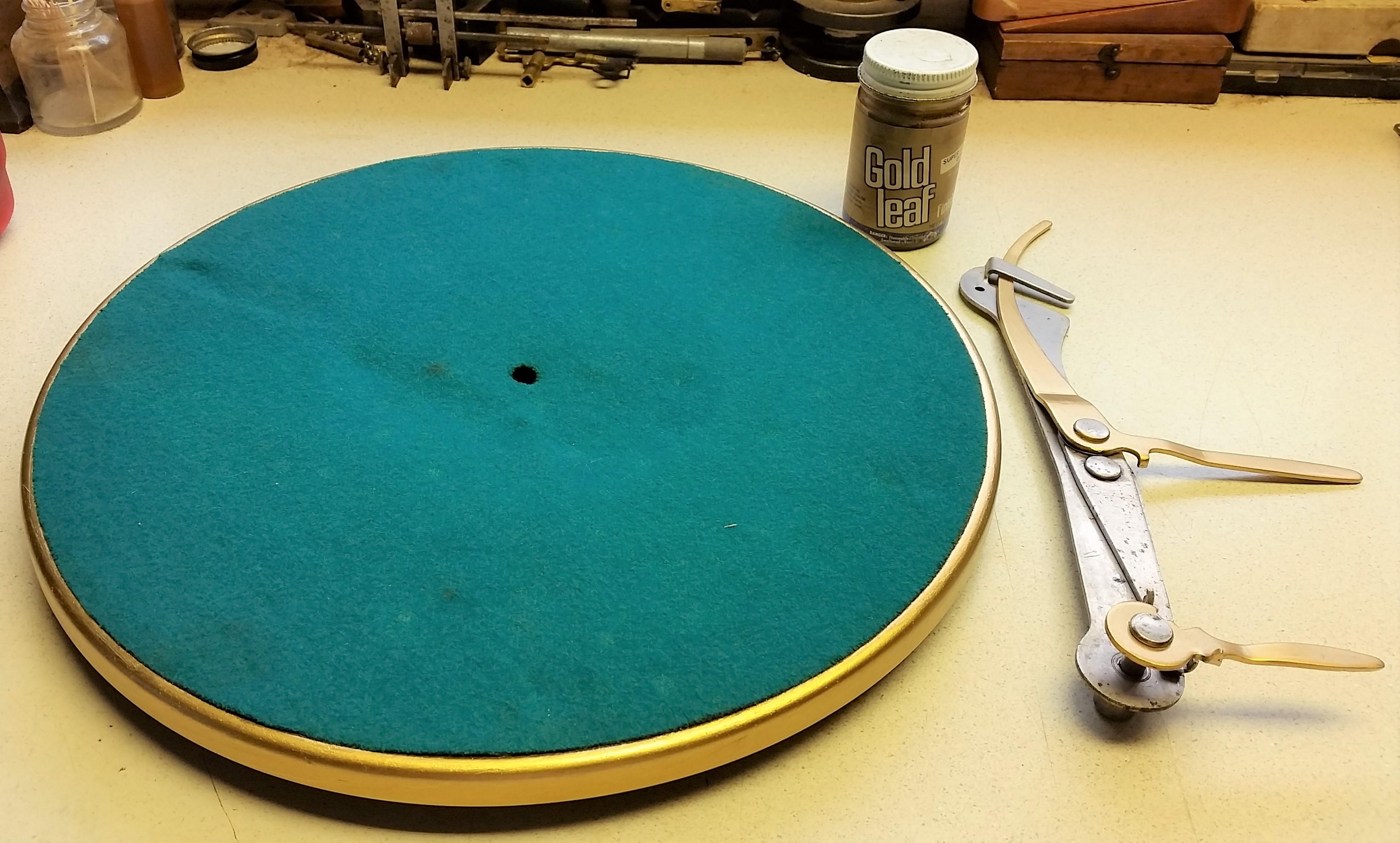Well I am finishing up the machine. Someone had painted the turn table edge in the past with some kind of gold metallic paint. I removed the paint with acetone and the gold plate was pretty much long gone. The felt looks pretty good and just needs glue down in a couple spots. The brake levers did not have any gold plate on the ends either. The steel levers had a little pitting so I sanded them down to get some sort of smoothness. Typically I polish down any missing gold plate on brass pieces, I think that is as best you can do without the expense of re-plating. On metal pieces I used some gold leaf that I got years ago in a box of clockman tools and miscellaneous items. This stuff is from the 50's or 60's and is the best thing I have found that looks like gold plate.