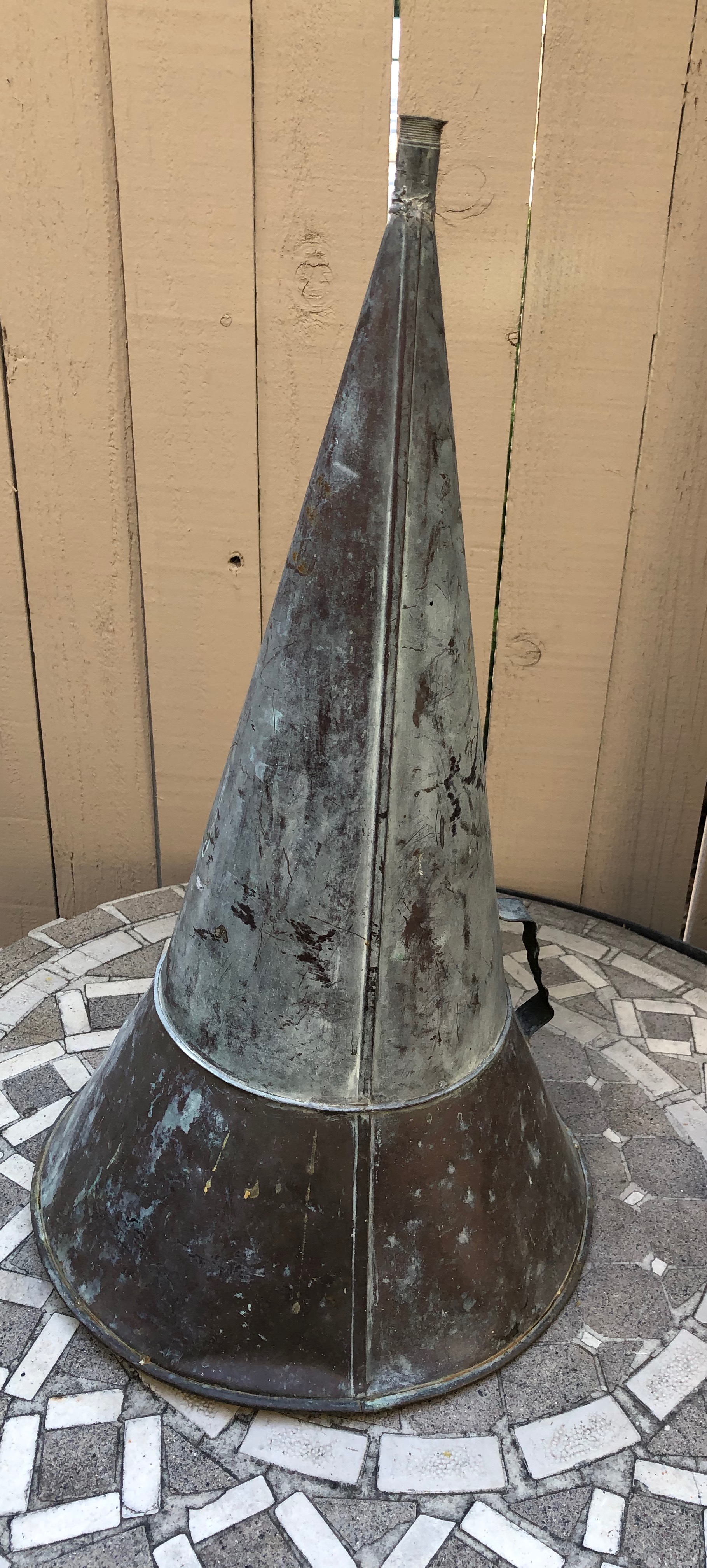 Length is 22" with a 12" bell. It is soldered lengthwise on two sides. The mouth is the correct diameter for a rubber horn connector. It looks like an cylinder horn to me, but can someone confirm and identify if so? Is it an amplifying horn or a recording horn if so?