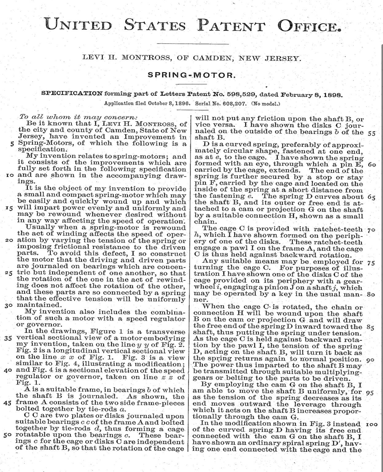 Thank you for this interesting patent. It always struck me as "curious" that Montross did not mention the words "phonograph" or "gramophone" or even "talking machine" in his zeal for patenting his important improvement to Emile's hand-winds. Even when Aldridge published his in-house history of the Victor Talking Machine Co. years ago (limited ed), he was not able to find this patent (which gave Johnson some serious headaches). As advanced collectors know, its 2 versions preceded Eldridge's (more famous) Trademark Model by 8 months in the marketplace.