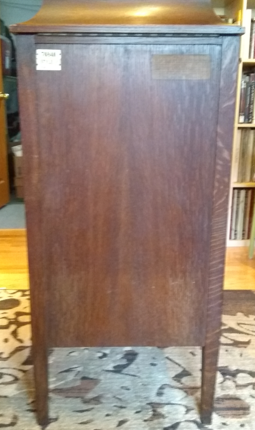 There is a work-tracking tag from Nashville, dated 22-Aug-20, which I found inside my A-V case and which suggests that the case is a Style 510 in Fumed Oak (see above in this thread). A-V used letter designations for their styles in their 1914/15 catalogue, so is the 510 designation a type within a letter style? In comparison to the styles in the 1914/15 catalogue, my A-V has the basic plainness of Styles F and G-1 but with the double lower cabinet doors of Style H but without the decorative woodwork on either side of the horn aperture door of Style H and with the casters (missing from mine) of Style I but with less ornate ferrules on the legs than those of Style I. Built five or six years later, my A-V does not fit into the line up of the 1914/15 catalogue.