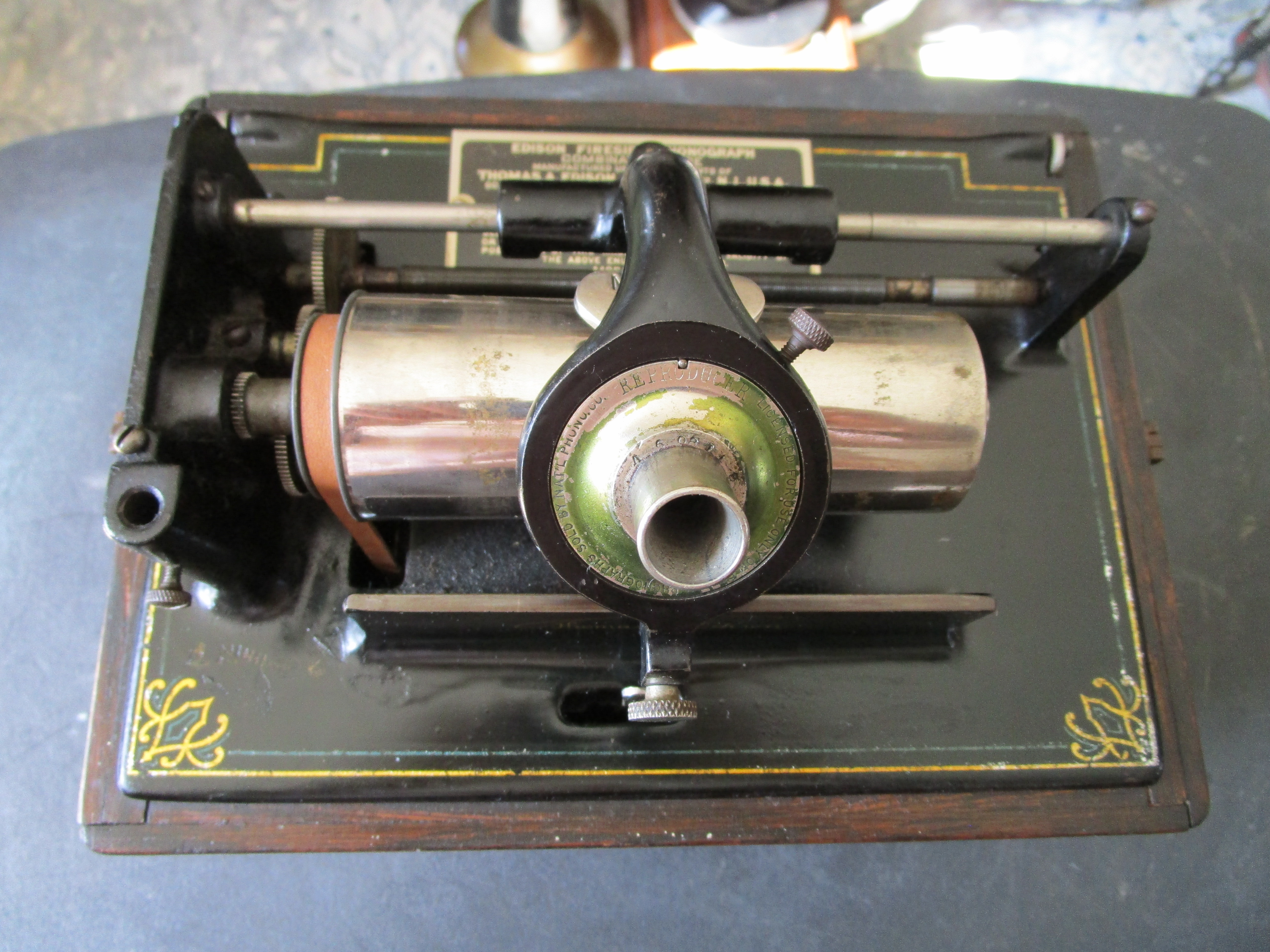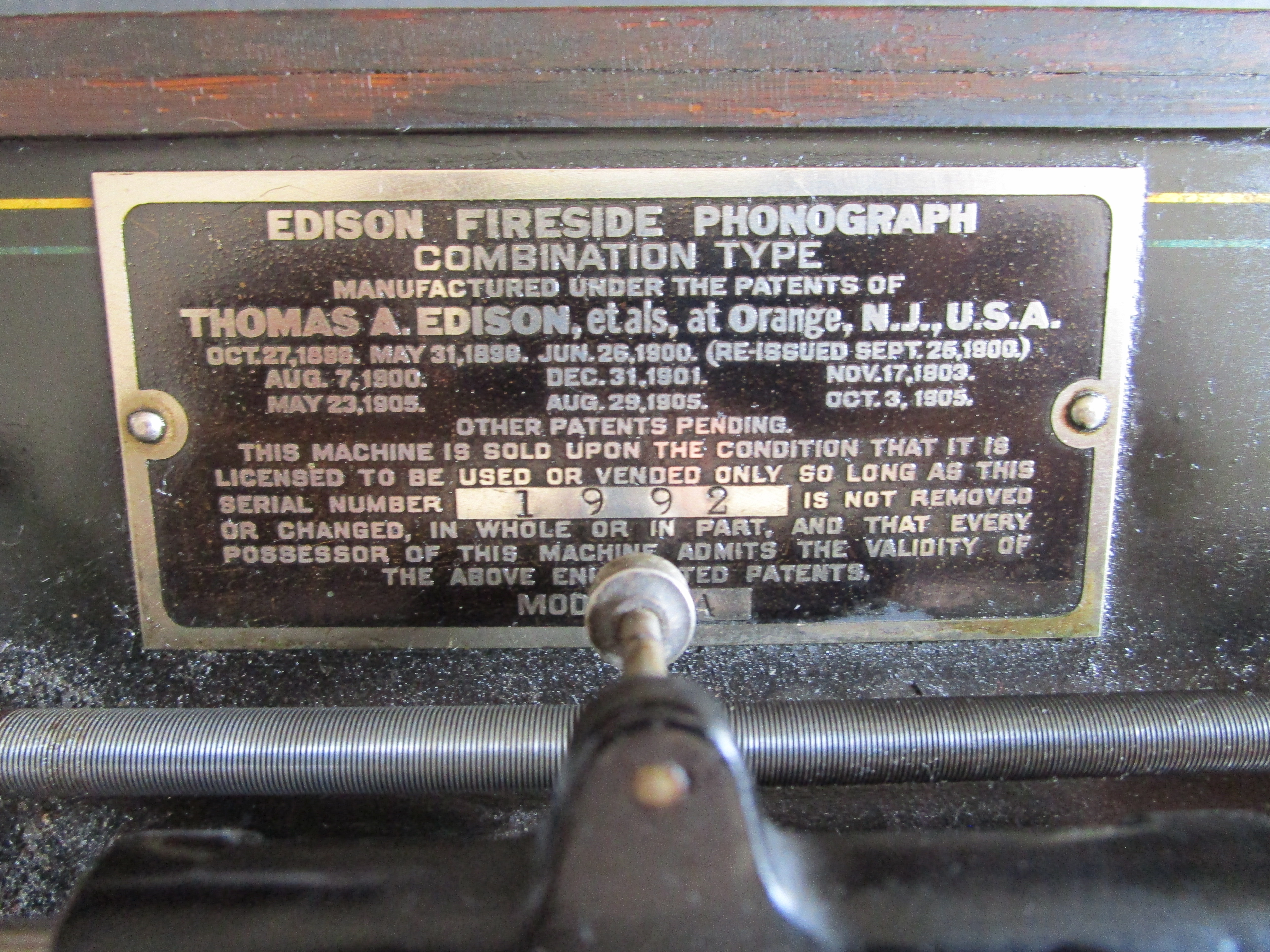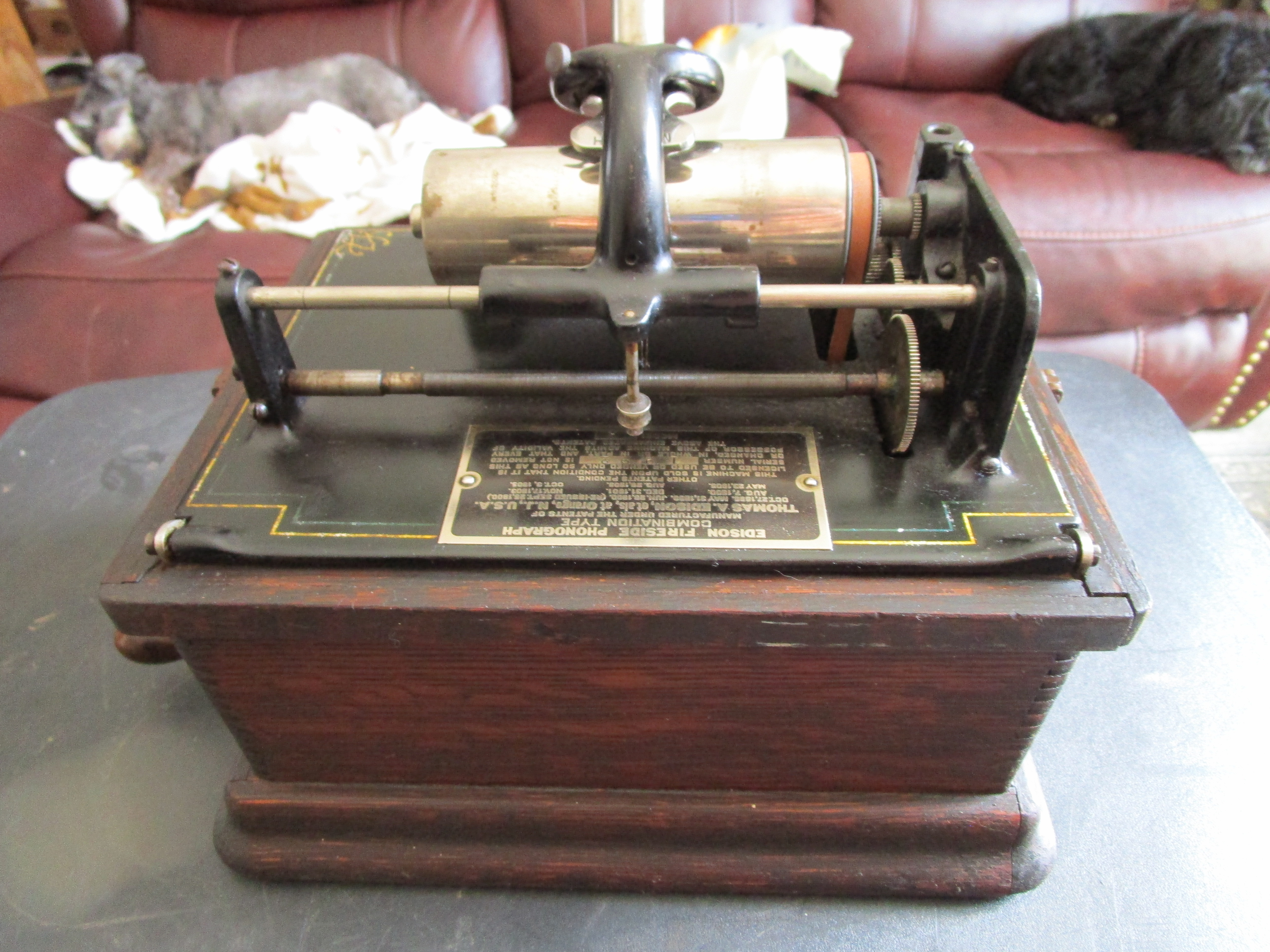 Please see pictures and play video for details. Fairly low serial number. Overall this is a decent working Edison Fireside A with 2/4 minute capability. Cranks and plays (click on video), decorative bedplate striping shows some wear but presentable, has model H reproducer (plays but could use rebuild/restore), cabinet is solid, finish is very dry and flaking, missing lid and gear cover, no horn.