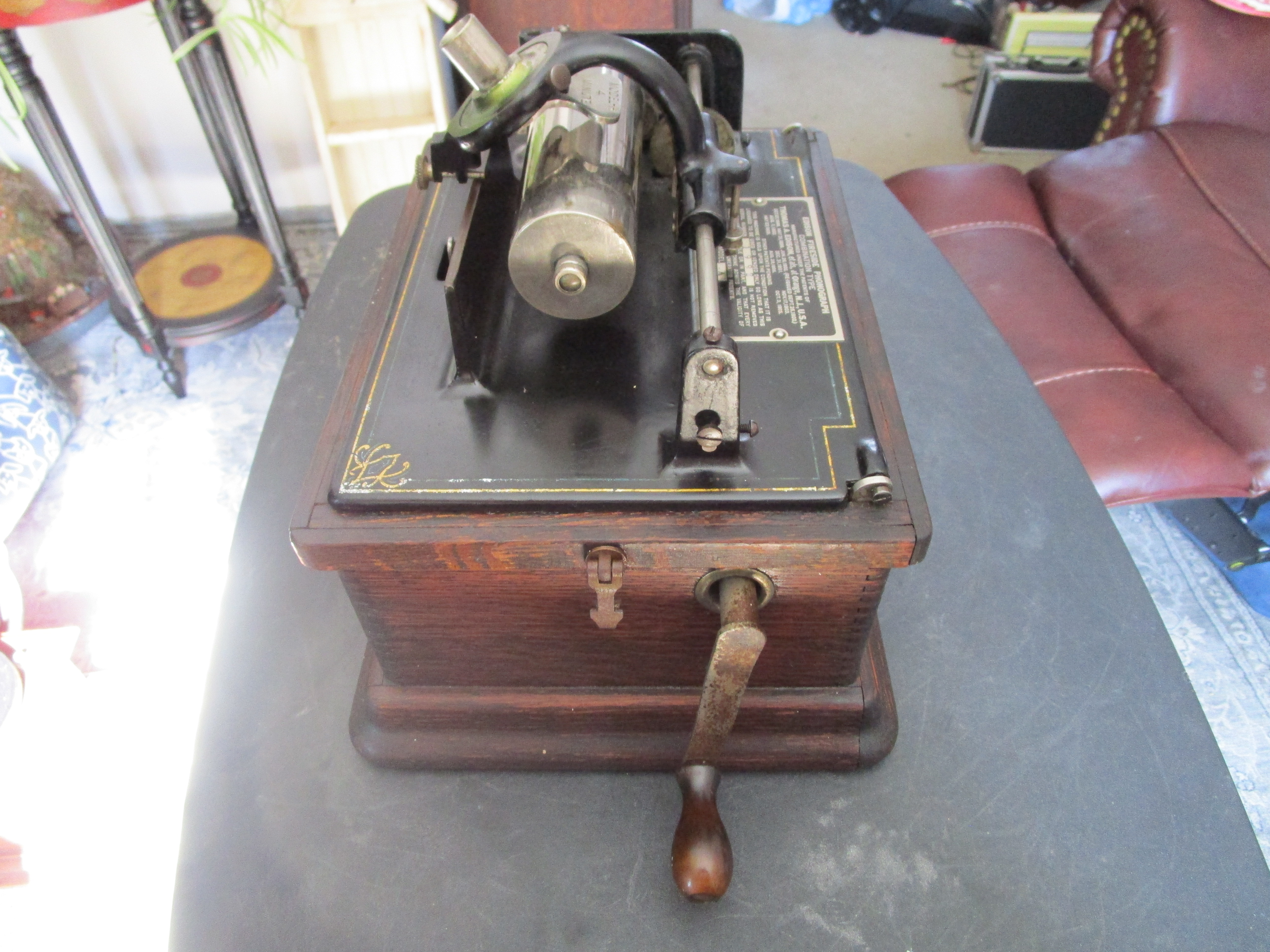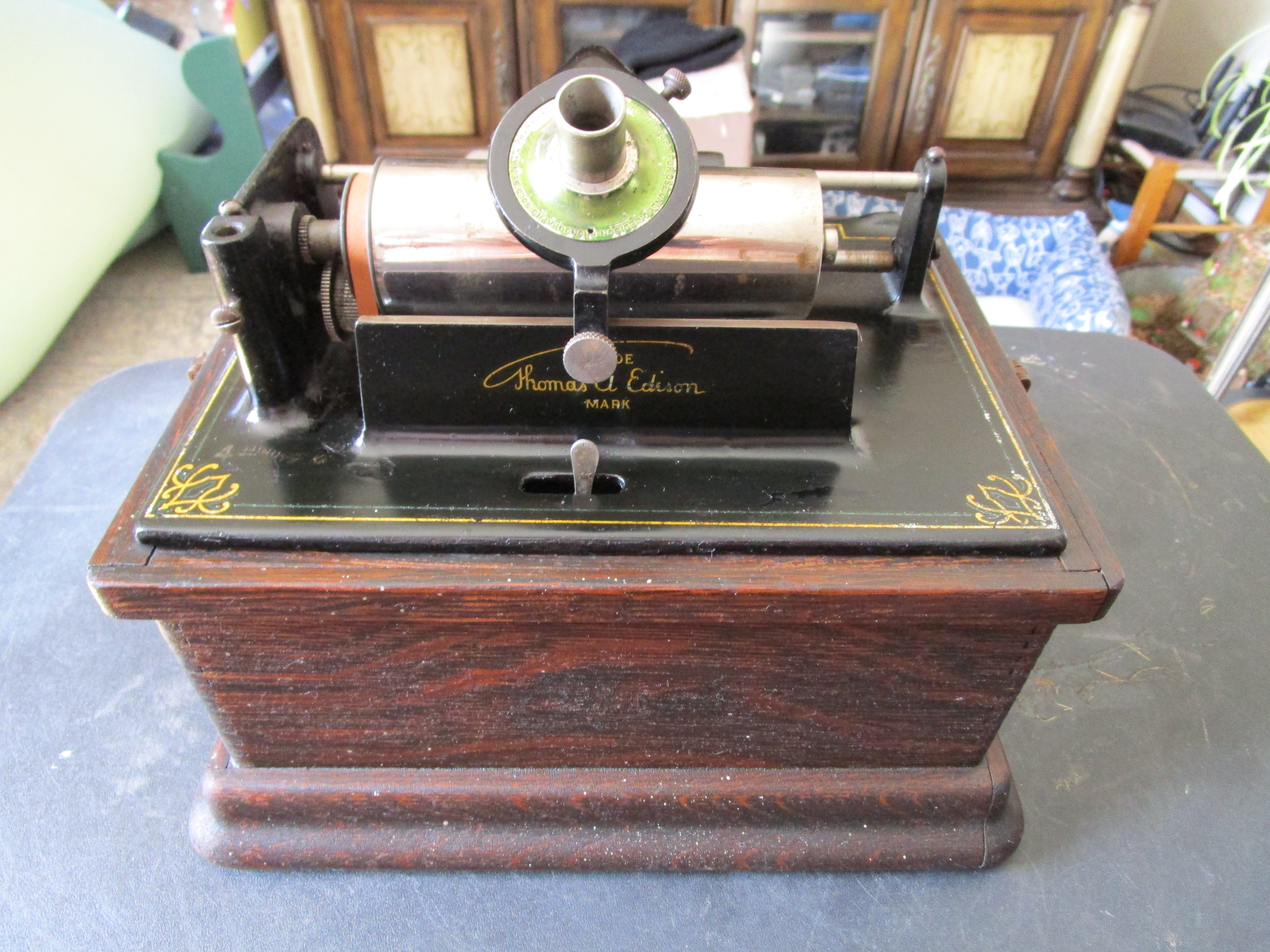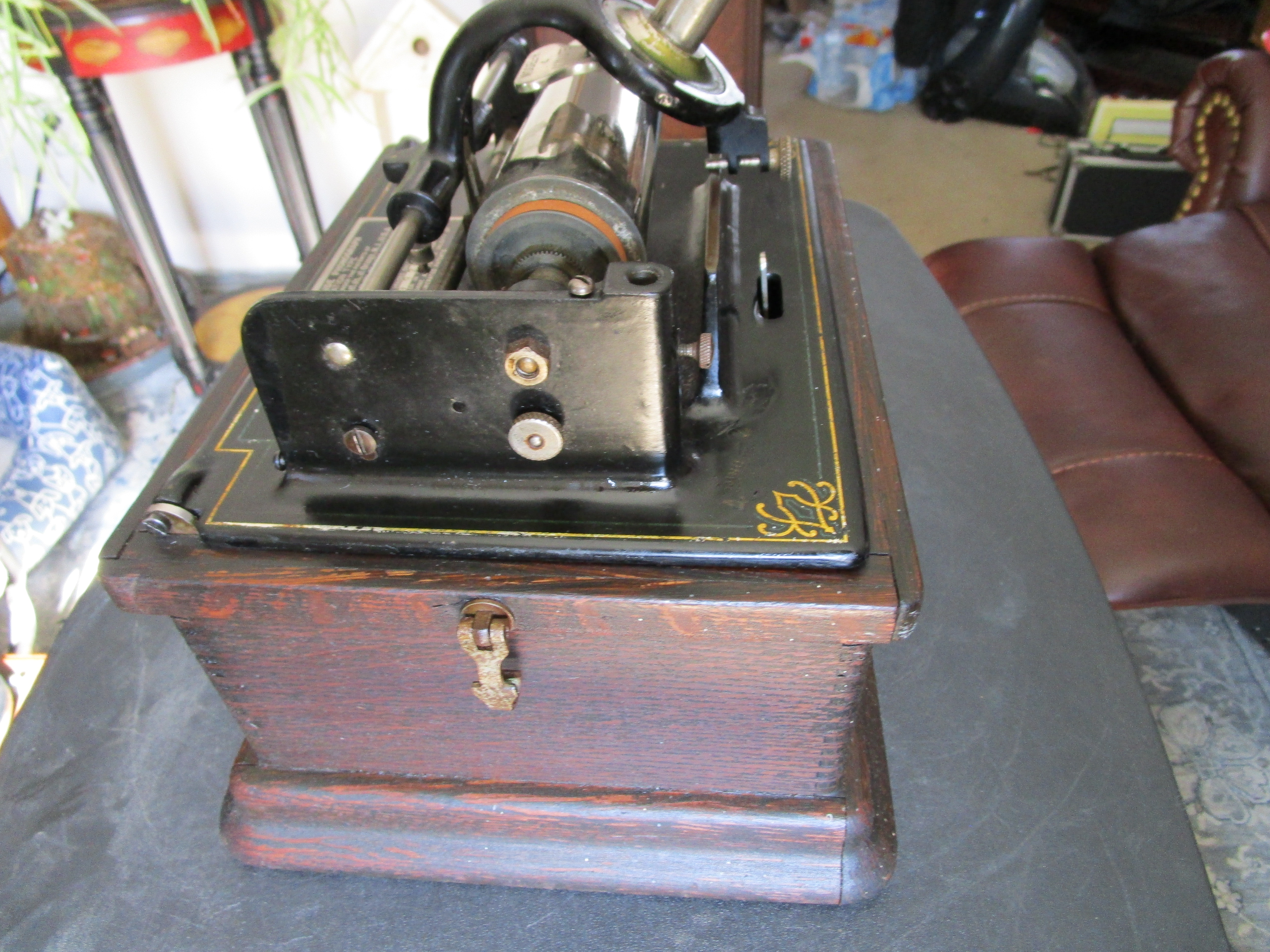 Please see pictures and play video for details. Fairly low serial number. Overall this is a decent working Edison Fireside A with 2/4 minute capability. Cranks and plays (click on video), decorative bedplate striping shows some wear but presentable, has model H reproducer (plays but could use rebuild/restore), cabinet is solid, finish is very dry and flaking, missing lid and gear cover, no horn.