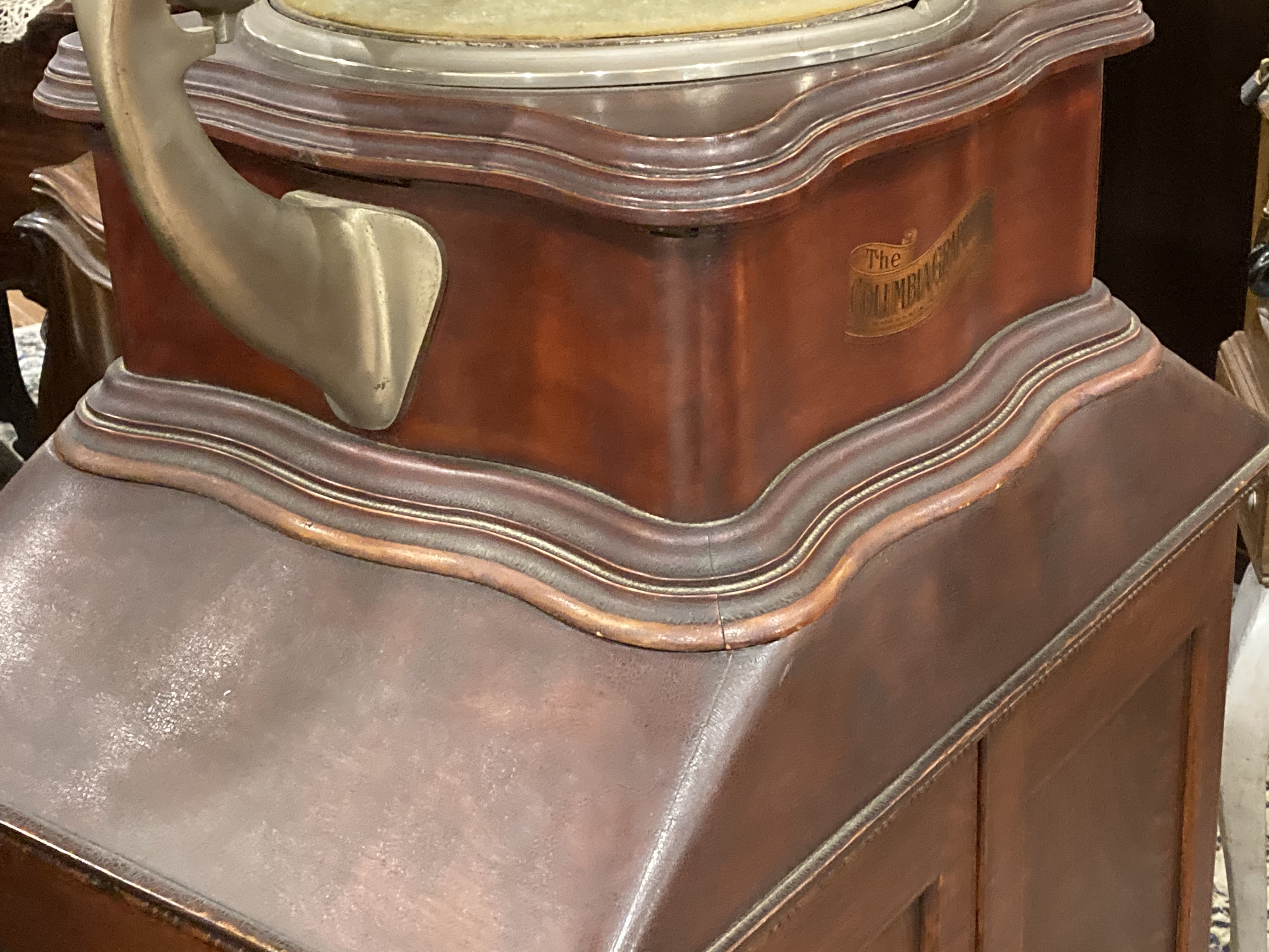 I just acquired this BY and cabinet, my question is has anyone seen this type of base adapter ? Was this an item that an after market company made or just something a skilled carpenter made for this machine? The base transition is made of solid mahogany and is serpentine to the exact shape of the BY. The BY has guide boards attached to it that nest into the transition to keep it secure. Another odd thing is the record cabinet is oak . The BY and the transition are both equally alligatored with age as is the record cabinet. When you lift the machine off its adapter the varnish on top of the record cabinet is nice and glossy just like under the lid of an upright phonograph that was always kept shut never being exposed to sun light. I am convinced the three pieces have been together for a very very long time , perhaps since they were new , but was it a homemade combination or did a cabinet company provide?
