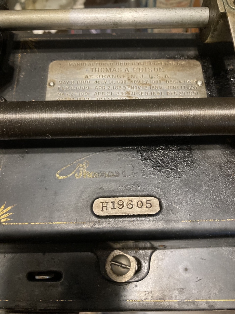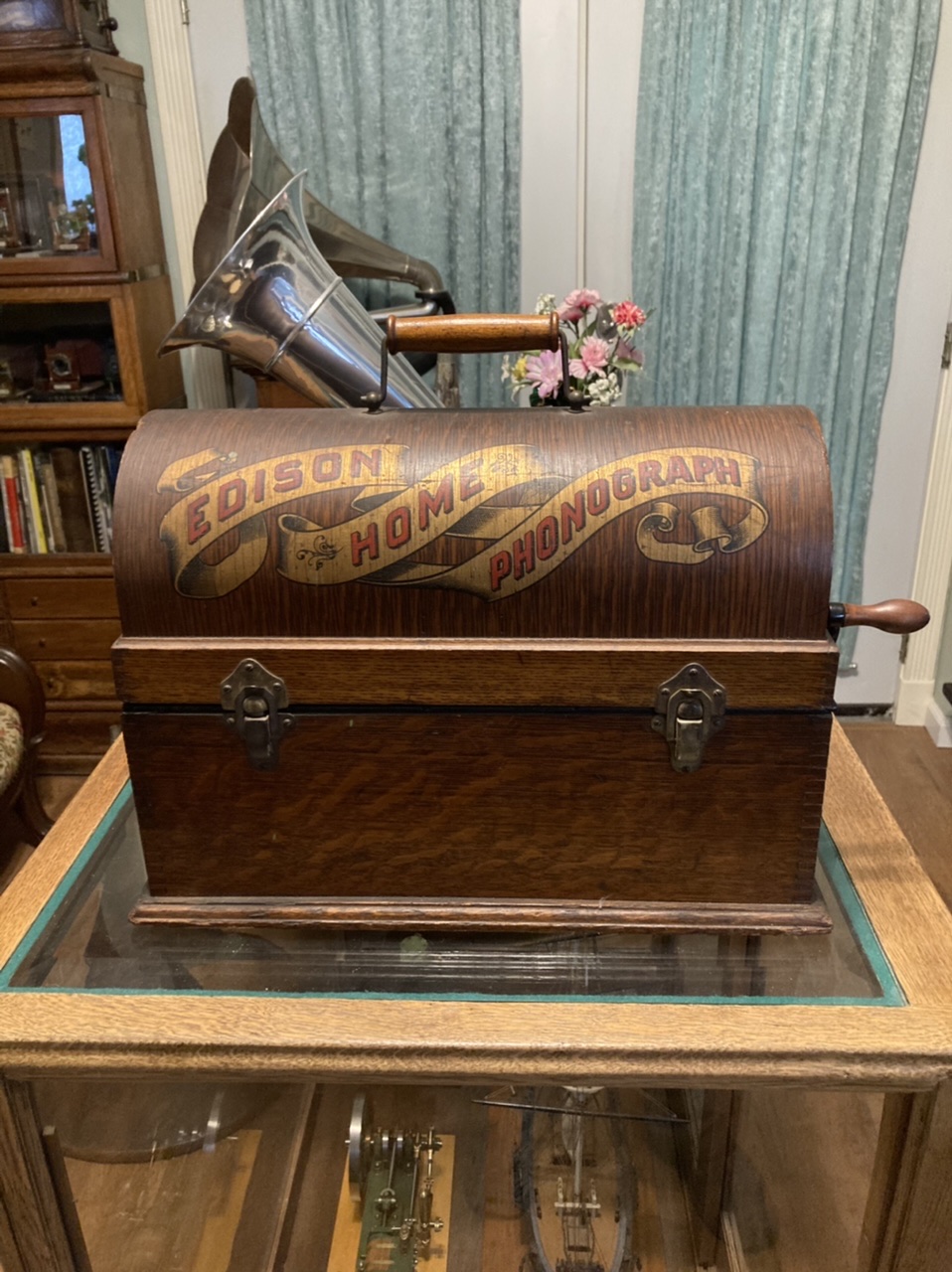 Found in the Wilds of Facebook Marketplace, Early Edison Home 4 latch Suitcase, 2 and 4 minute conversion with Model O Reproducer and Music Master Horn and trunk full of cylinders. It appears to have a “Hilton” Speed Meter. Is that an aftermarket piece? The horn needs a little work, but it has good bones and good decal. I’ve never seen a horn quite like this one. The machine had been passed down through the family, but the current owner didn’t know any history, I may convert it back to a 2 minute machine, opinions welcome.