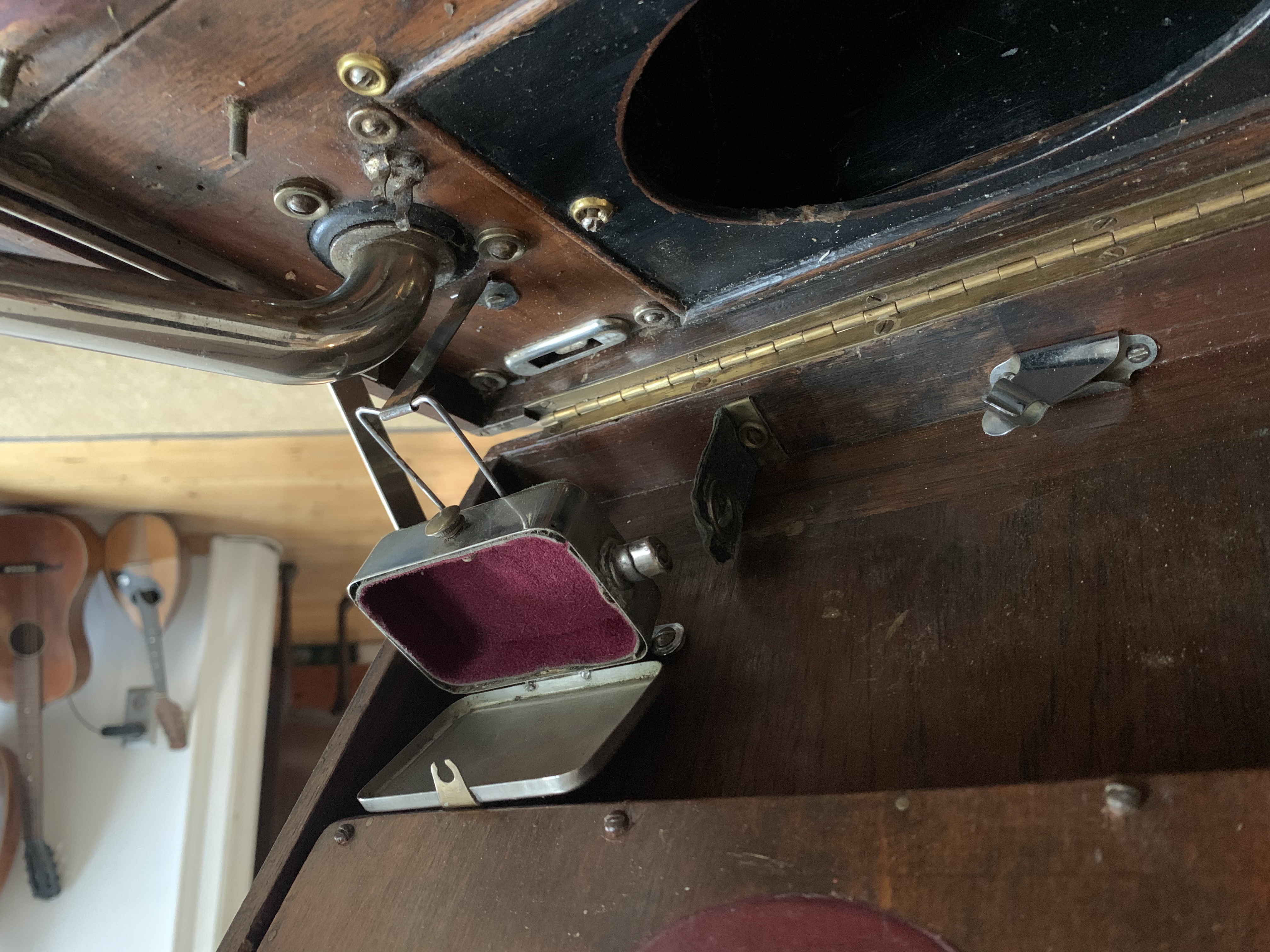 So the strange 112 arrived today. Turns out exactly as expected. A periode hotroded 112, with replaced record storage. The crank handle was replaced with a very nicely turned brass piece. The needle storage is extremely interesting and involved. The horn below the lid is there and the plaque covers nothing but teak. I am really torn. First i thought i will revert this back to some originality. But looking at the mods, they Look very periode and very well made.