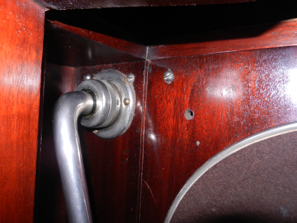 No, there is usually a good air gap between the woodwork and the conduit. My impression is that this was done on purpose to minimise unwanted frequencies (motor etc) entering the auditory trunking. The more usual nickel-plated cover ring also did not touch the conduit for the same reasons but was added mainly for cosmetic purposes. Whoever made your example seems to have decided to augment the structural stability of the horn by making the conduit a good fit in the rear deck-board instead of merely relying on the woodwork at the top of the case. EMG decided on the latter course of action by incorporating the stabilisation ring under the woodwork at the top of the case. In that instance, when assembling, I have found it important to wind the lower ring upwards just sufficient to ensure a really good pressure fit when winding down the top ring---aided by the peg-drive spanner. A strong sandwich situation is thus ensured. Stability is then good, even when employing an Oversize horn which is slightly nose-heavy.IainW wrote: Thu Feb 03, 2022 5:08 am Attached is photo showing where conduit comes up through the deck - with the use of a blanking plate is it usually this tight ?