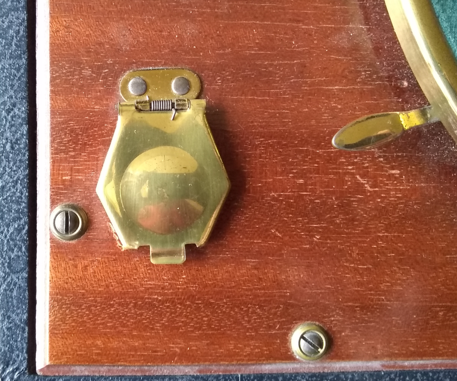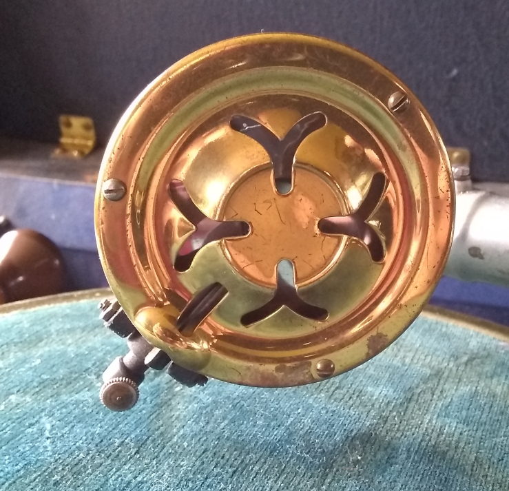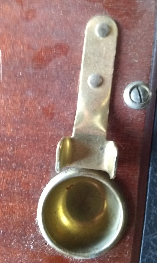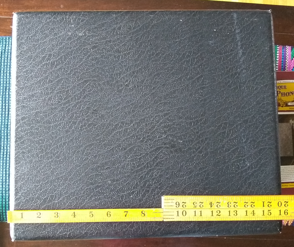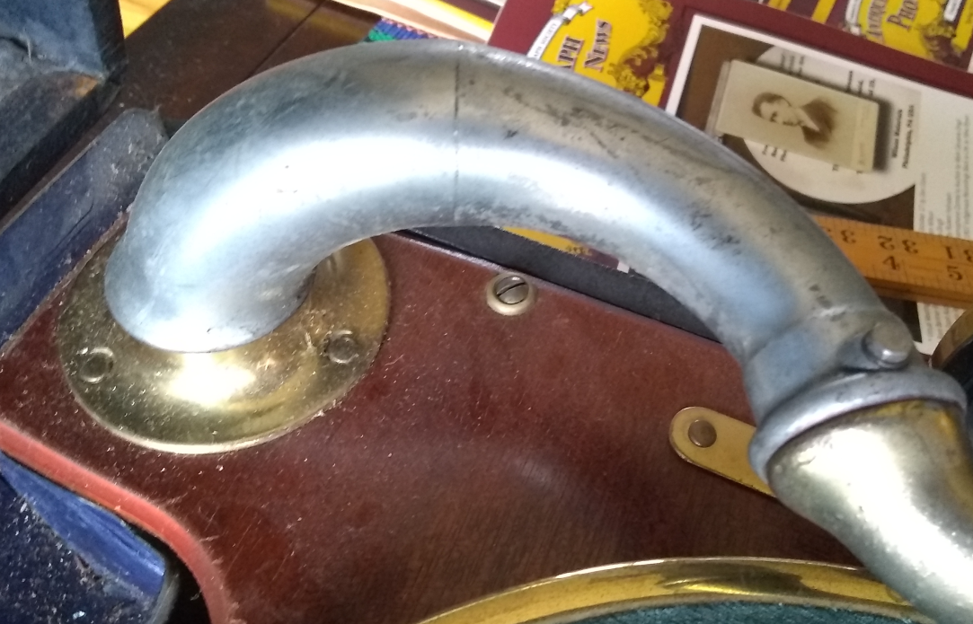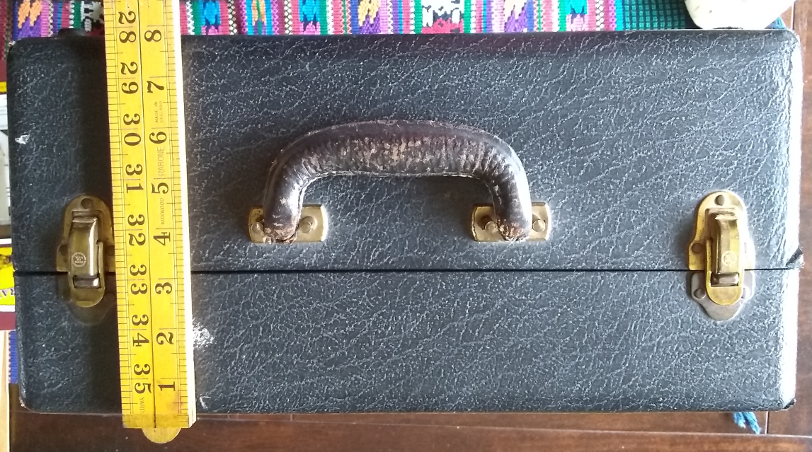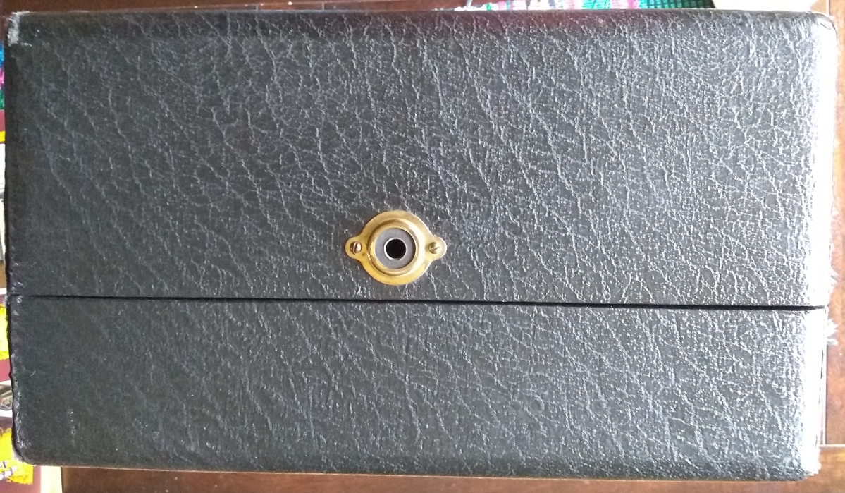 I will start the outside of the case. The covering (if this were a modern guitar or amp case I would say Tolex but I have a feeling this would wrong here) is in very good condition. The feet are largely worn off. The leather handle is still in excellent condition but if I do not do some conservation work on it, it won't stay that way. The crank aperture is on the right side of the case. The crank goes in straight, not at an angle.