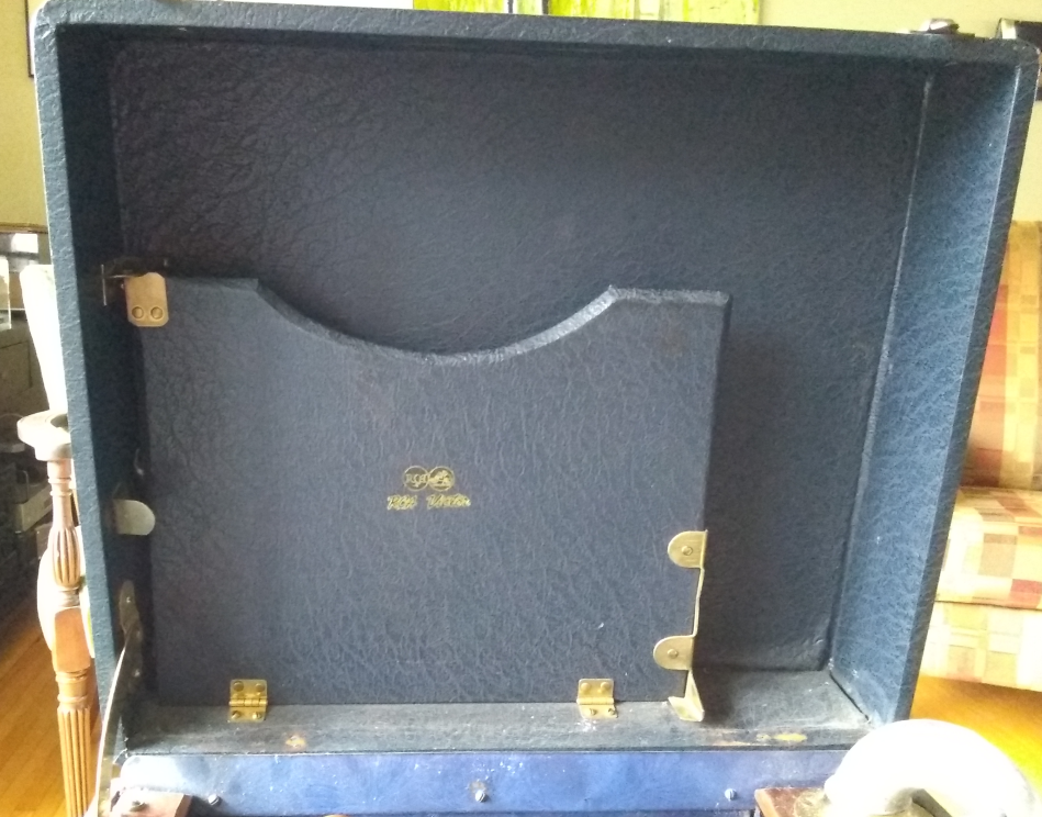 The cloth covering of the record holder matches that of the case exactly for colour and texture. I am reasonably certain it is original to the case. I have included a close up of the RCA Victor label on the record holder. The logo is the only RCA Victor badging visible on the machine without removing the platter.