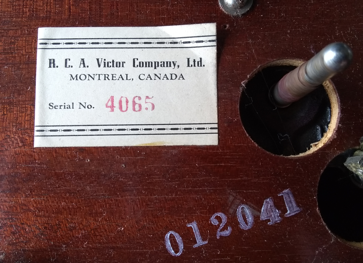 There is an RCA Victor, Montreal, label with a serial number pasted to the motorboard. There are two sets of paint stencilled numbers, one near the RCA Victor label and another single digit beside the aperture for the speed control. I am wondering if the stencilled numbers might be date coding 012041 4 - December 4, 1941? Only speculation ...