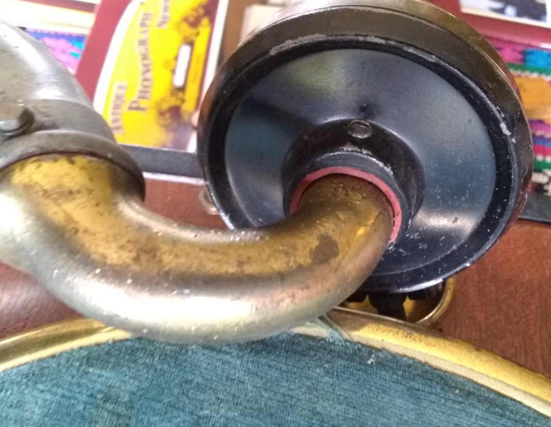 The one very odd thing here is that the mouth shape of the horn and the aperture at the back of the motorboard for it do not match perfectly. There is a sizeable gap near the base of the tone arm. The motorboard fits the case perfectly, and there is no sign of any tampering with it or of it having been cut down or refinished. Curious.
