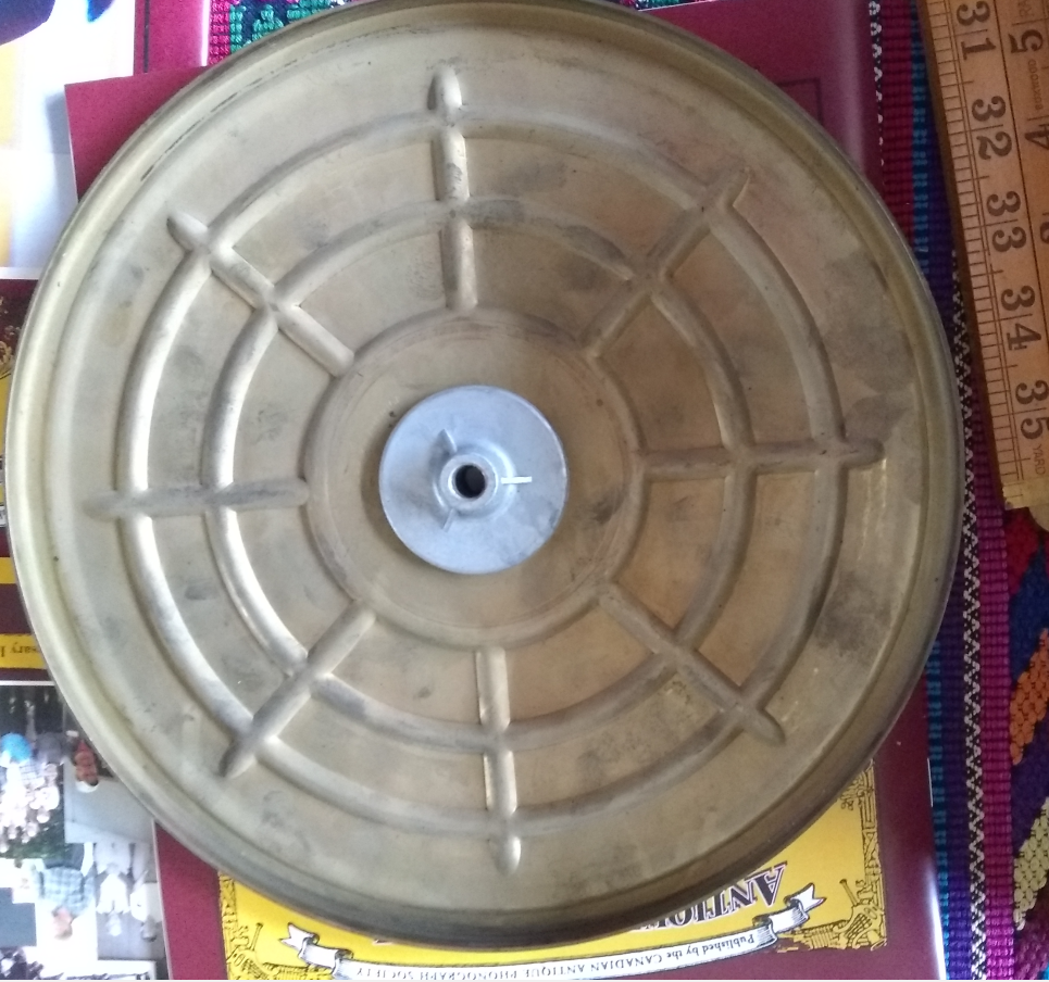 The cloth on the platter appears to be entirely original and is excellent condition. The crank is threaded and must be screwed into the winding shaft for the motor and then unscrewed to remove it. The stamping on the bottom of the platter was mentioned above.