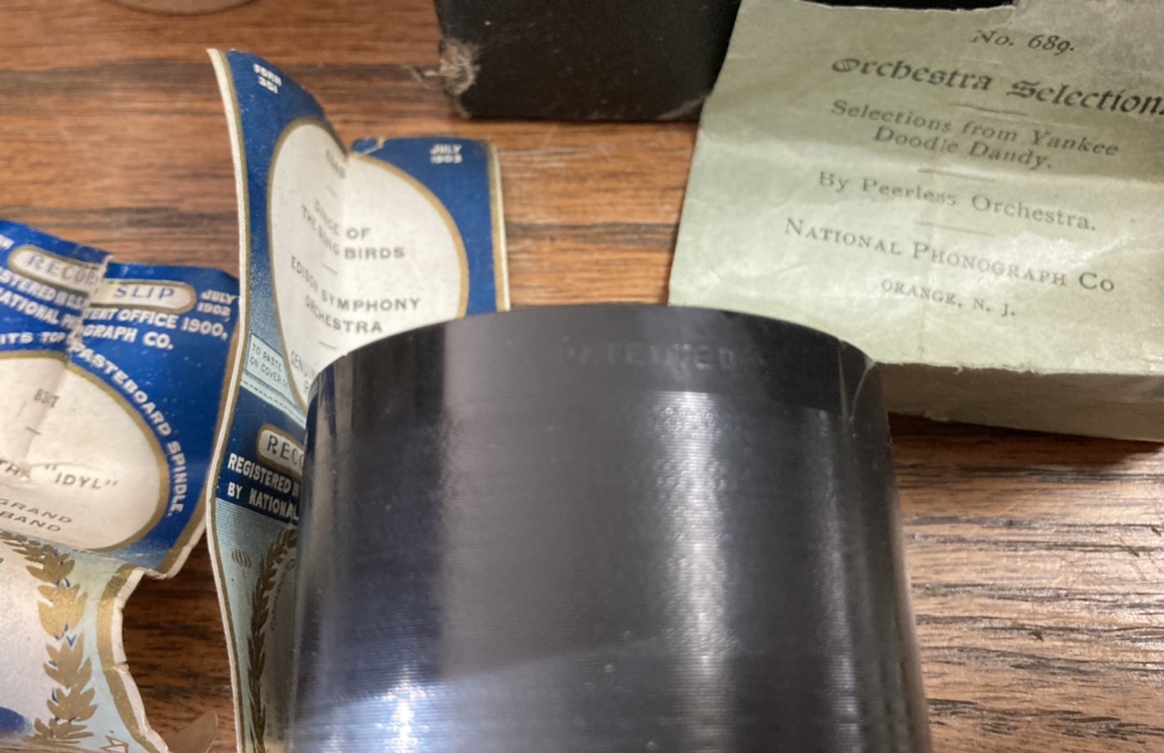 Django wrote: Sat Apr 02, 2022 6:09 pm I haven’t played any of the cylinders yet. Some of the containers have 1901 and 1902 patent dates and some have no patent information or portrait of Thomas Edison. There were also some paper inserts. Some of the black cylinders do not have any information other than Edison’s signature and the word Patented, (see pictures 11 and 12).