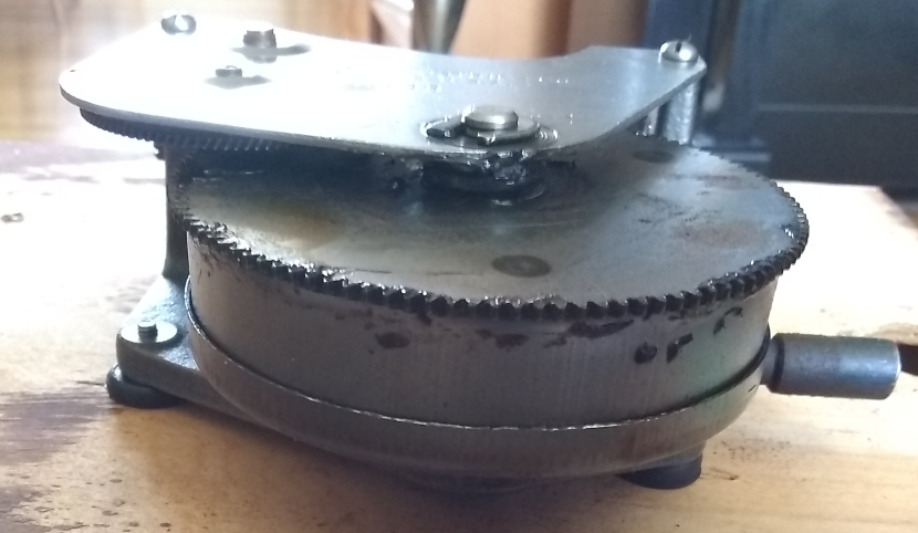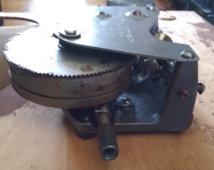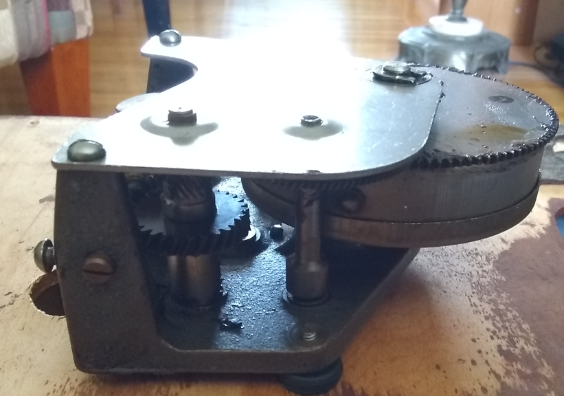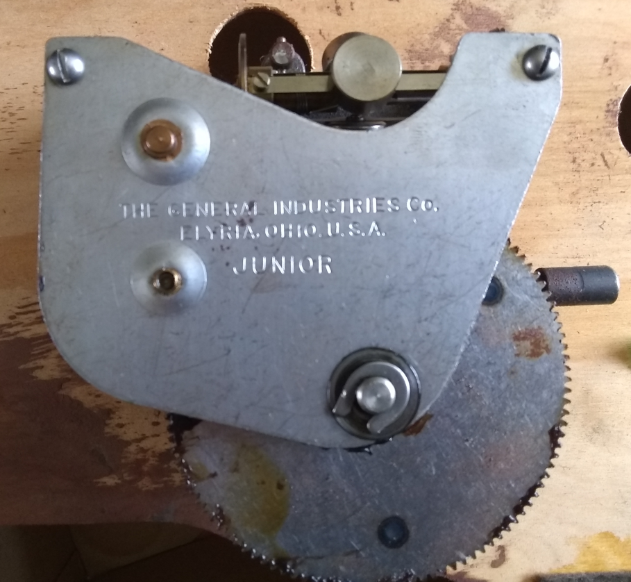 The motor is a General Industries, single spring Junior. It appears to have been lubricated entirely with a black grease which has become a bit waxy/gummy but is still somewhat serviceable, at least as far as the coarser gears are concerned. It seems too heavy for the governor worm gear, though. Whatever is in the spring housing, away from the air, is probably still OK. The spring does not stick and makes no noise winding or unwinding. I will clean it up and re-lube it. I don't think I will bother with the spring for the moment, too much disassembly for something that doesn't seem to be presenting any problem.