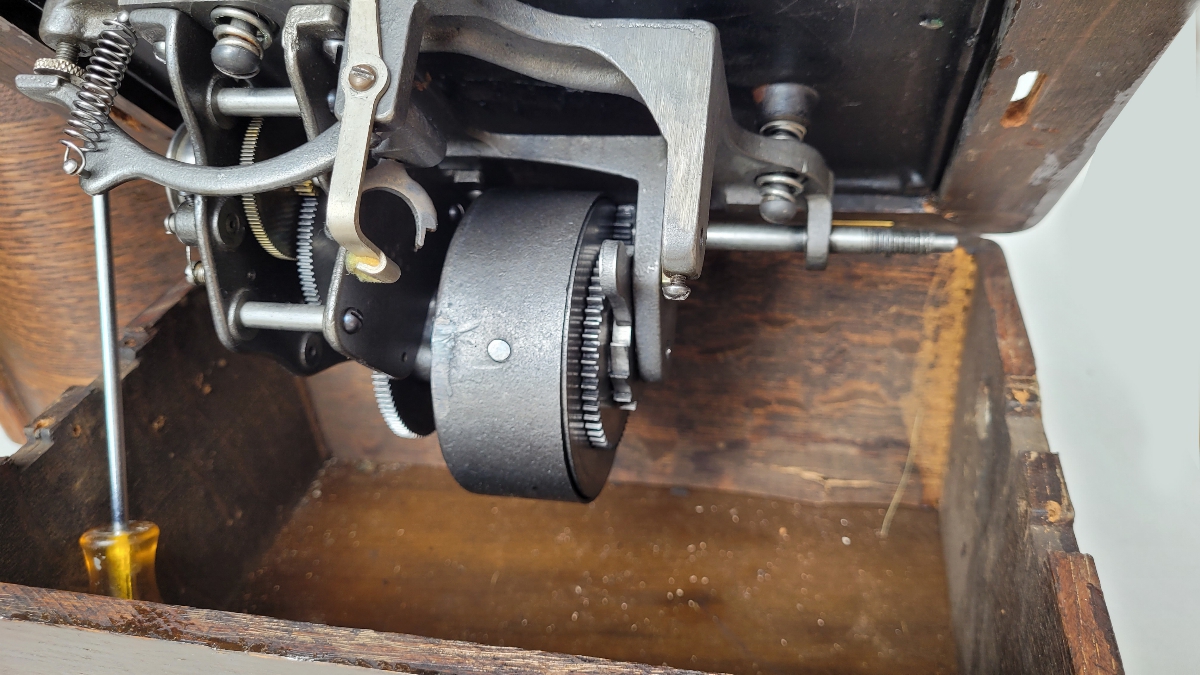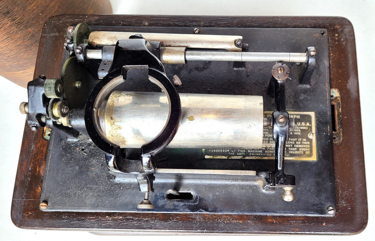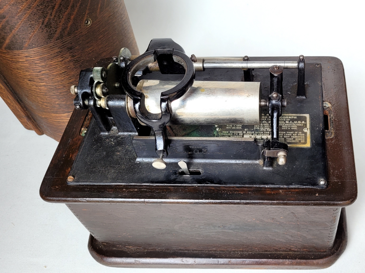 I've been digging through years of accumulated parts and partial machines that I can dispose of at a reasonable price. Here is an Edison Standard B with an intact 2/4-minute conversion attachment with large horizontal carriage (no reproducer). The top works is complete except for a gear cover. The motor is not complete. It needs a spring in the spring barrel, crank, a governor & bearings & friction yoke. The case has been "refinished" with some brown stain and the cover is missing hardware. The case base board has been replaced.