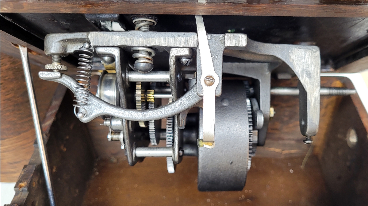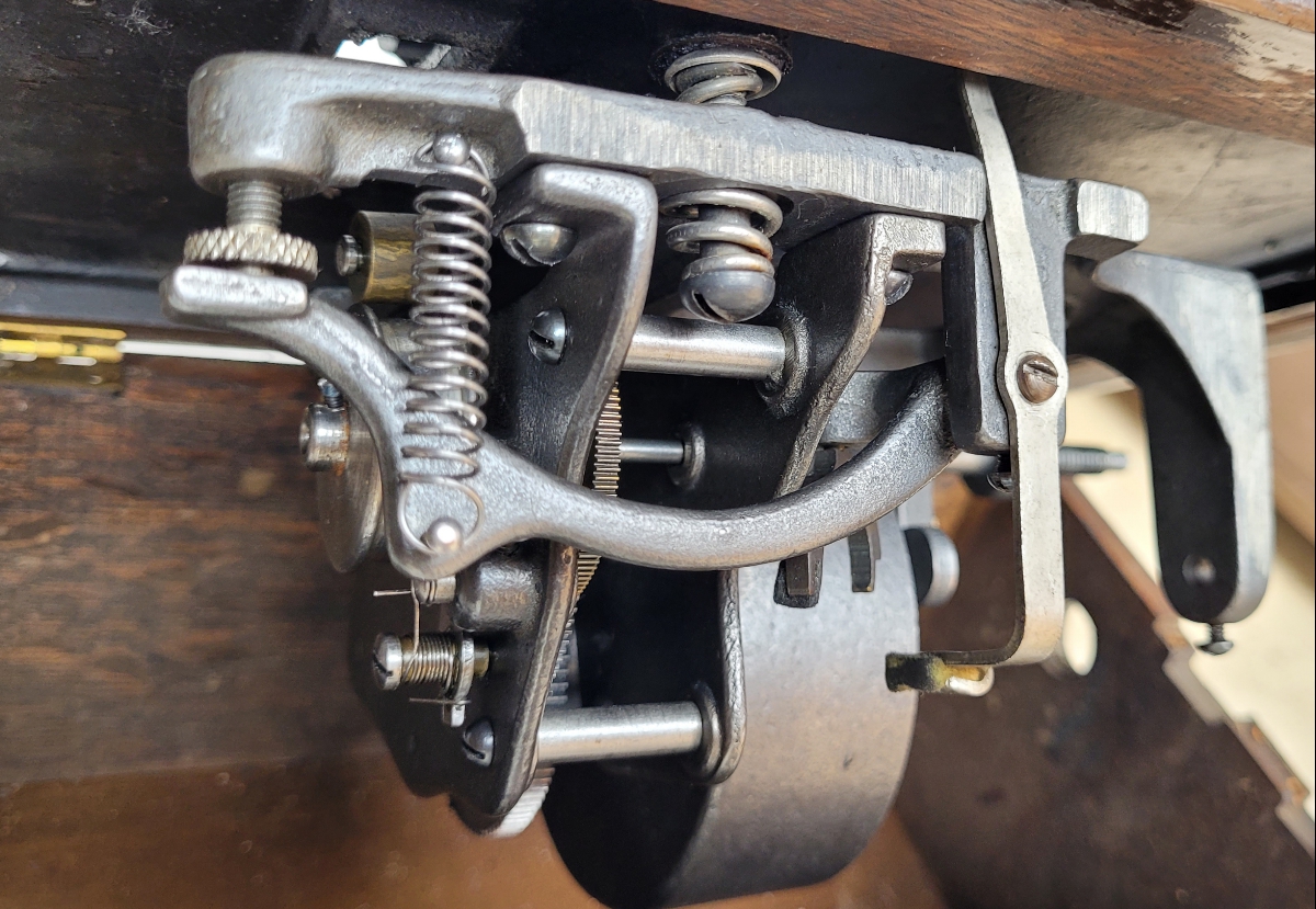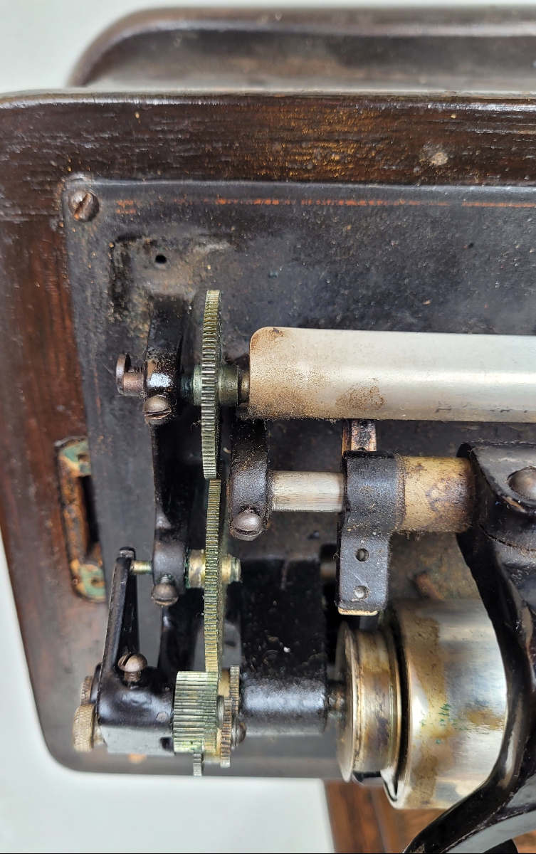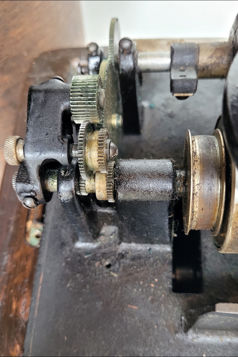 I've been digging through years of accumulated parts and partial machines that I can dispose of at a reasonable price. Here is an Edison Standard B with an intact 2/4-minute conversion attachment with large horizontal carriage (no reproducer). The top works is complete except for a gear cover. The motor is not complete. It needs a spring in the spring barrel, crank, a governor & bearings & friction yoke. The case has been "refinished" with some brown stain and the cover is missing hardware. The case base board has been replaced.
