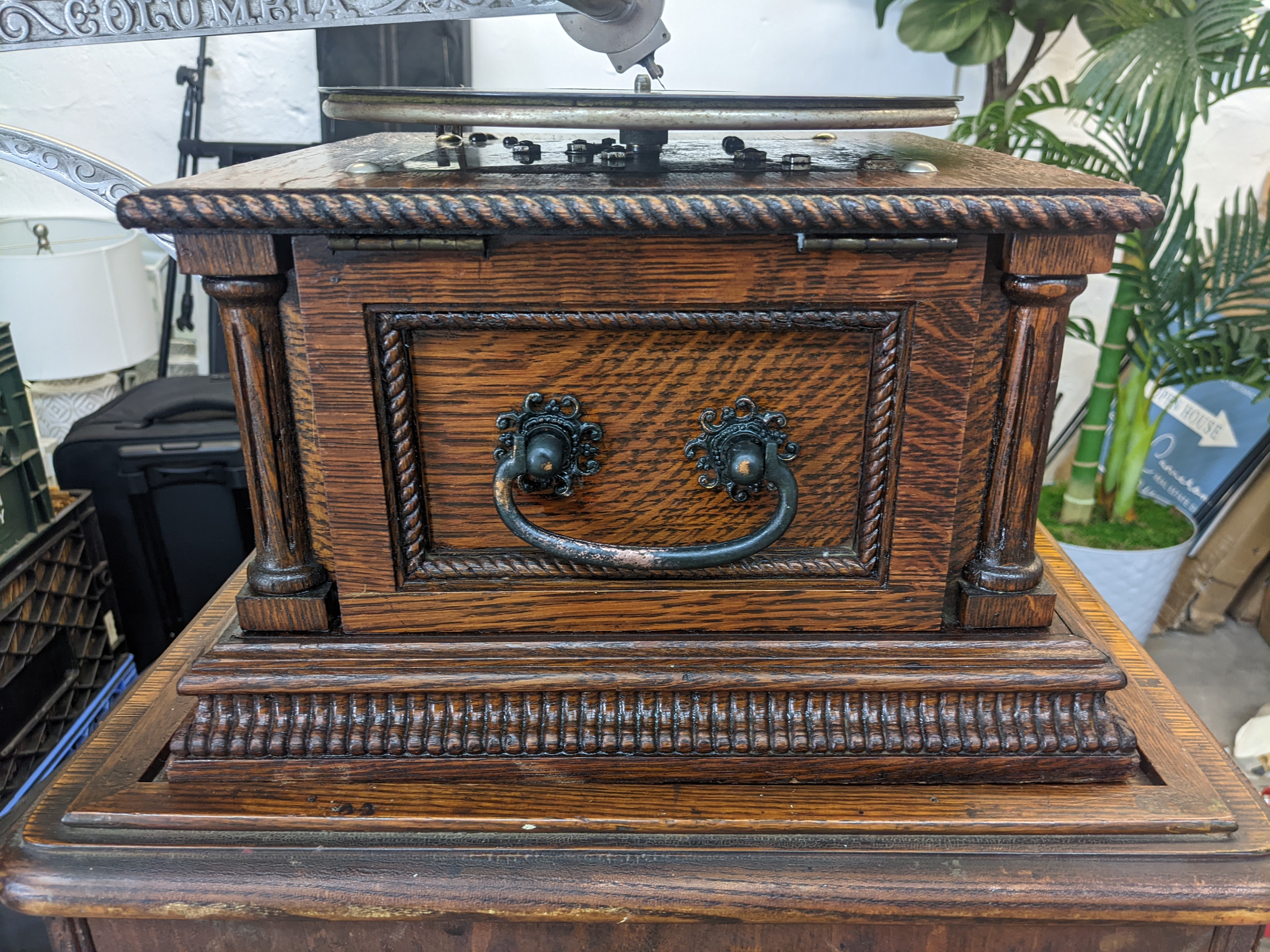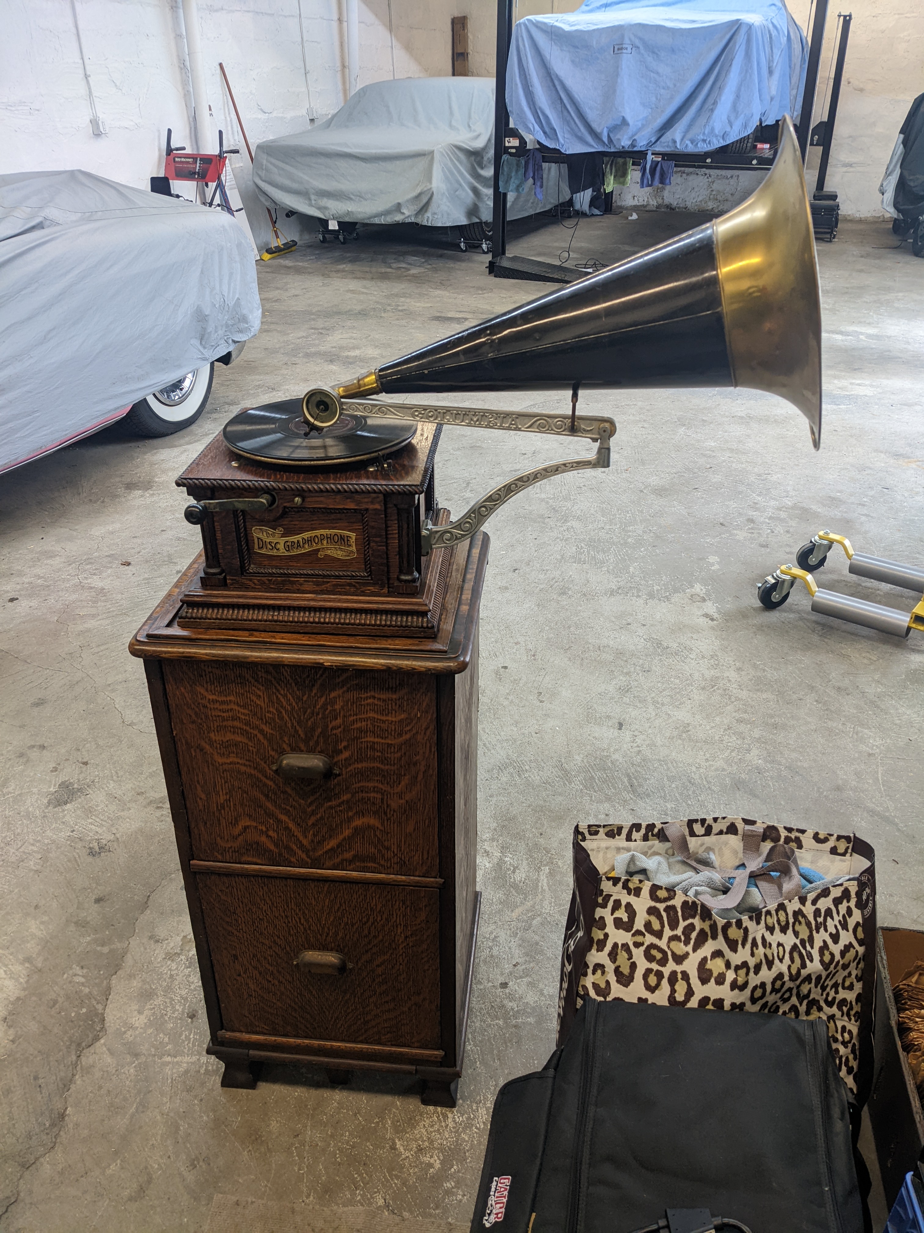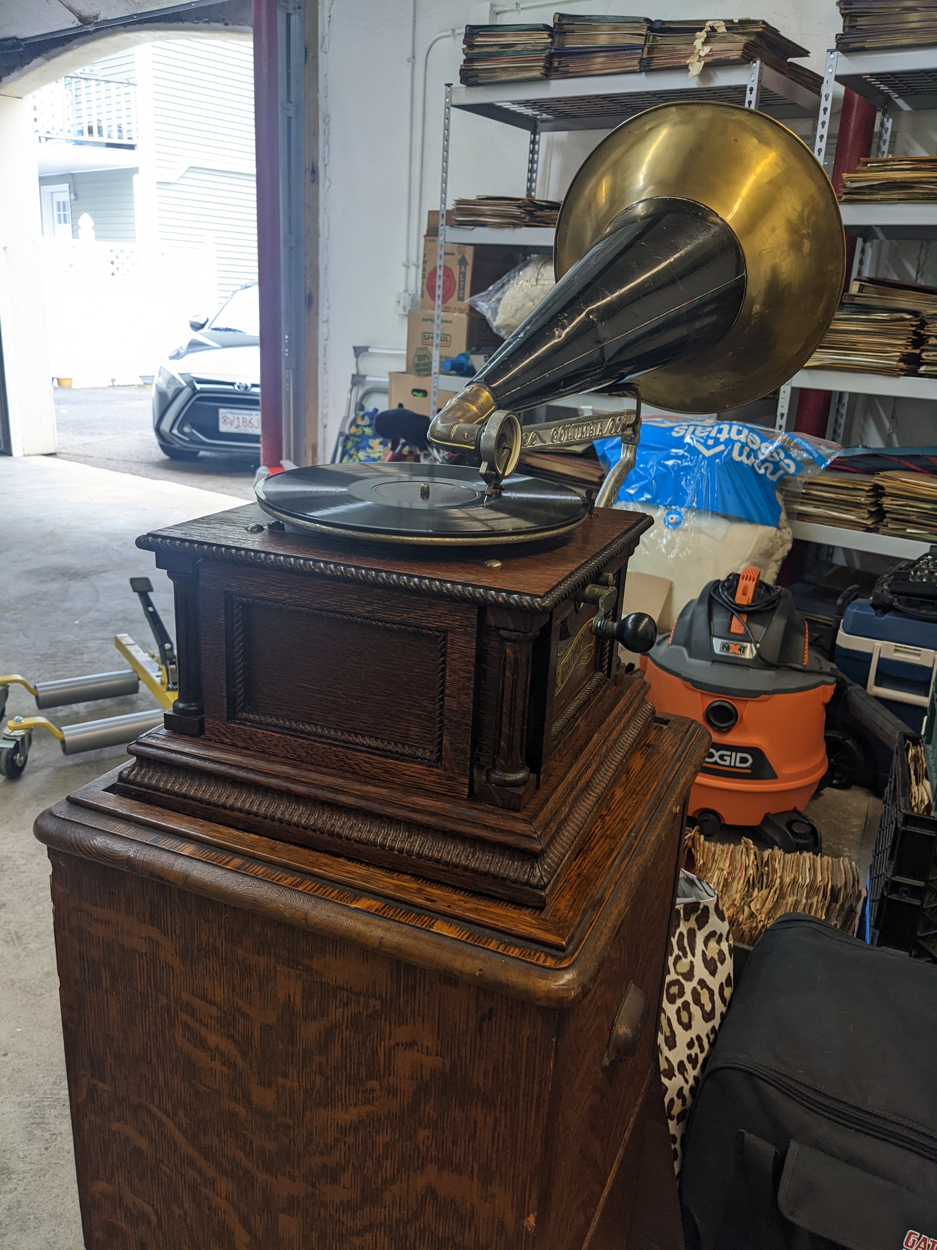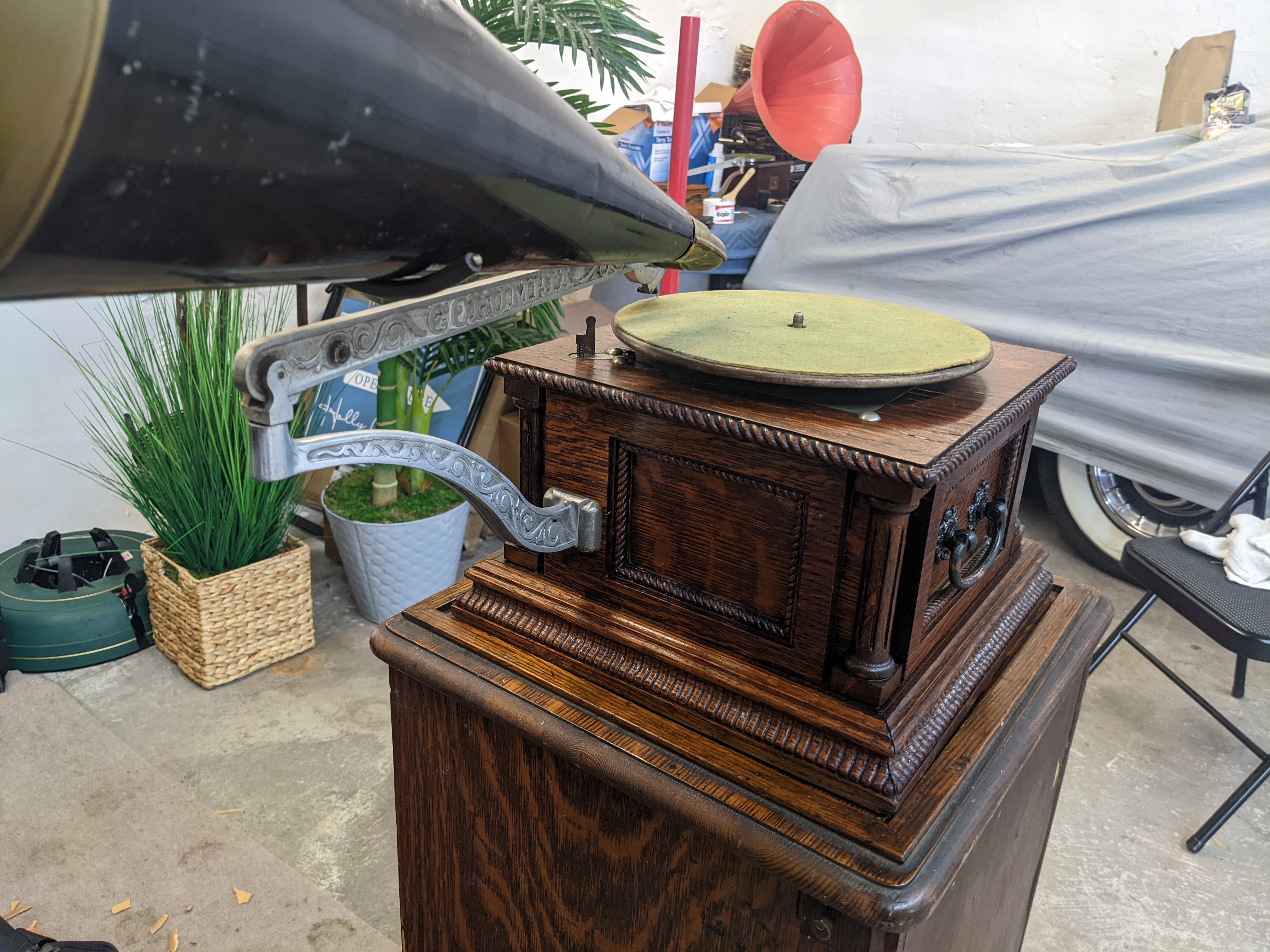 The Columbia AH was one of the top of the line disc machines that Columbia began offering circa 1903. This machine came out of a collection in Worcester. I have rebuilt the reproducer, cleaned up the cabinet and made minor adjustments to the motor.