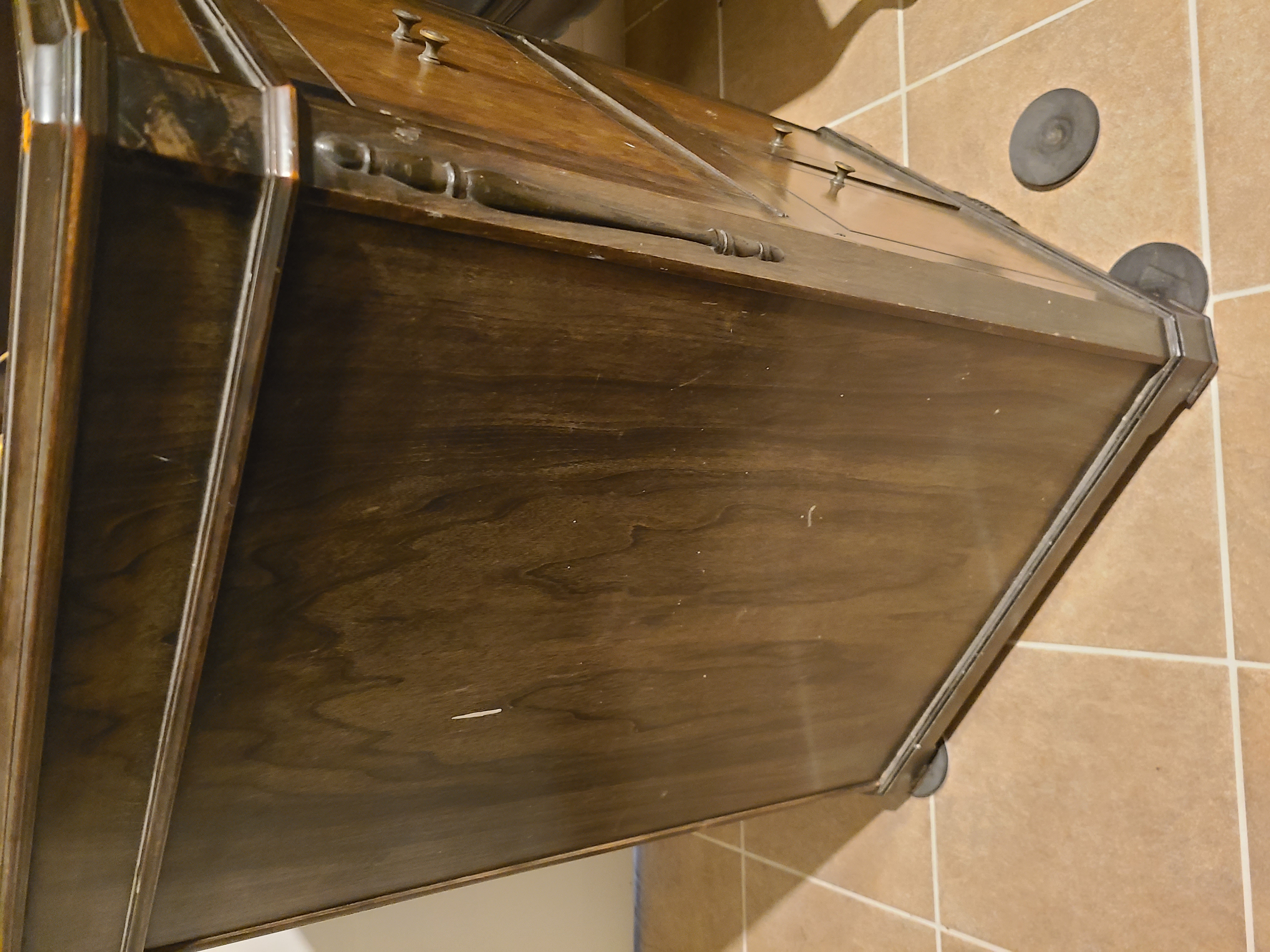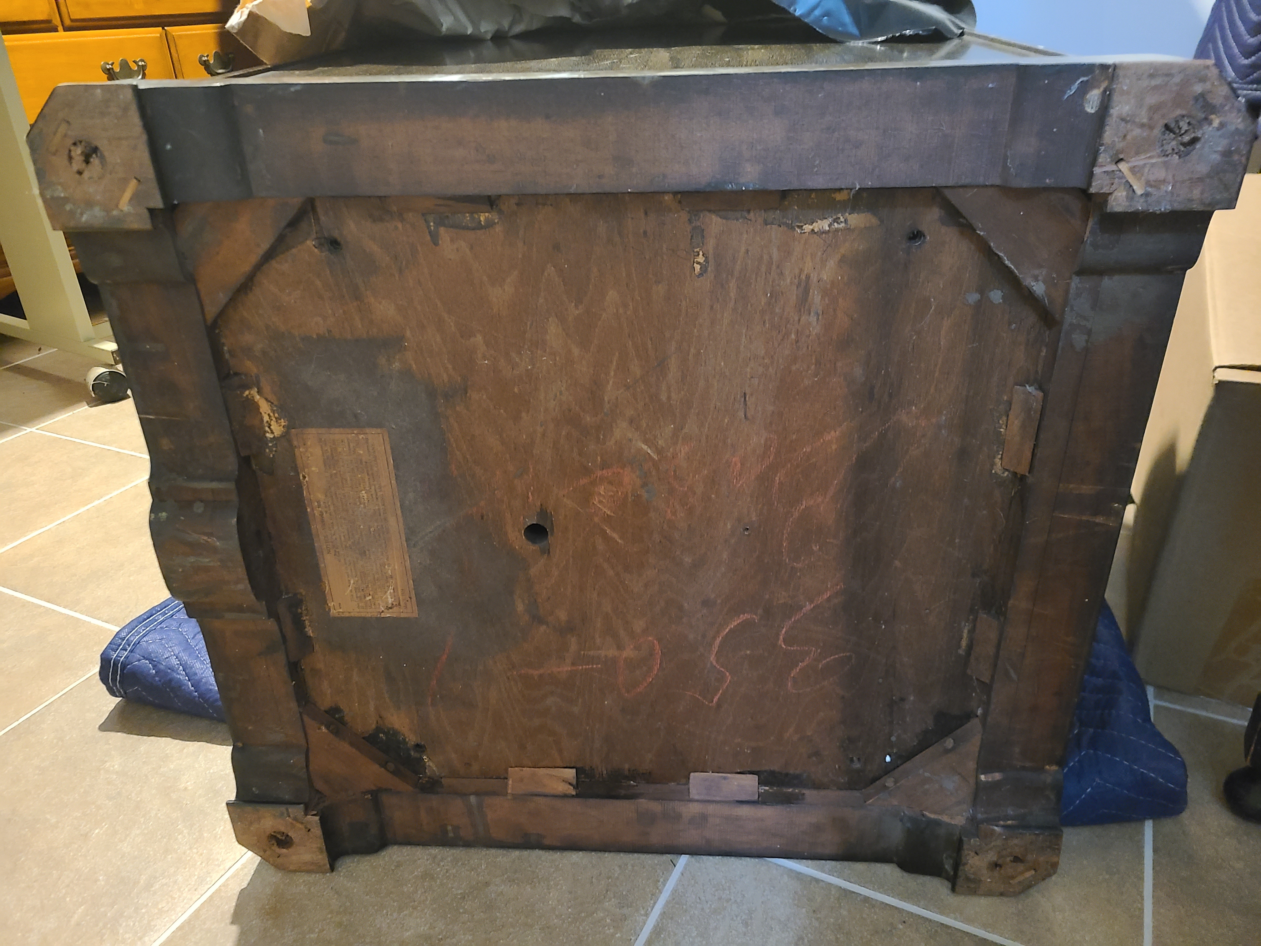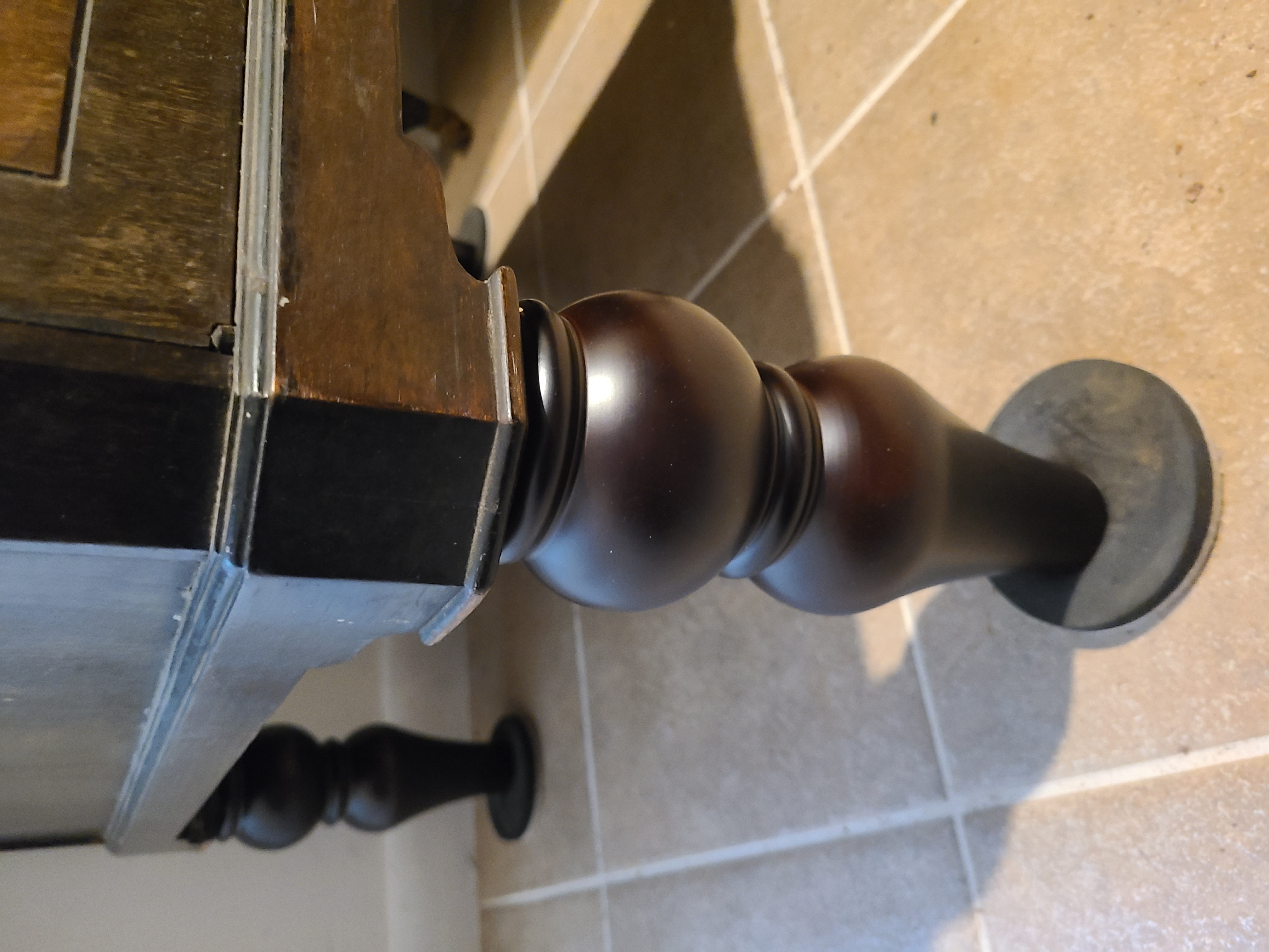 This would make a local cabinetmaker very happy to work on, by the way--a bit of work with a lathe would be pretty effective to make some new legs.