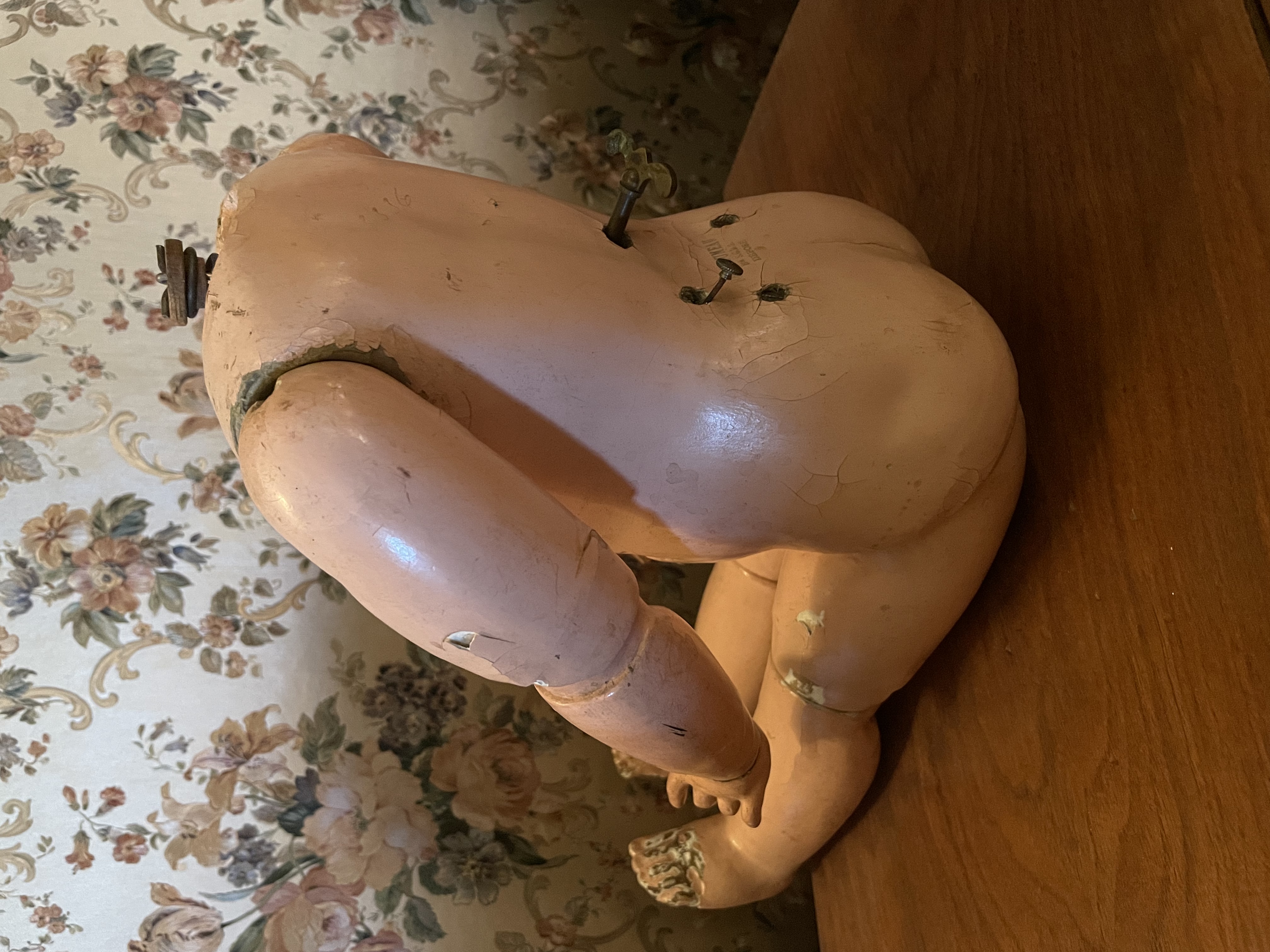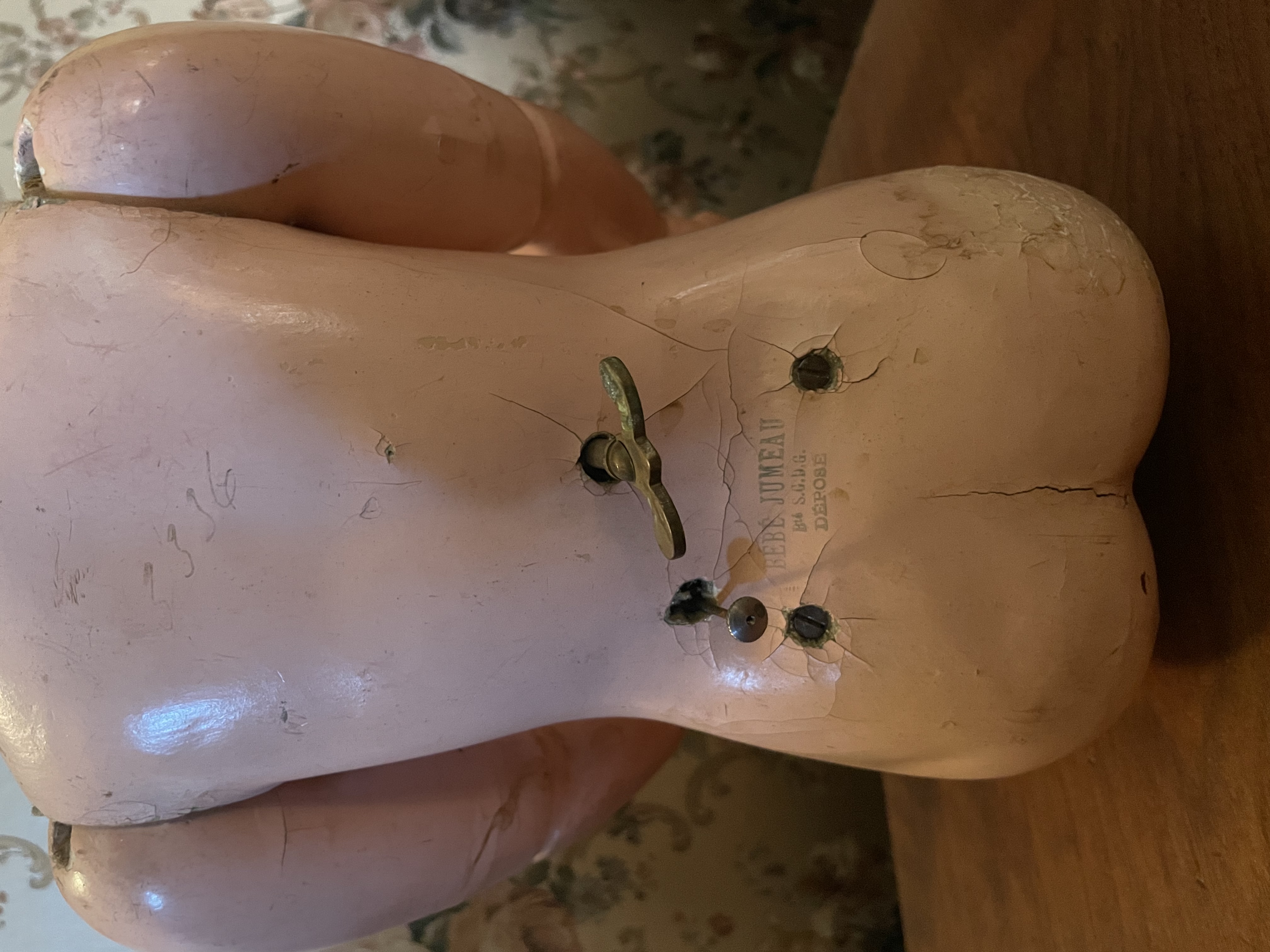 Offering a Jumeau Phonograph Doll complete with mechanism and record. As found, without head. Front plate missing. All original with working mechanism and record. Body in good condition for it’s age, no broken toes or fingers. Circa 1892.