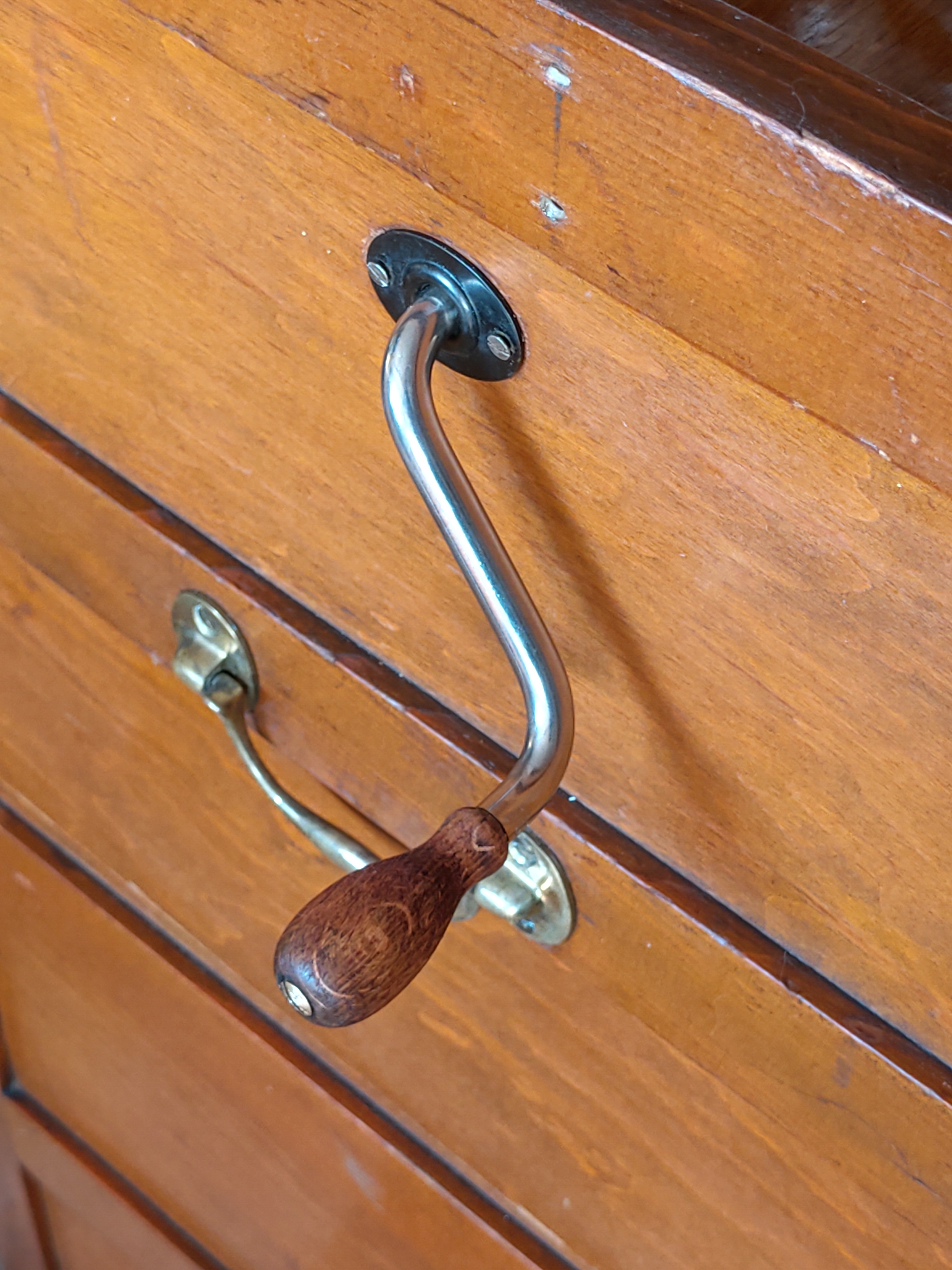 What I'm saying was not original... But the winding handle would look much better if you would peel off the black paint and refinish the wooden handle in natural wood tone. You can apply some boiled linseed oil, which polishes the wood while giving it a wonderful obscure and warm wooden look, that of wet wood. Then use clear wax.