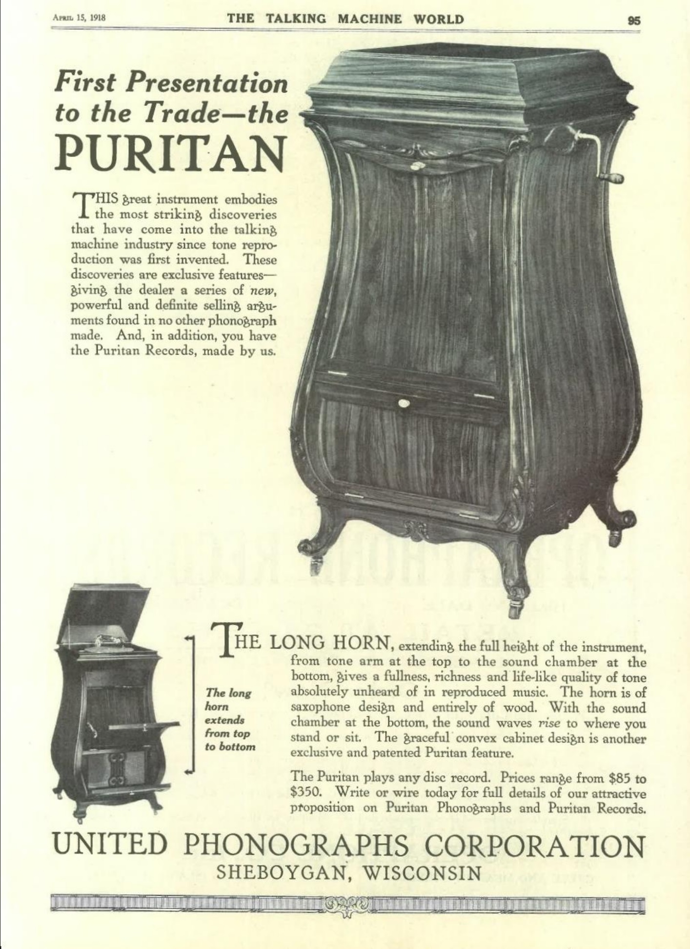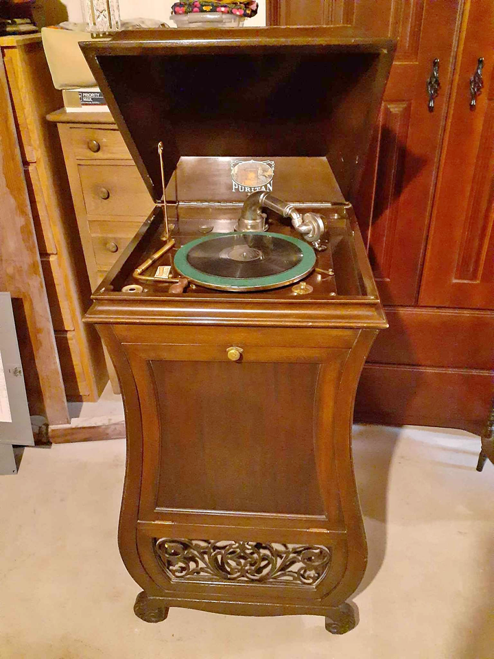 I'm thinking, had they designed the horn with two openings--one at the top and one at the bottom, or even a double horn, the sound would have been greatly improved, based on the couple of Puritan phonographs I've heard. But to be fair, it's not too bad if you have bare hardwood floors, and stand some distance away.