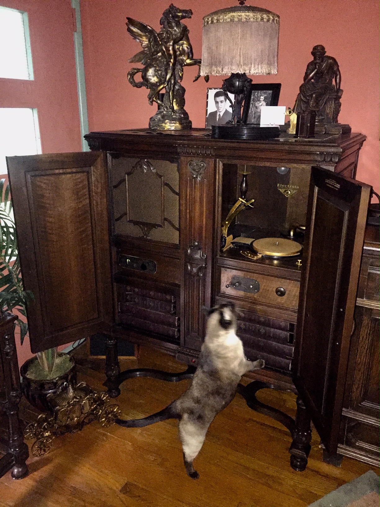 I’ll bite. My 8-12 is American Walnut and has gold plated hardware and original felt and grill cloth, (and finish). I was lucky in that I bought it with an original, Brass reproducer, (same as the early Credenza reproducer, I assume that someone changed it out). It is a very tasteful design and very nice for playing electronically recorded records. It’s more compact than a Credenza, (and in my opinion anyway, better looking), but it can still fill a room with nicely reproduced sound. I think that it looks great for 94 years old.