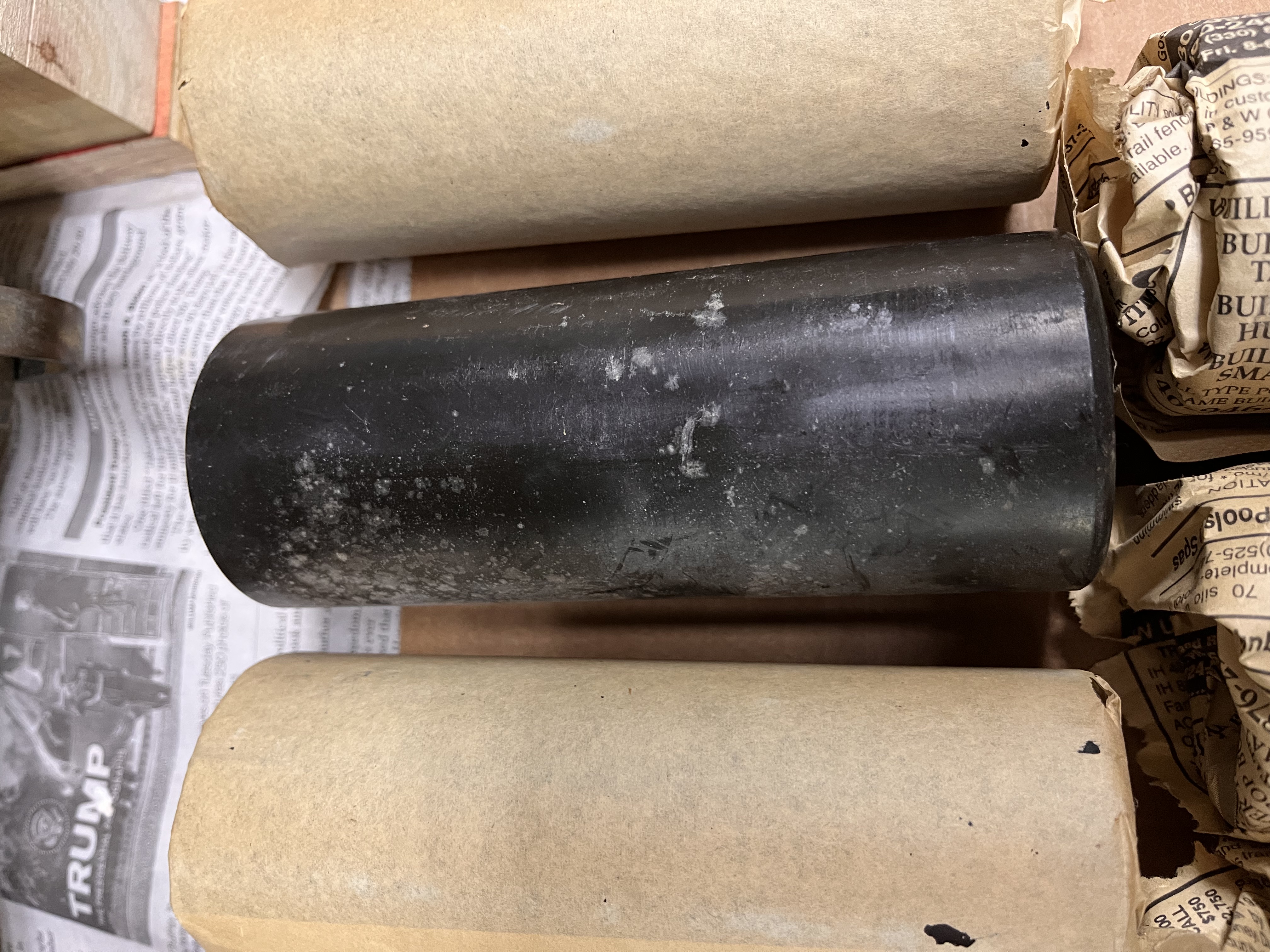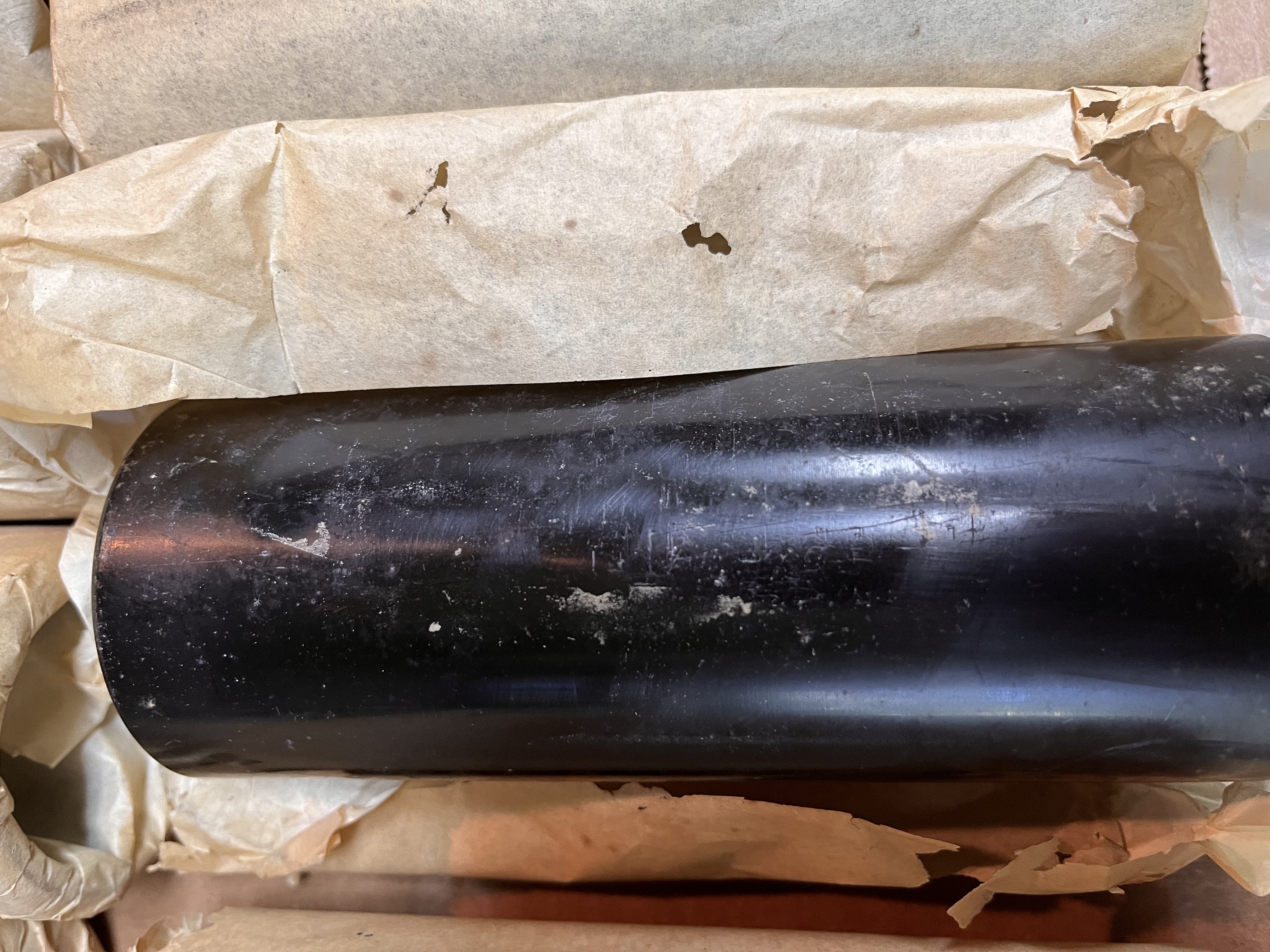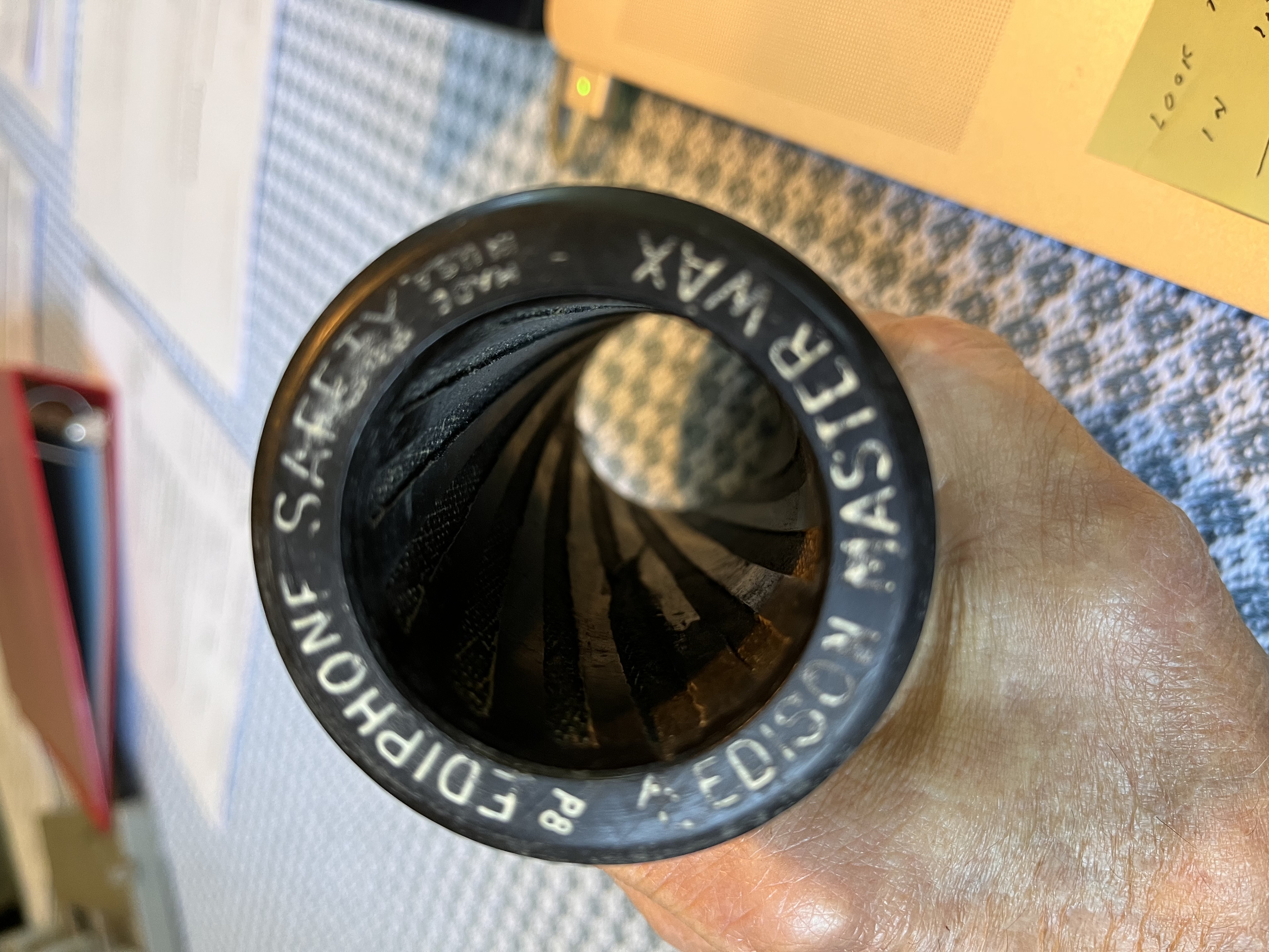 This is a nice group of Ediphone cylinders labeled "Edison Master wax". There are 12 unused ones and 5 used ones. There is some very light surface mold on most , but it is very light and not into the wax surface. It does clean off. The mold does not cover the whole cylinder but only a strip along the side. A couple of them have some dings, Most of the unused ones are still wrapped in the original vellum. The used ones are wrapped in newspaper. As you would expect, they fit on a standard mandrel. I assume they would also fit on the longer mandrel of the Columbia long cylinder machines. That said, they are thicker than a standard cylinder and would cause problems with the stylus of a non-business machine. If you have a business machine in your collection, this is what you need. They are also very good for display.
