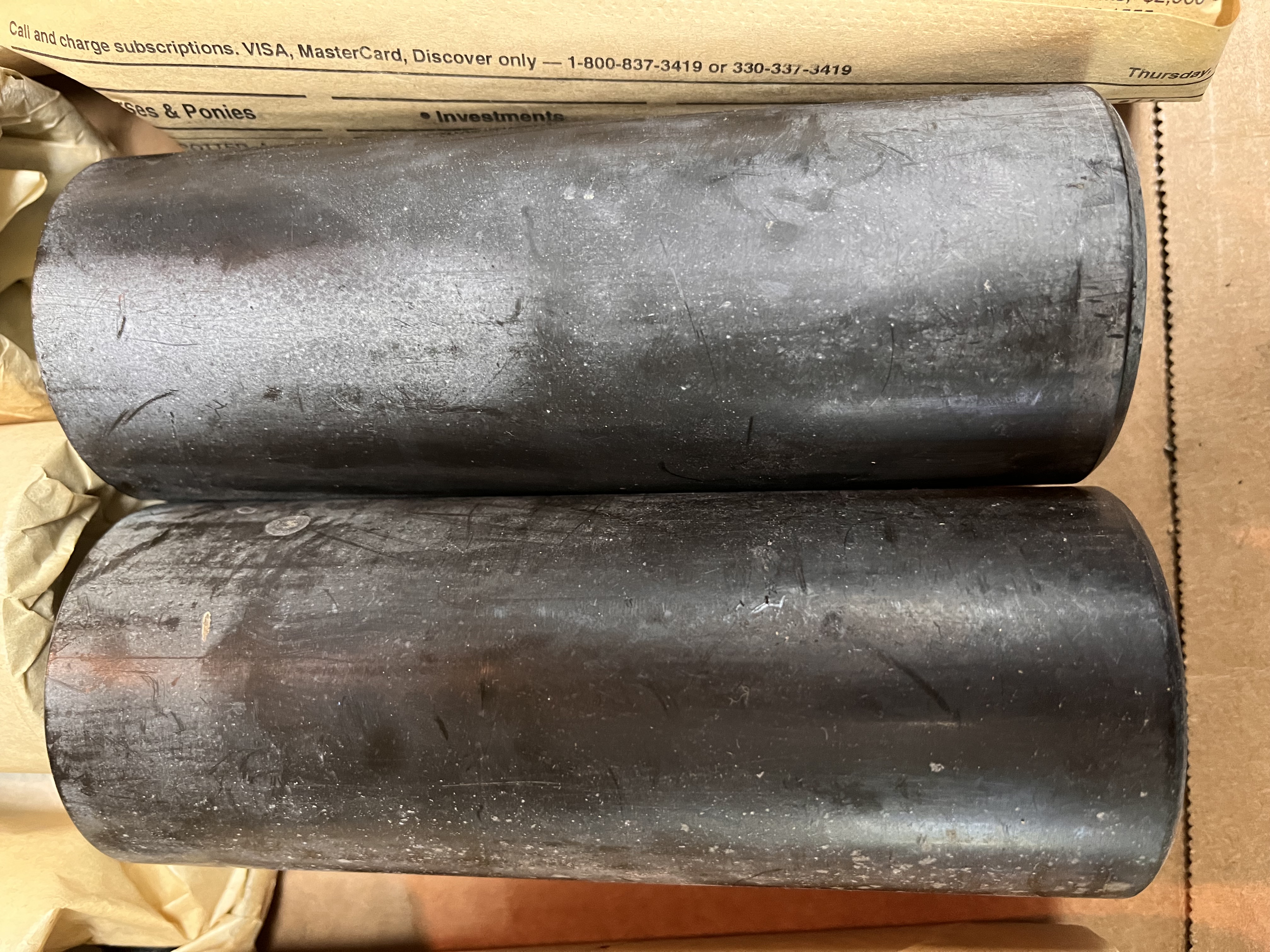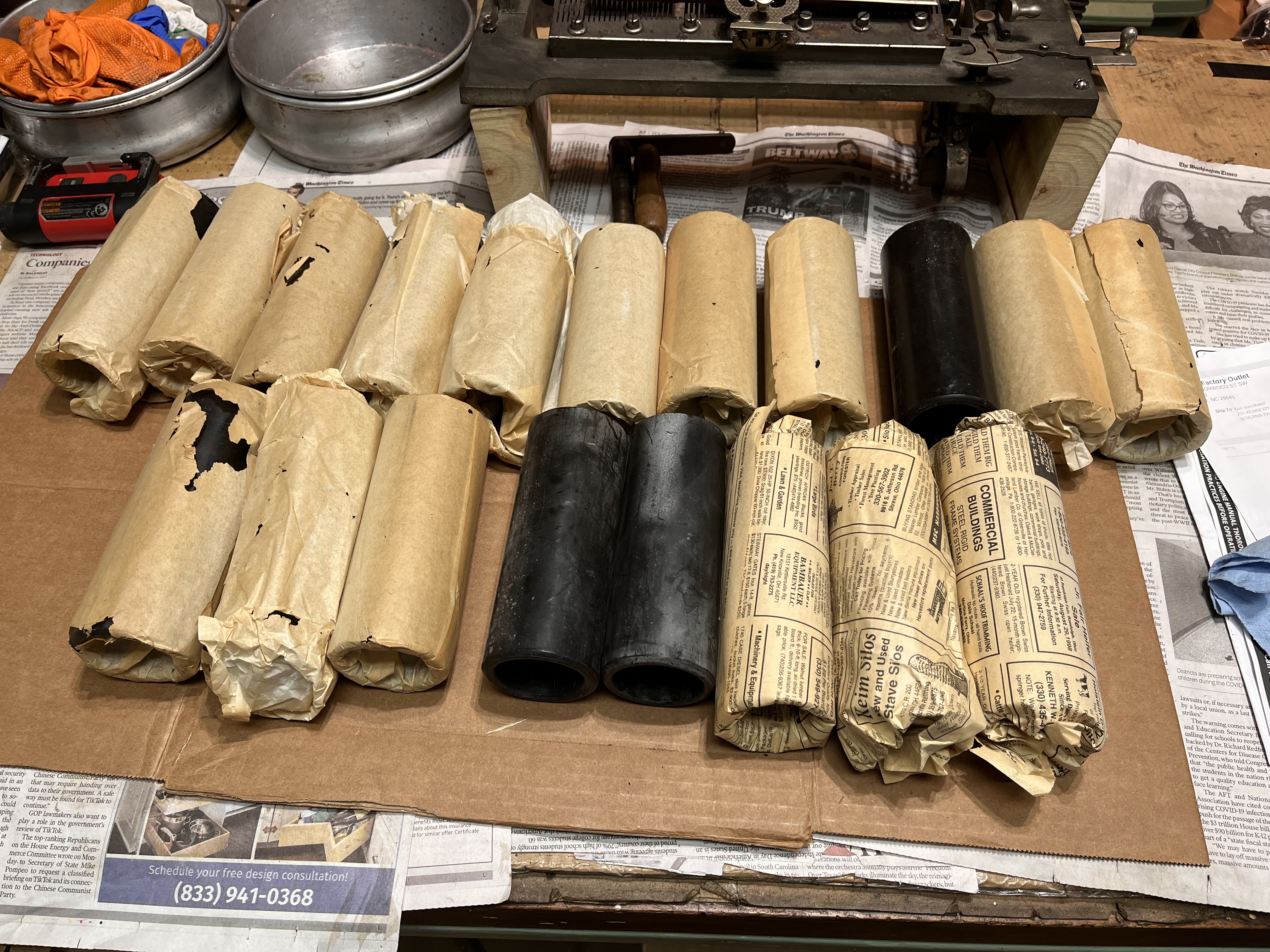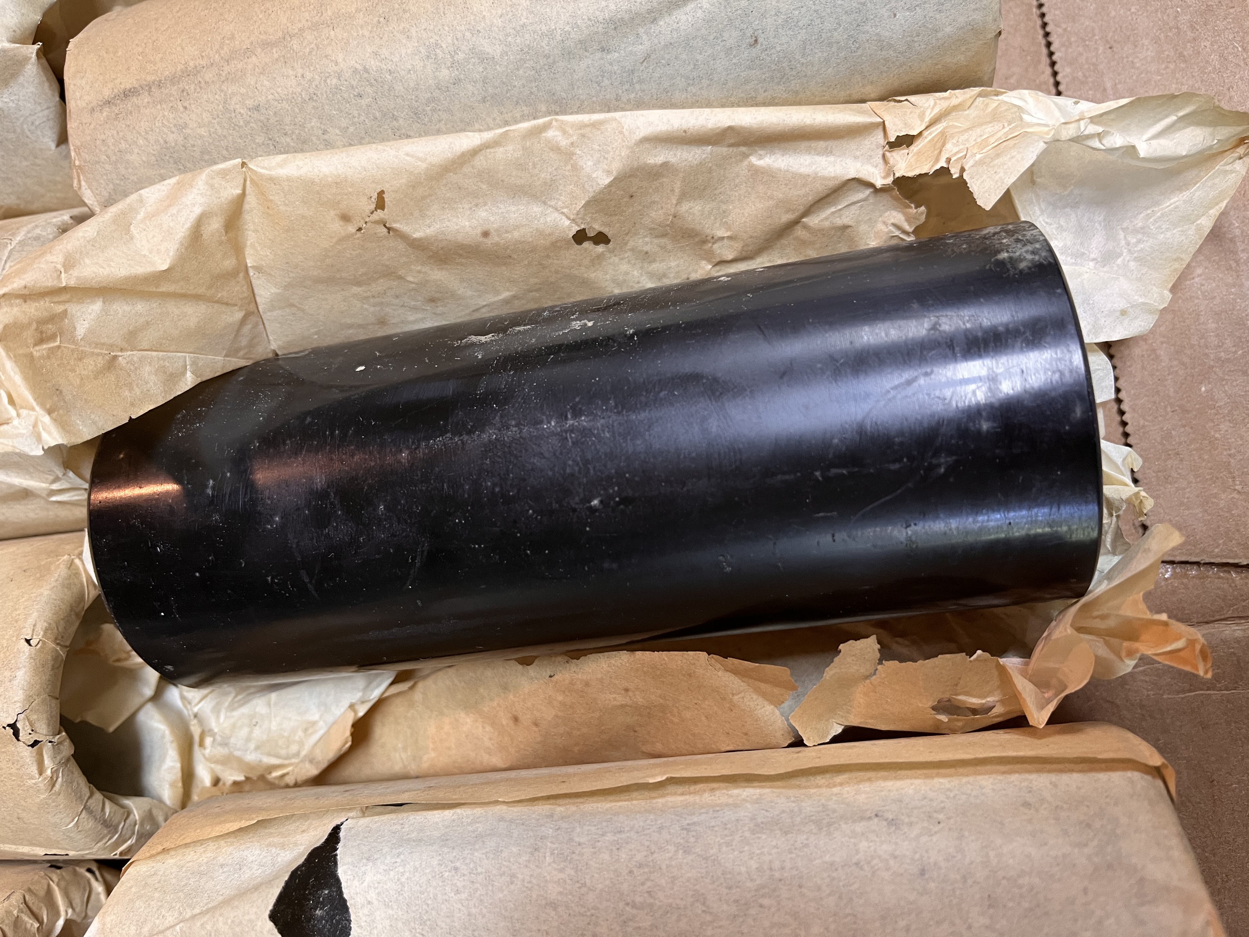 This is a nice group of Ediphone cylinders labeled "Edison Master wax". There are 12 unused ones and 5 used ones. There is some very light surface mold on most , but it is very light and not into the wax surface. It does clean off. The mold does not cover the whole cylinder but only a strip along the side. A couple of them have some dings, Most of the unused ones are still wrapped in the original vellum. The used ones are wrapped in newspaper. As you would expect, they fit on a standard mandrel. I assume they would also fit on the longer mandrel of the Columbia long cylinder machines. That said, they are thicker than a standard cylinder and would cause problems with the stylus of a non-business machine. If you have a business machine in your collection, this is what you need. They are also very good for display.