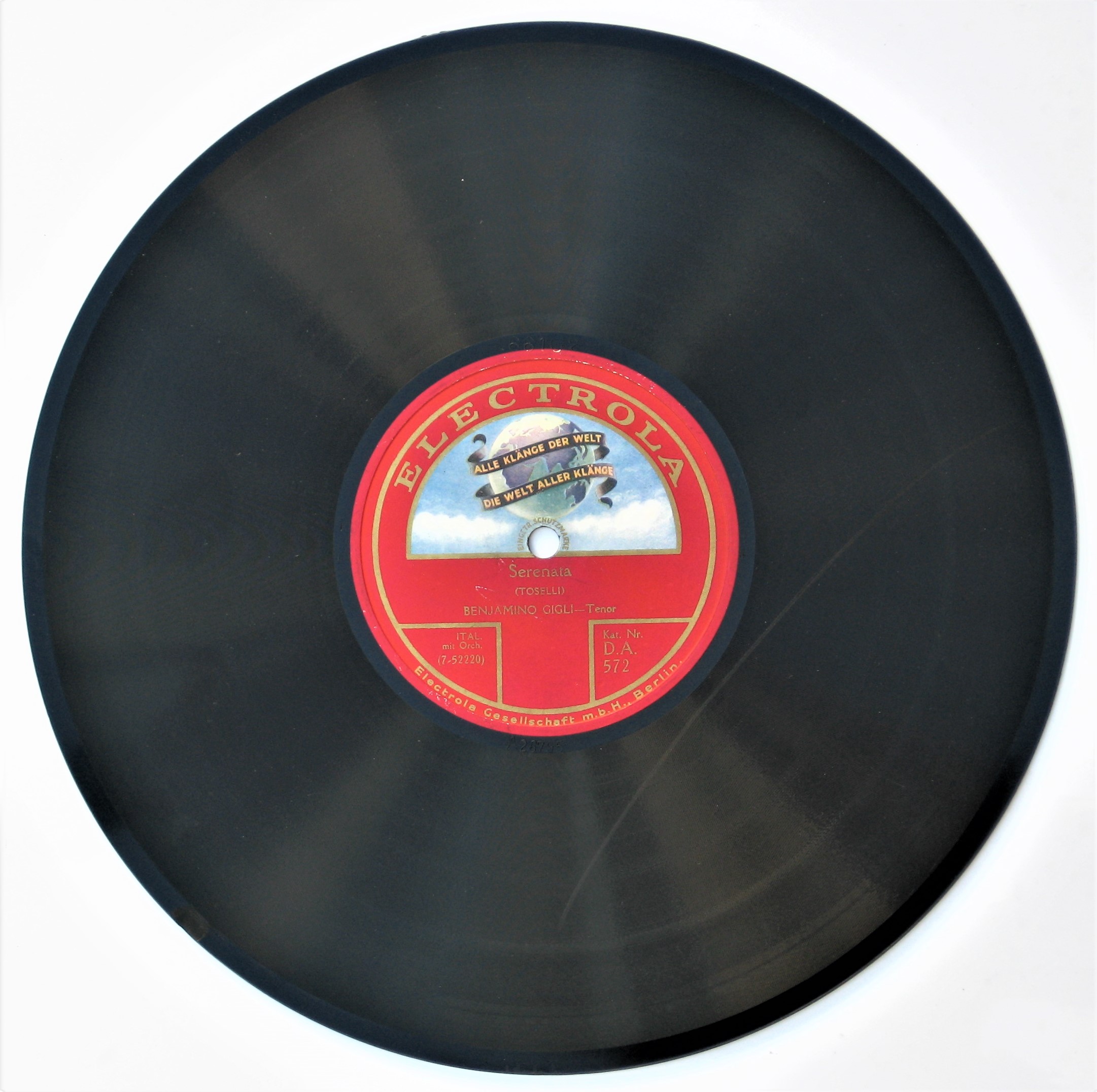 My latest record haul includes three acoustic Elecrolas, two by Caruso and one by Gigli. Each record has an identical light scratch on one side only, as pictured.