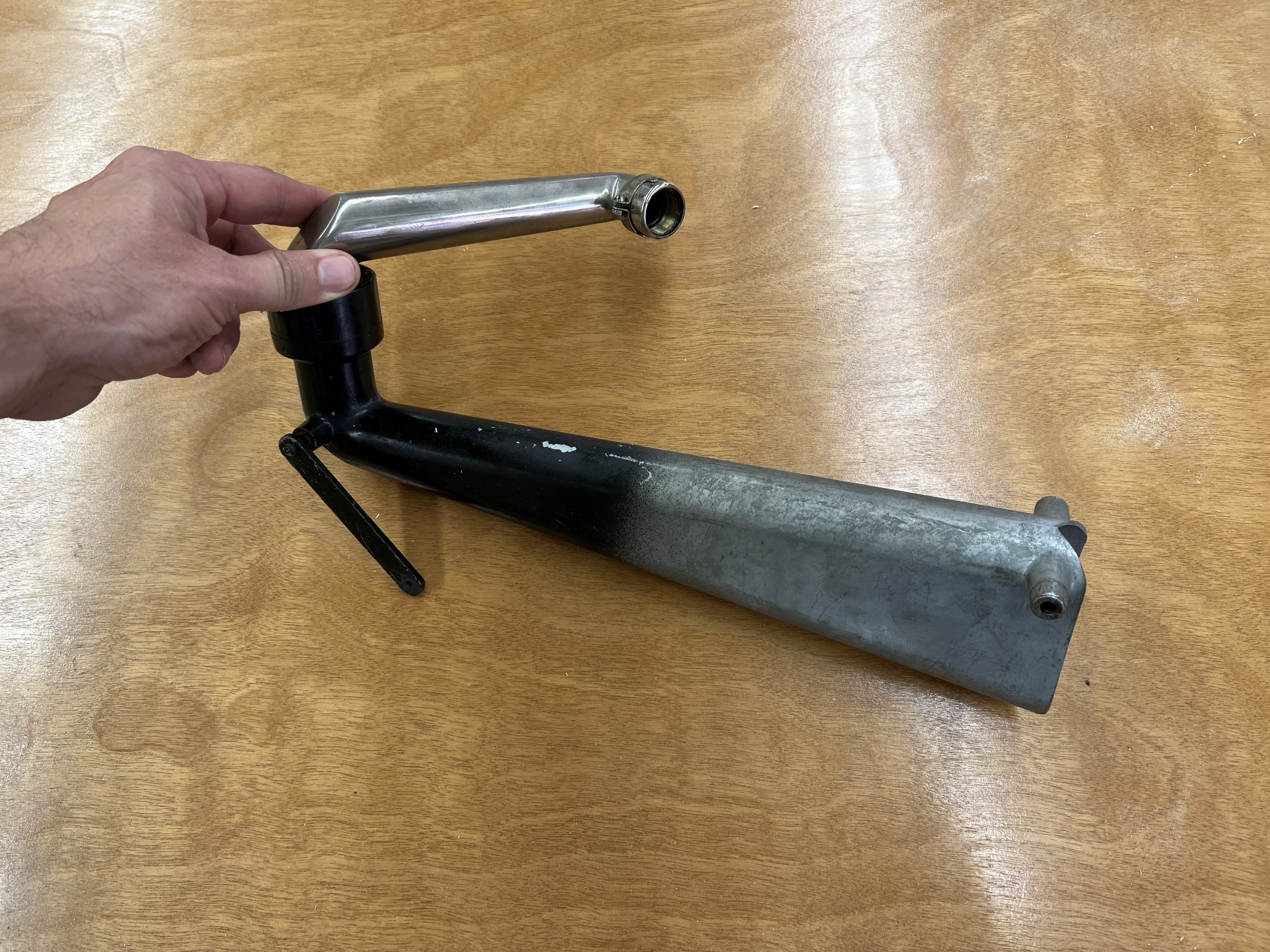 When I took the horn apart I noticed that the fixed support had come loose, so I used a piece of wood and a clamp to hold it in place, and some MG120 silver bearing solder to repair the cracked area. It got a little messy, since my iron would produce quite enough heat for the job, but hopefully it holds. This solder and the flux that comes with it do a phenomenal job on old metal like this. My usual go to is plumbers solder, but it doesn’t flow do well in zinc and steel. This silver solder works like a dream, though.