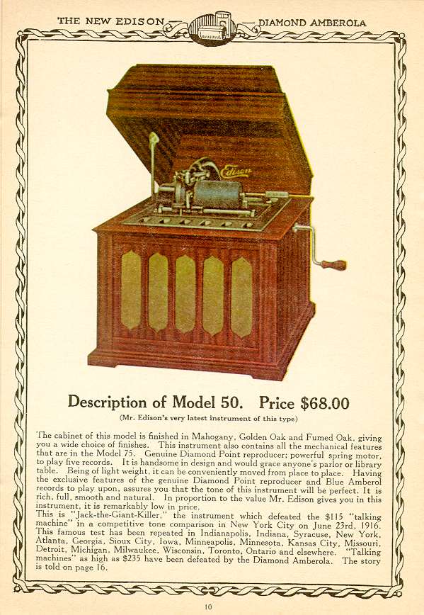 A few original Edison Amberola 50 Ads.... from 1917-1919. Note the $68.00 Price tag instead of the Original $50.00 due to WW1 "War Tax" price hikes from President Woodrow Wilson. The U.S. entered WW1 over in Europe in 1917. The Amberola 50 as well as the Amberola 75 were all sold in three distinct finishes: Golden Oak, Fumed Oak, and Mahogany finish. It also had a Dual Mainspring setup just like the Amberola 75 and they would both play 5 cylinders on a single full winding. To contrast, The Amberola 30 had a Single Mainspring setup and would play 3 cylinders on a single full winding, and was only sold in Golden Oak and Fumed Oak finishes.
