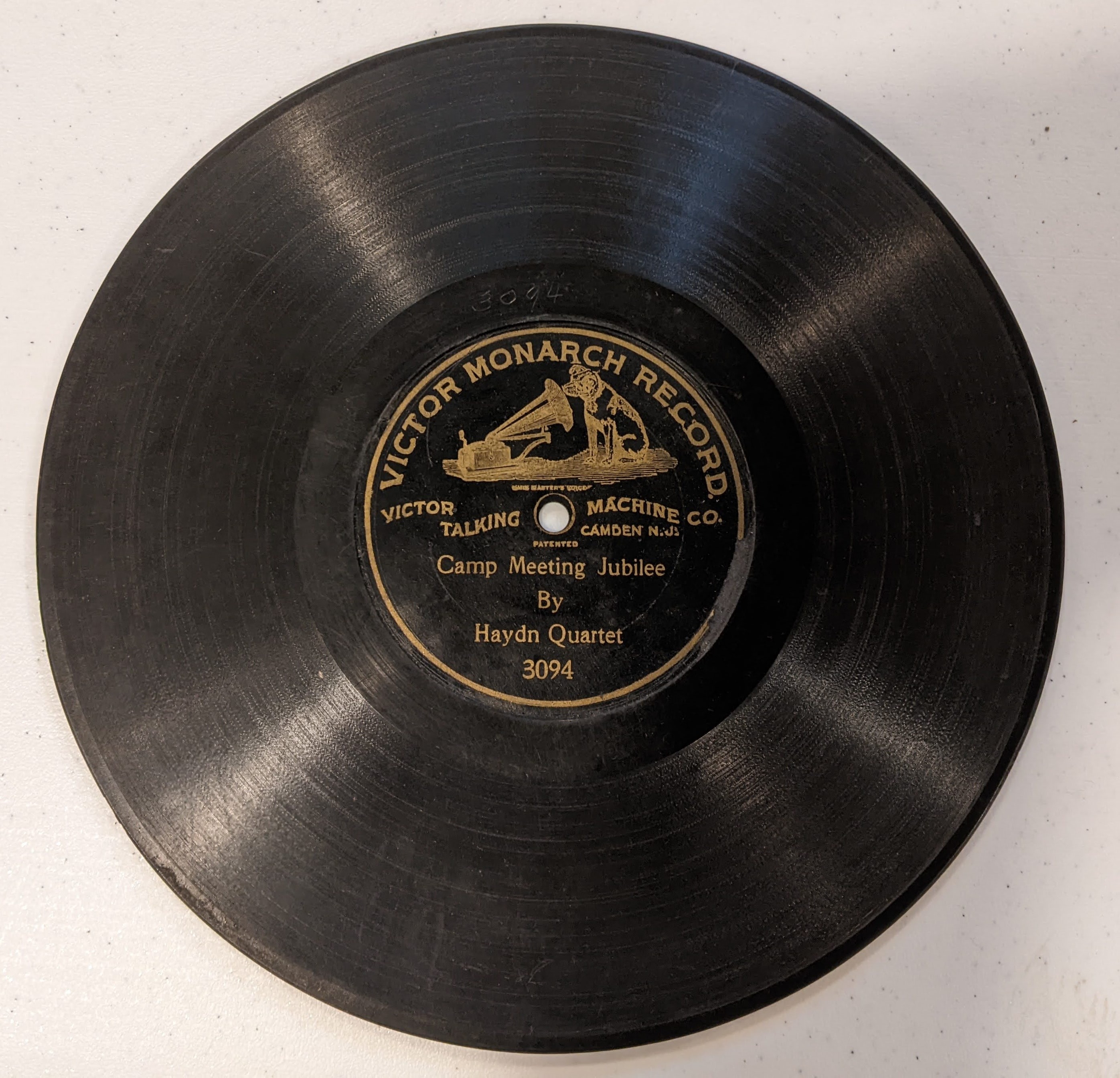Nice example of an early single-sided Victor Monarch - Camp Meeting Jubilee by the Harden Quartet. Nice example, as with most of these, some expected surface noise.