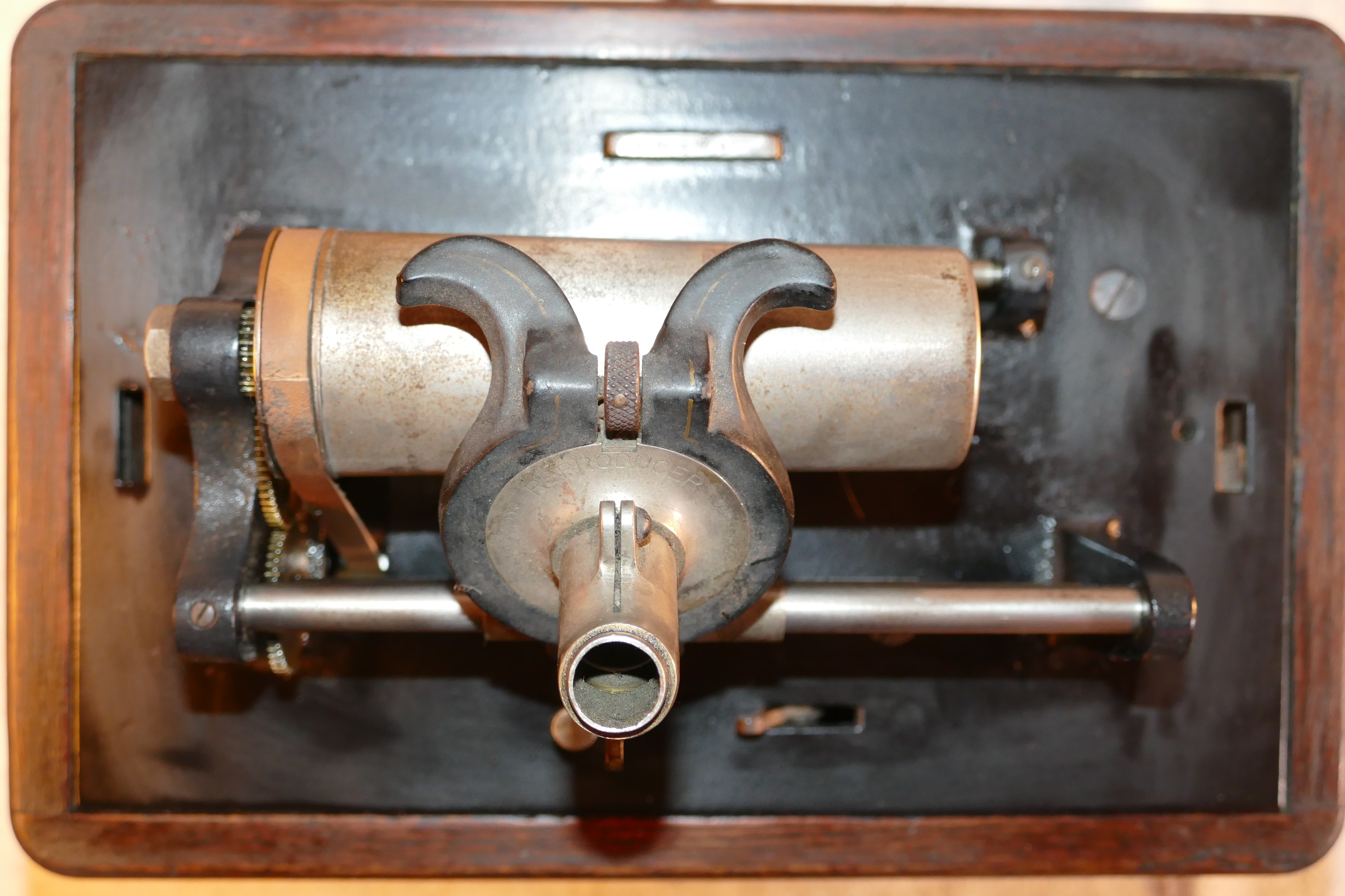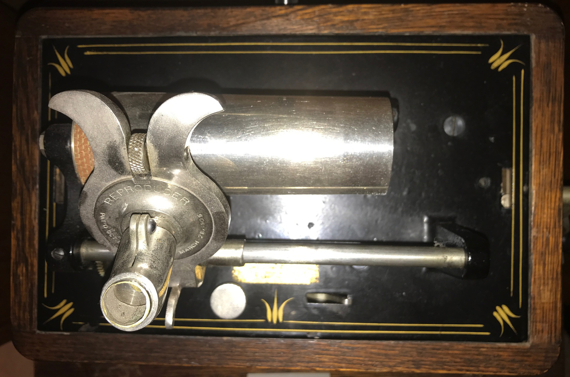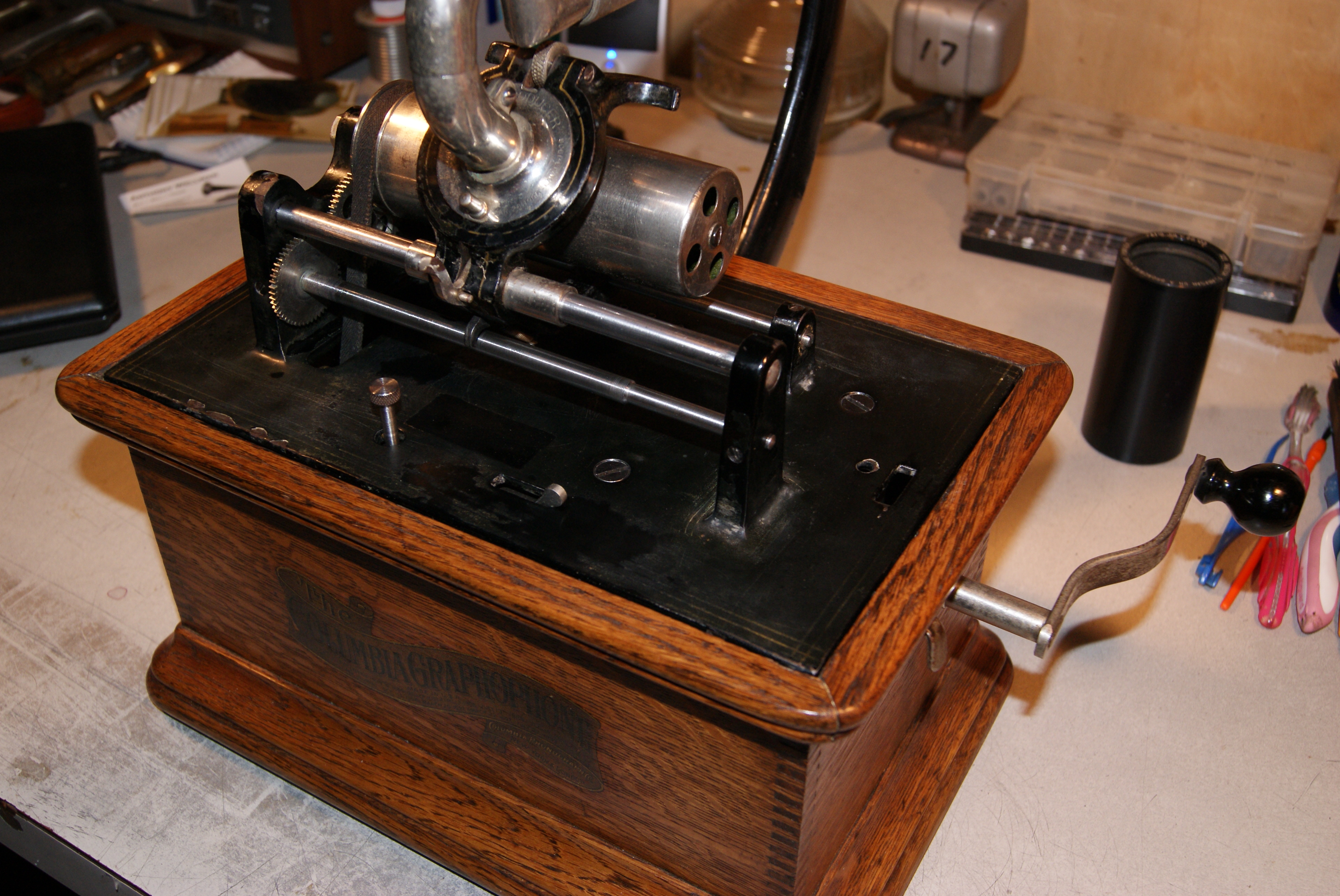 The pinstriping on mine (SN 76,269) is quite different than Chuck's, being ornamented with simple straight lines and the ubiquitous Graphophone decal (as can be faintly seen after I carefully cleaned the bedplate). I had the bedplate refinished, and the pinstriping and decal expertly reapplied by our own phonogfp.