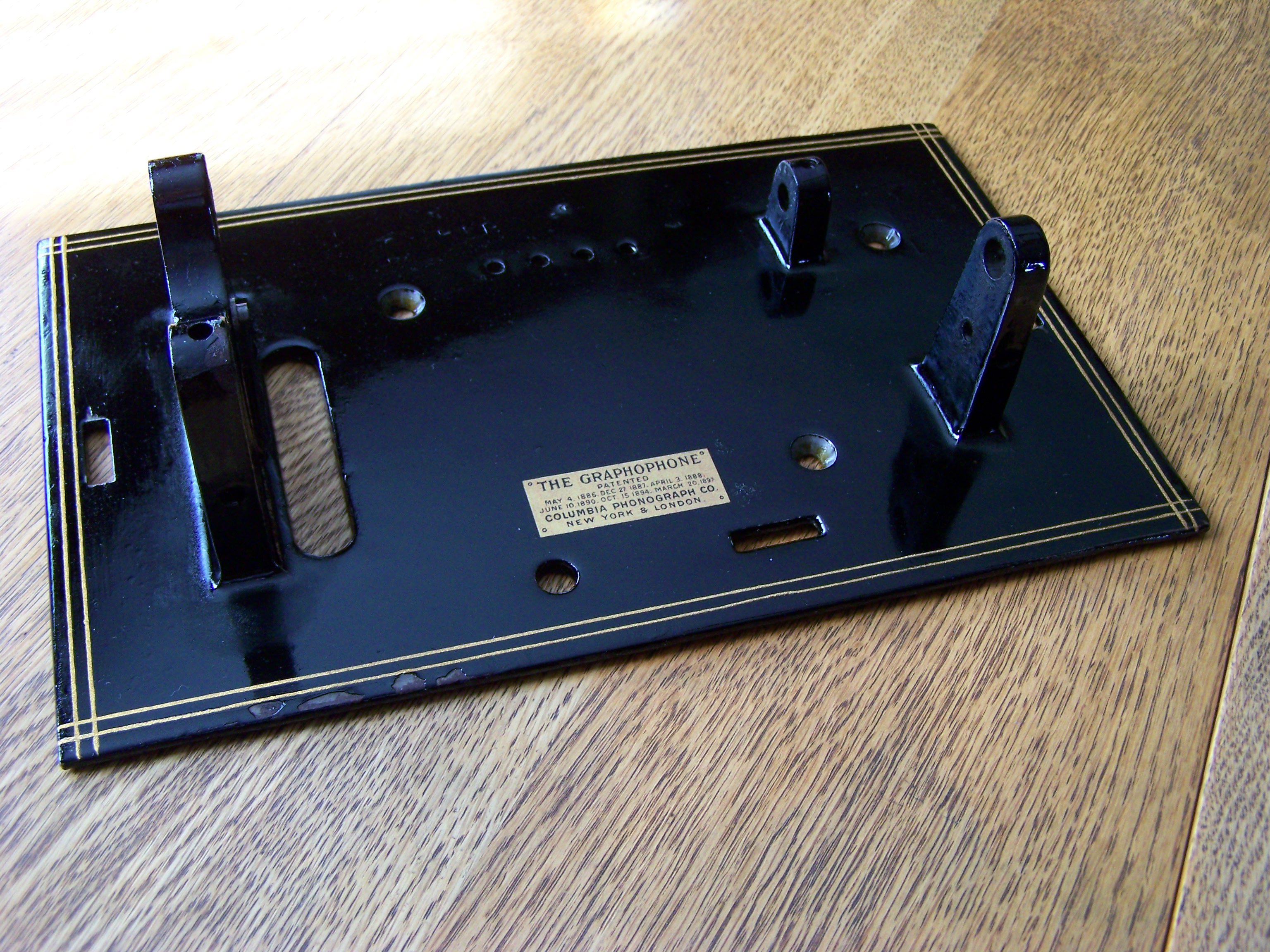 The pinstriping on mine (SN 76,269) is quite different than Chuck's, being ornamented with simple straight lines and the ubiquitous Graphophone decal (as can be faintly seen after I carefully cleaned the bedplate). I had the bedplate refinished, and the pinstriping and decal expertly reapplied by our own phonogfp. Cheers,