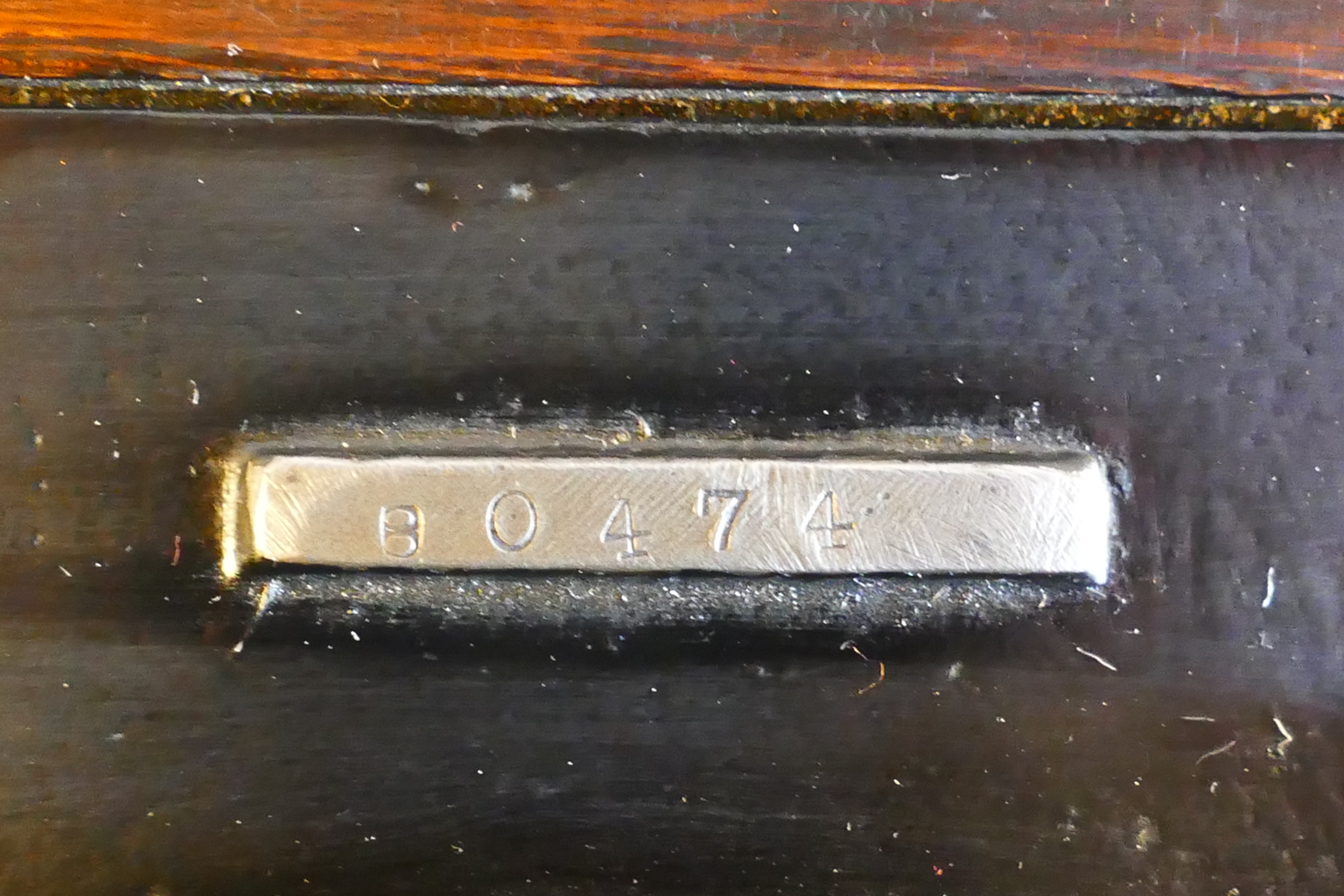 Thanks, Chuck and Fran. I misspoke when I wrote that the bedplate was missing close to 100% of its striping and decals -- in fact, it IS missing 100% of both. Oddly, the striping on the carriage is still there, more or less, but the bedplate is so black it makes me wonder if this one left the factory without any. (Of course, I doubt Columbia would have sent one out without their name decal on the bedplate, too, but who knows?) I've included a picture of the serial number plate, too -- I think that first digit is an "8", but I wouldn't bet the farm on it. Do you think this one would have had the later style of striping? (I actually like that kind better, to be honest.) Does anyone actually sell transfers in that design?
