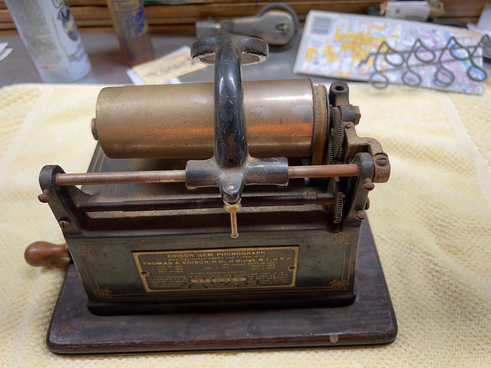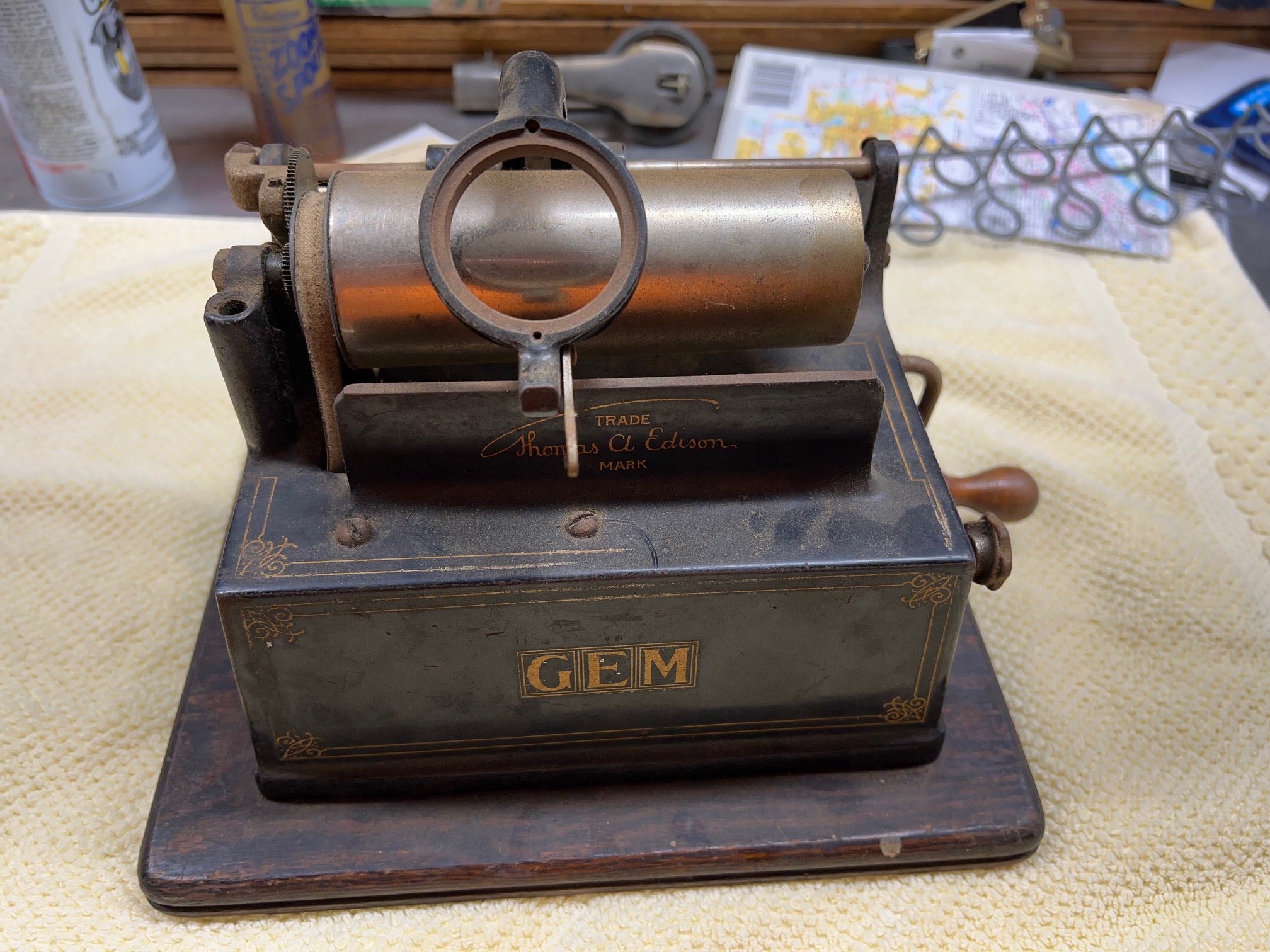 I have for sale a Edison Gem. What you see is what you get. The motor winds and runs. It has a 2/4 minute gear change option. The stenciling on the case is in very good shape. There is no cover, reproducer, or horn. I am asking $250 plus actual shipping cost. I don't charge for any packing materials.