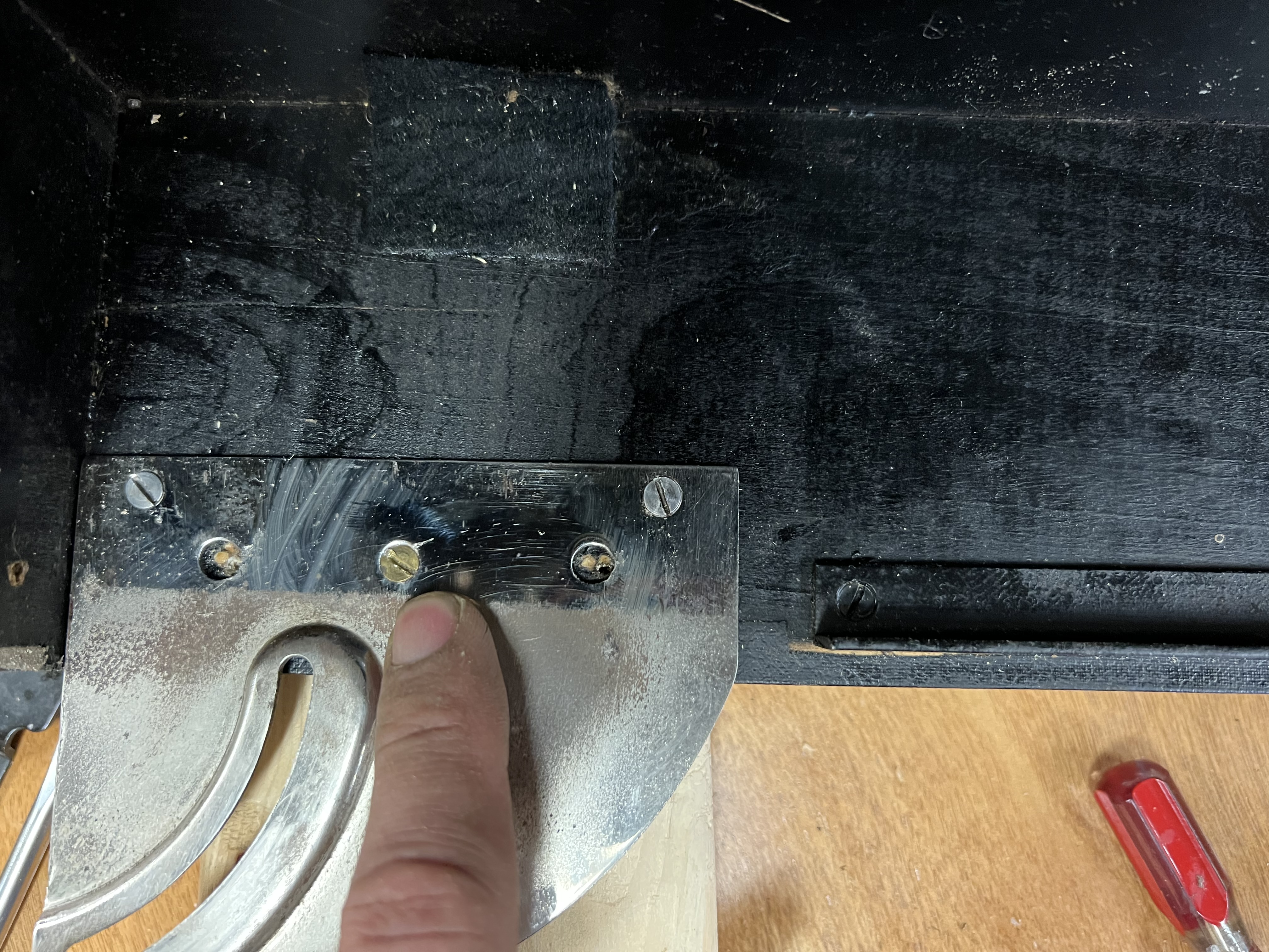 The last thing I did while installing the hardware on the case, was re-drill holes that were loose, after plugging the old holes earlier in the morning. I dripped some thin easily flowing super glue down in the holes I did not re-drill in order to reinforce them. For some reason the third screw that holds the plates was not originally used, so after finding a suitable replacement in a box of random hardware I rescued some years ago, I drilled a pilot hole and added the third screw to the plate. This plate helps focus the sound, but most importantly it is used to support the lid when it is opened and the tone arm when it rises up with the lid. I figured the extra screw could only help keep this part of the case stable and sturdy.