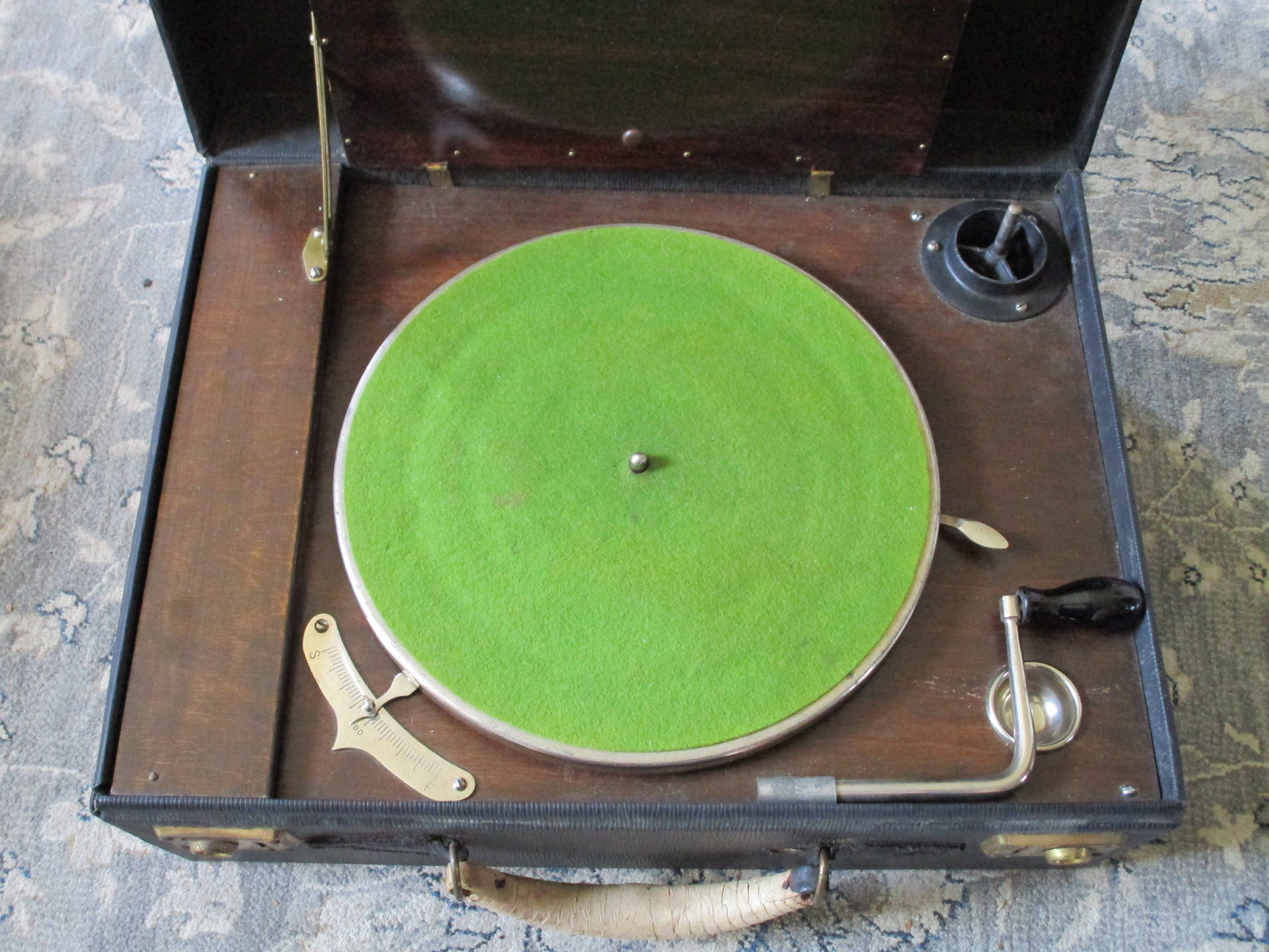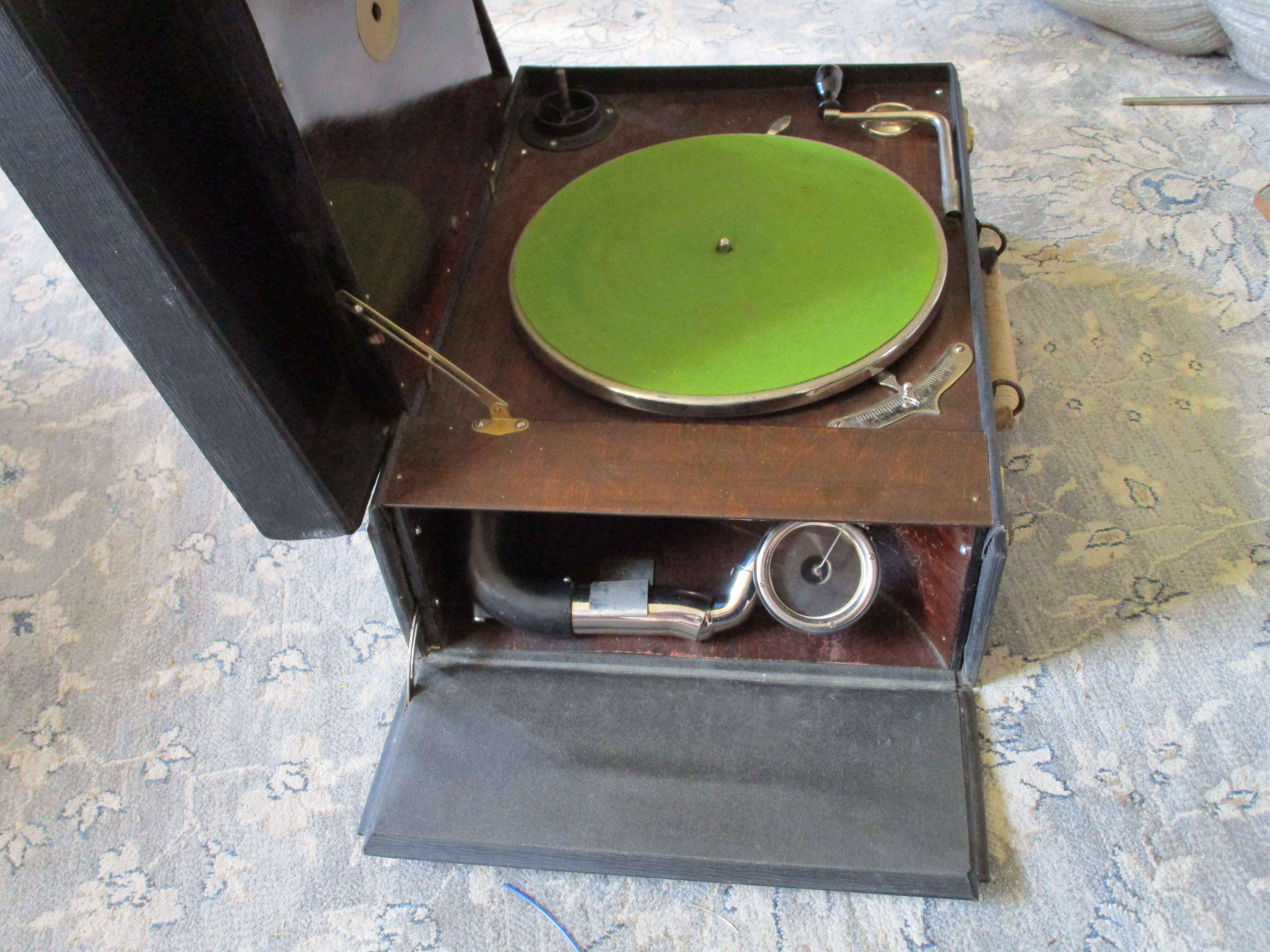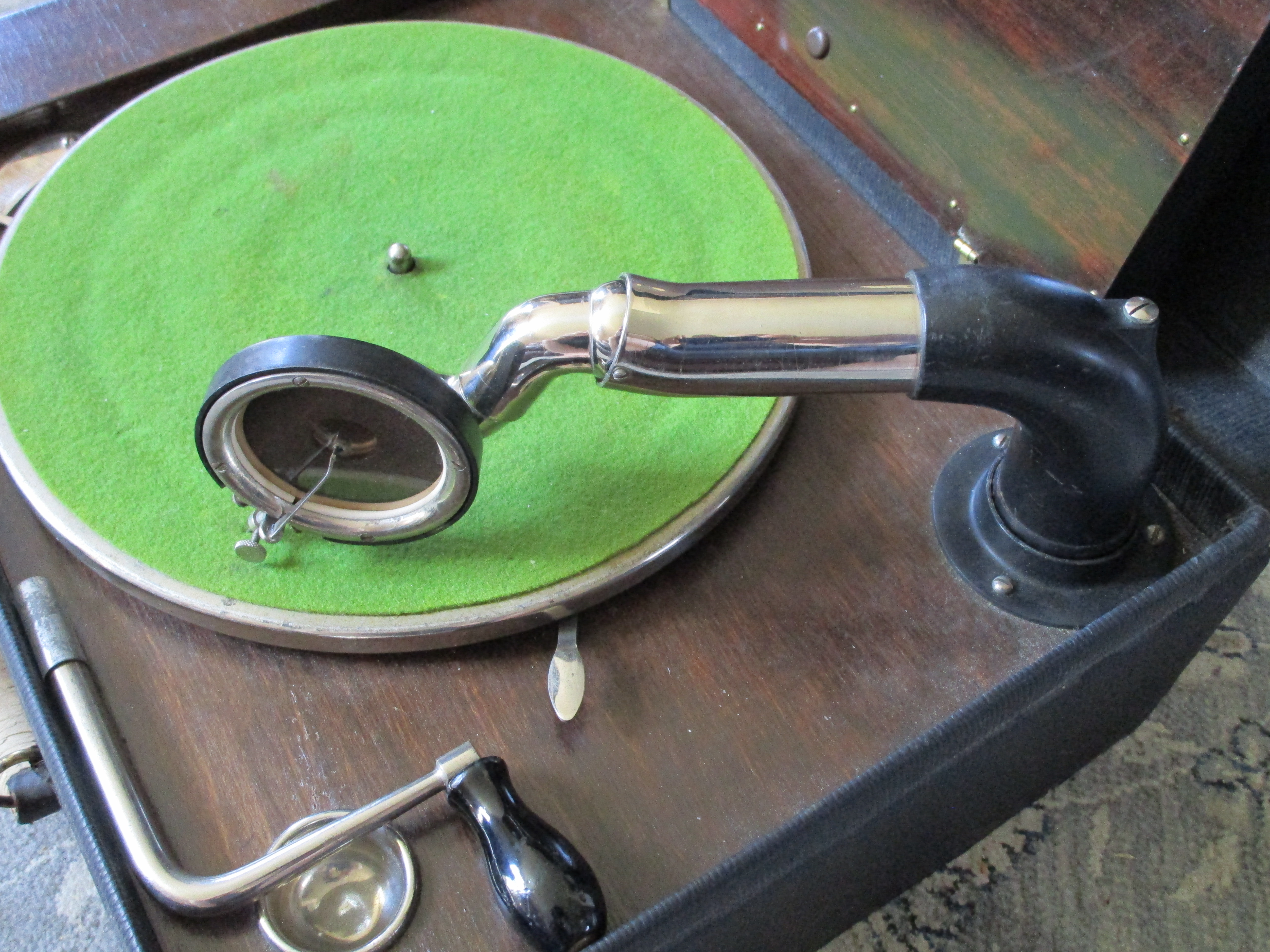 This phonograph has been extremely well cared for. The motor runs whisper quiet and perfectly true to 78rpm speed. The original leatherette covering is in overall amazing condition. The original nickel plating is excellent. The original reproducer and diaphragm are excellent. The sound produced by this phonograph is simply AMAZING! (Please play the video to see and hear for yourself!)