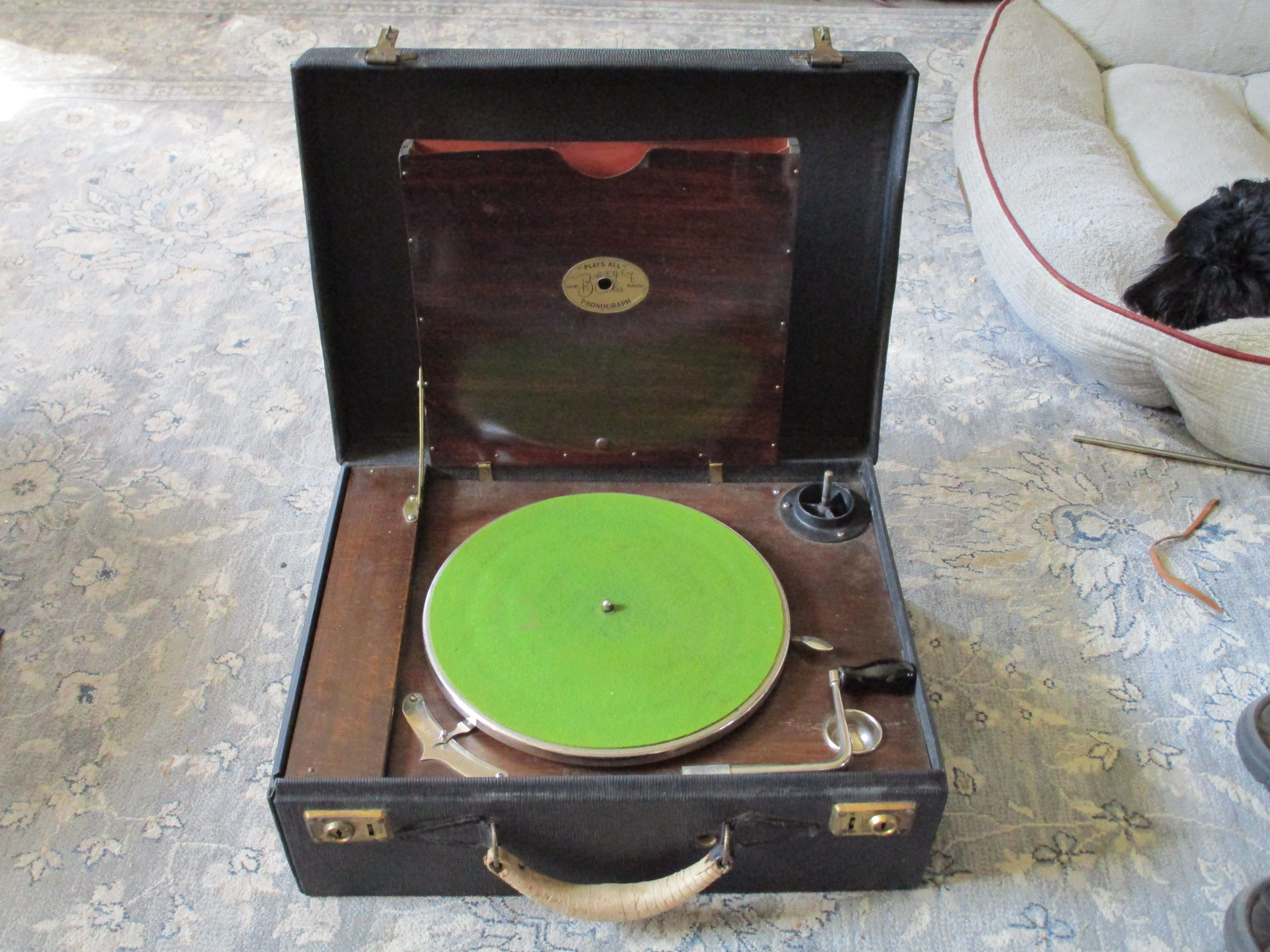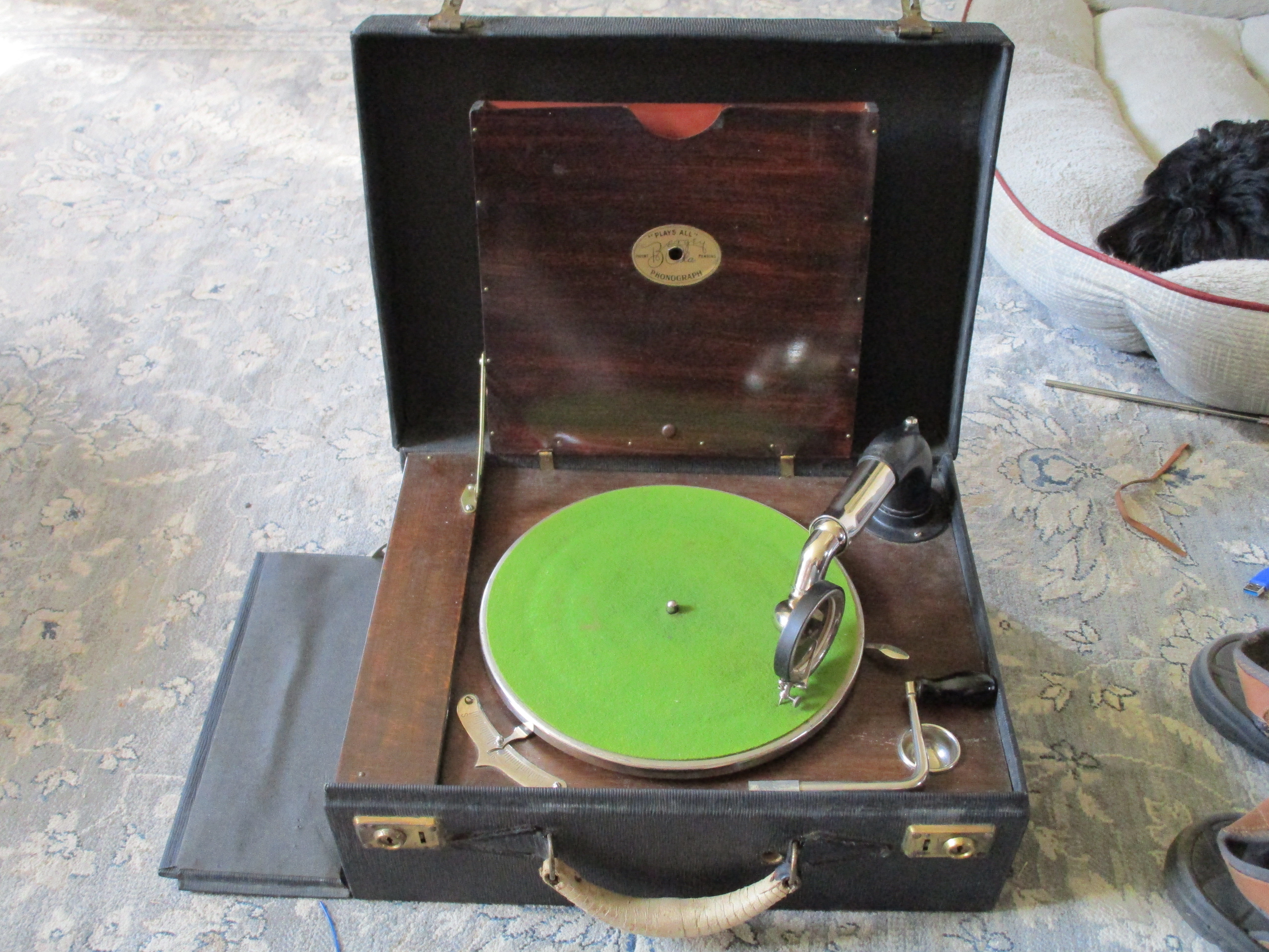 2) the inside compartment where the tonearm and reproducer are stored has needle scrapes from the original U.S. Liberty Driver replacing the tonearm assembly over time during use