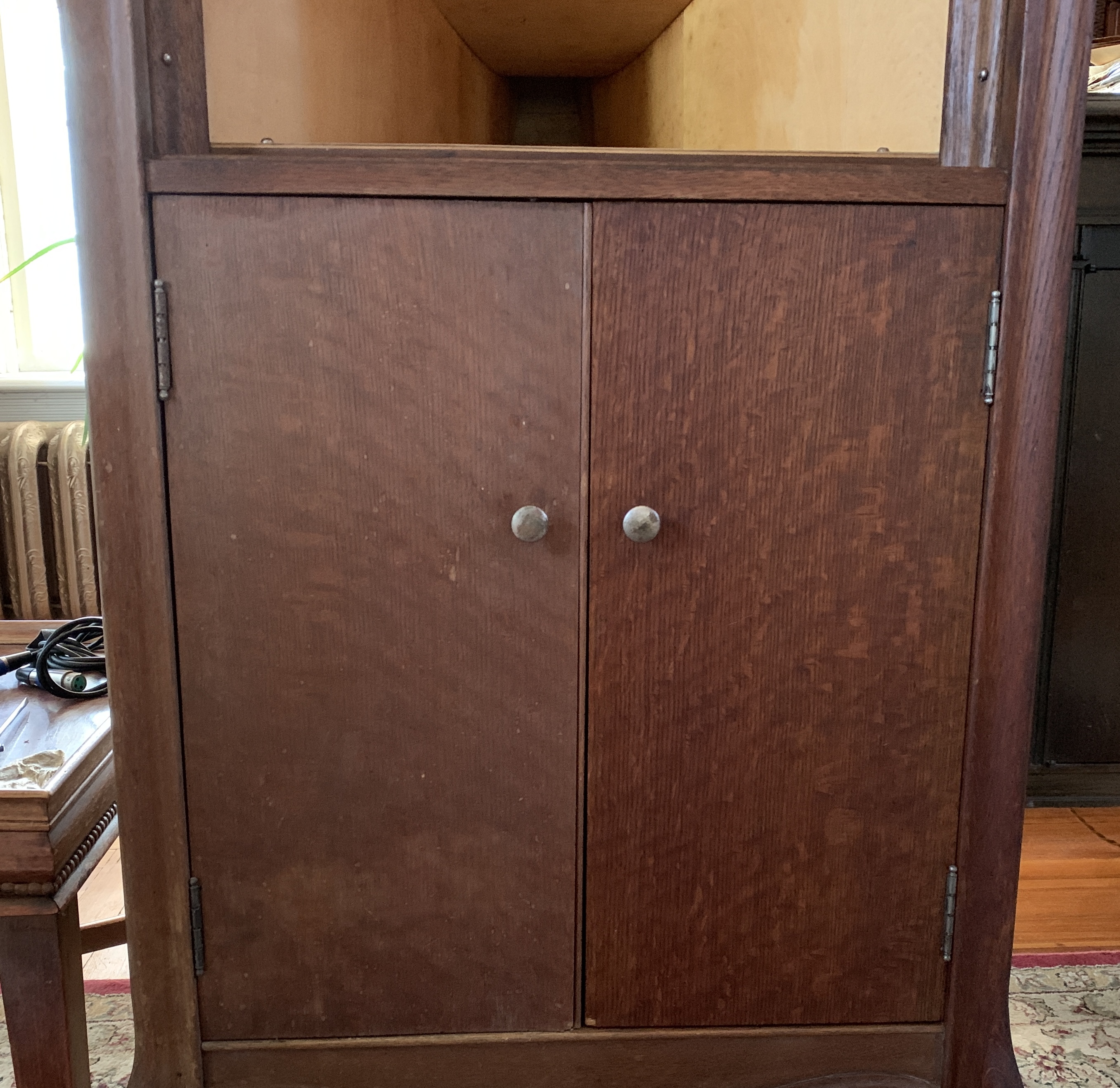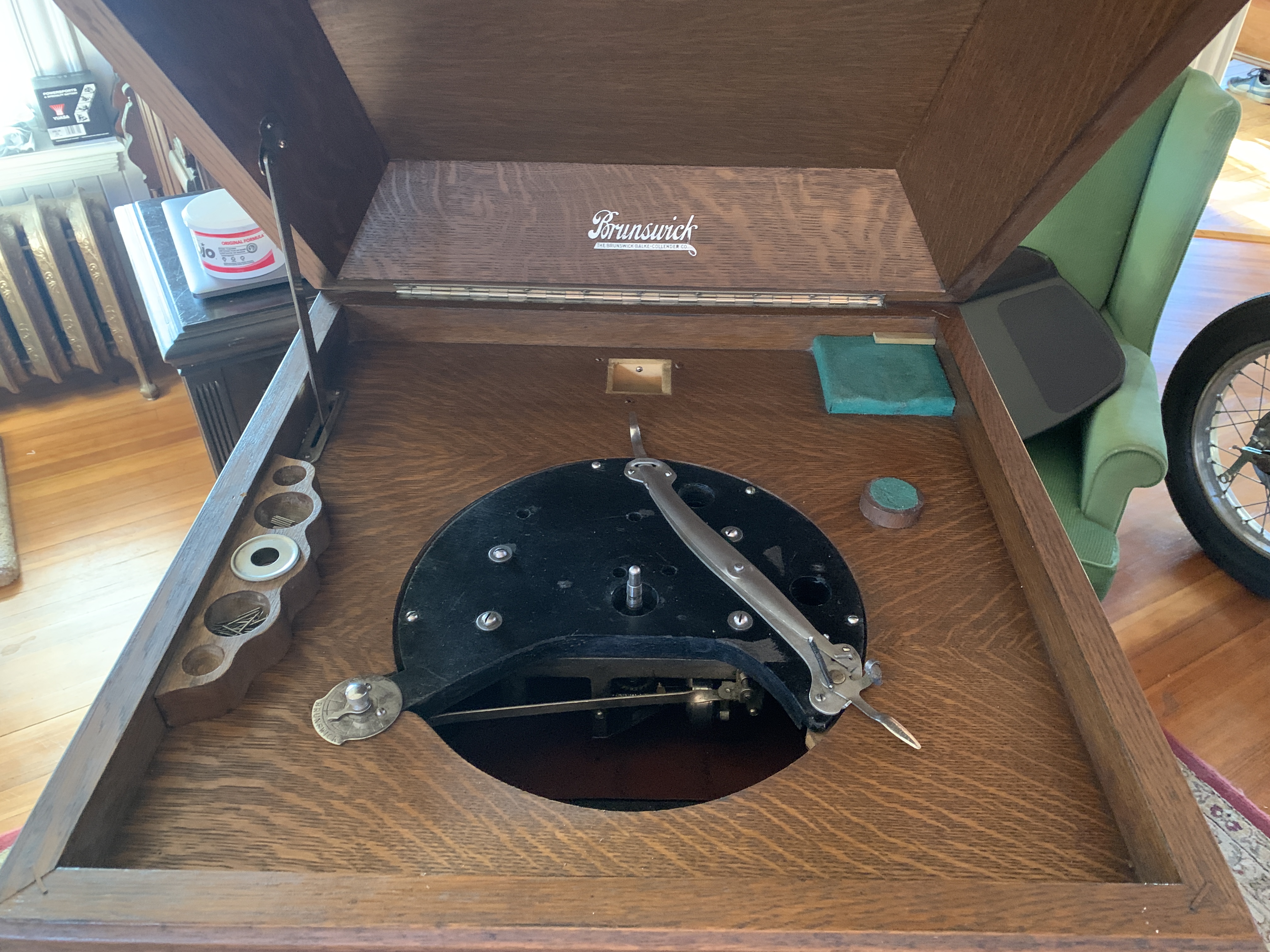 Got to work on cleaning up the cabinet and internals with GoJo, haven't hit it with the Feed-n-Wax yet. Got the barrels cleaned up, springs replaced (yeah, both of them, brittle as all heck). It's amazing the amount of grease and dried graphite that was literally covering this motor. I just can't imagine these came from the factory this way. Check out the difference between one door cleaned with GoJo and #0000 steel wool and the other untouched door. It's even more dramatic in person. I'll do some more today, just waiting on a lead for a tone-arm...